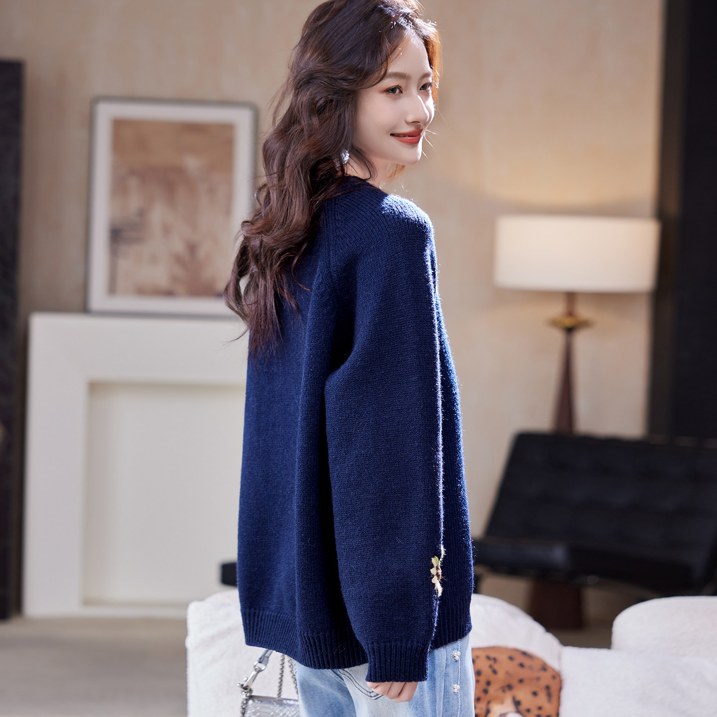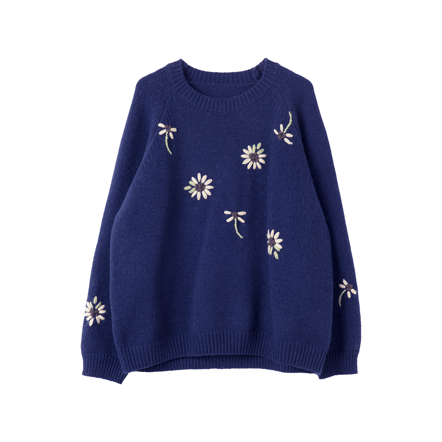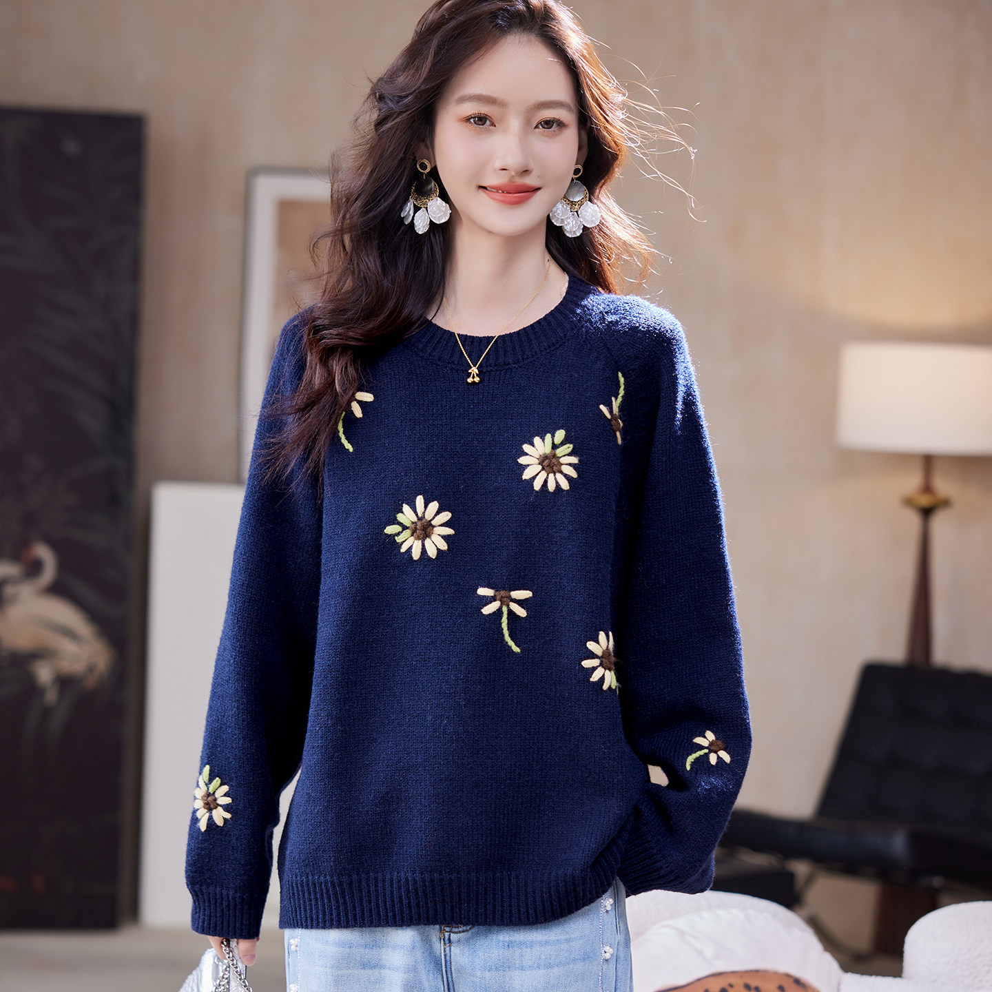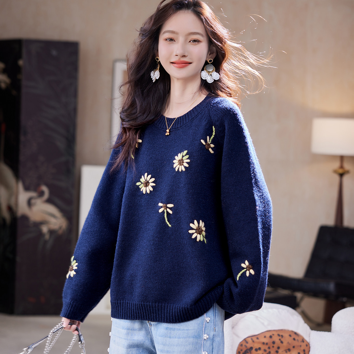 宝诗黎圆领刺绣慵懒针织毛衣2026早春新款宽松休闲百搭洋气女装