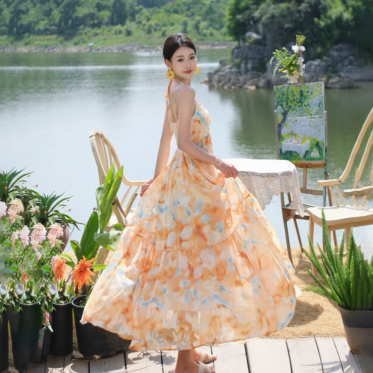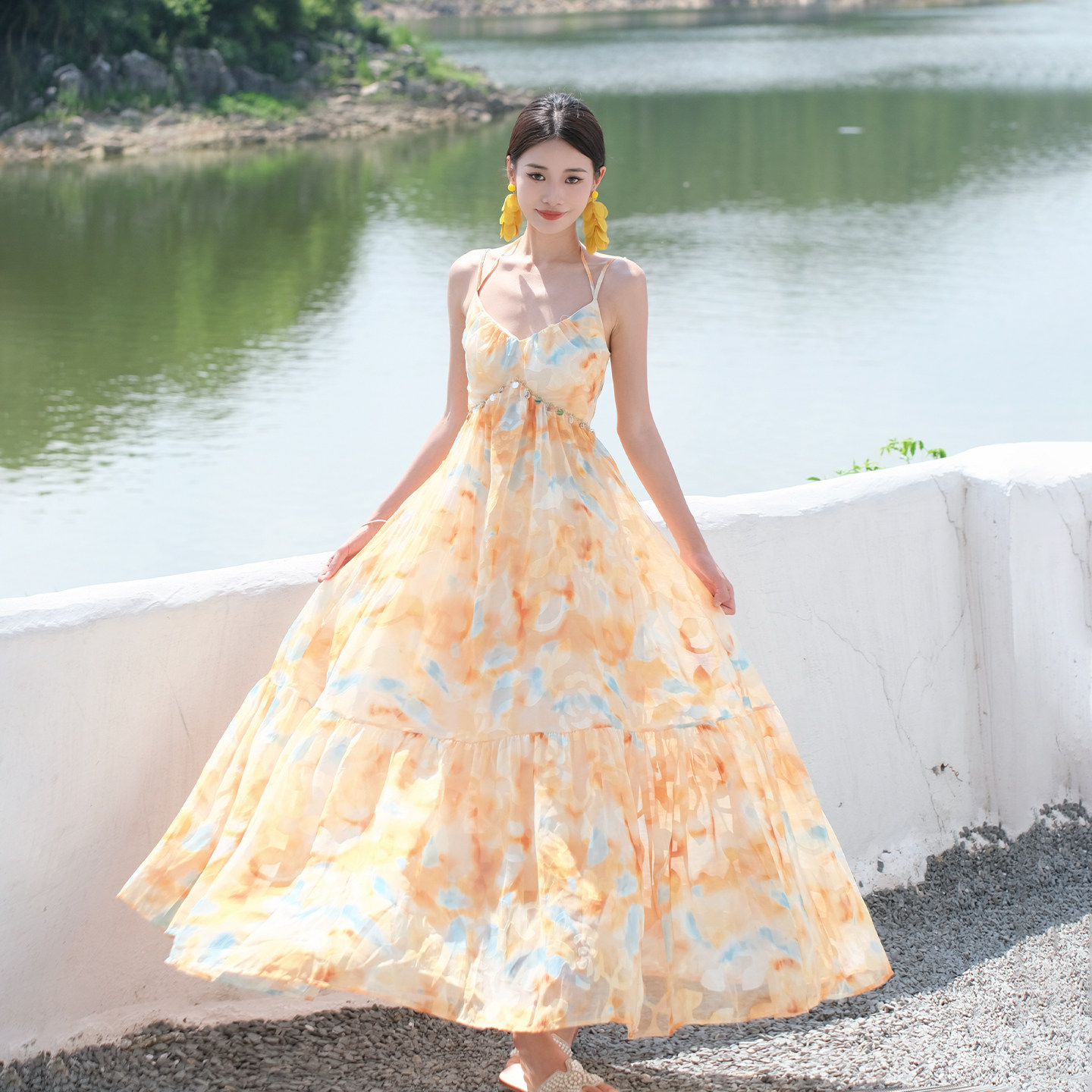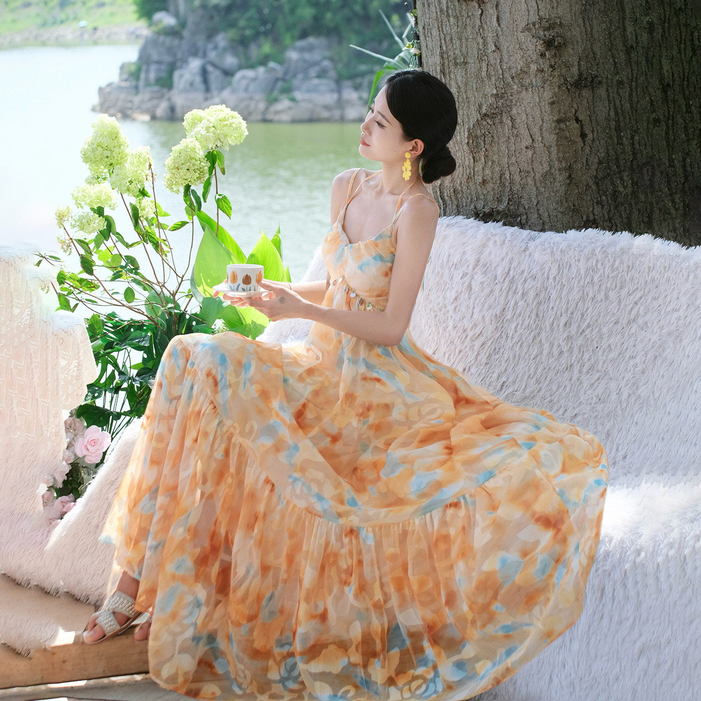 海边度假绝美海岛沙滩裙法式复古黄色碎花收腰吊带超仙连衣裙长裙