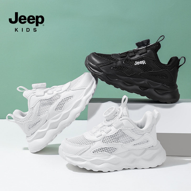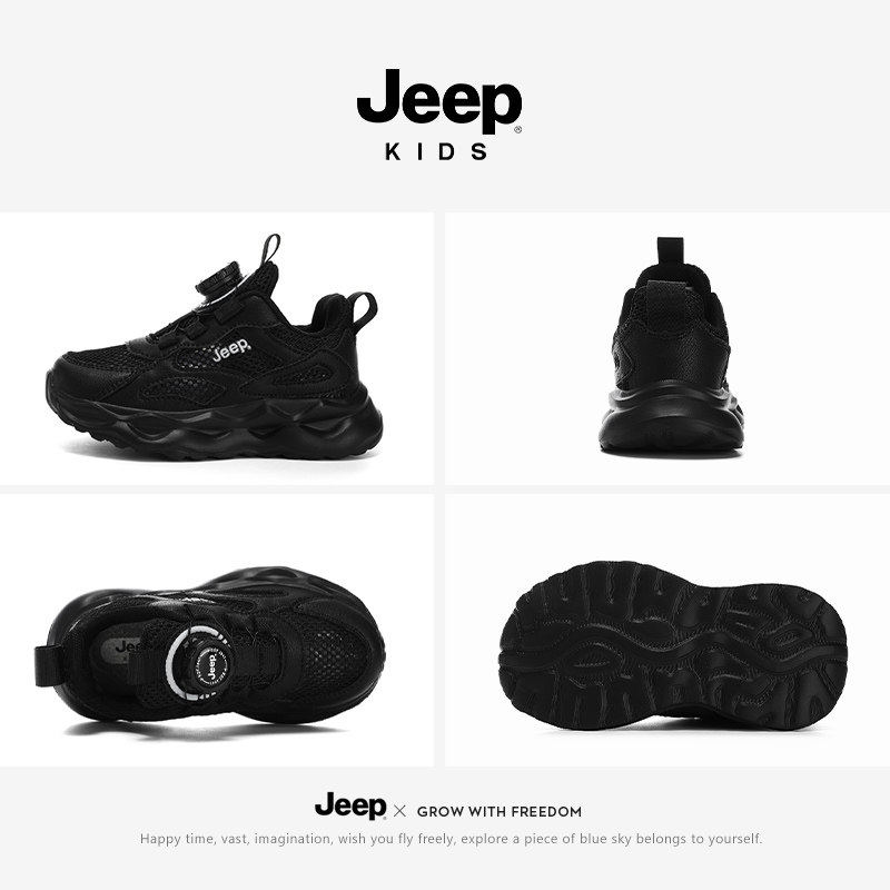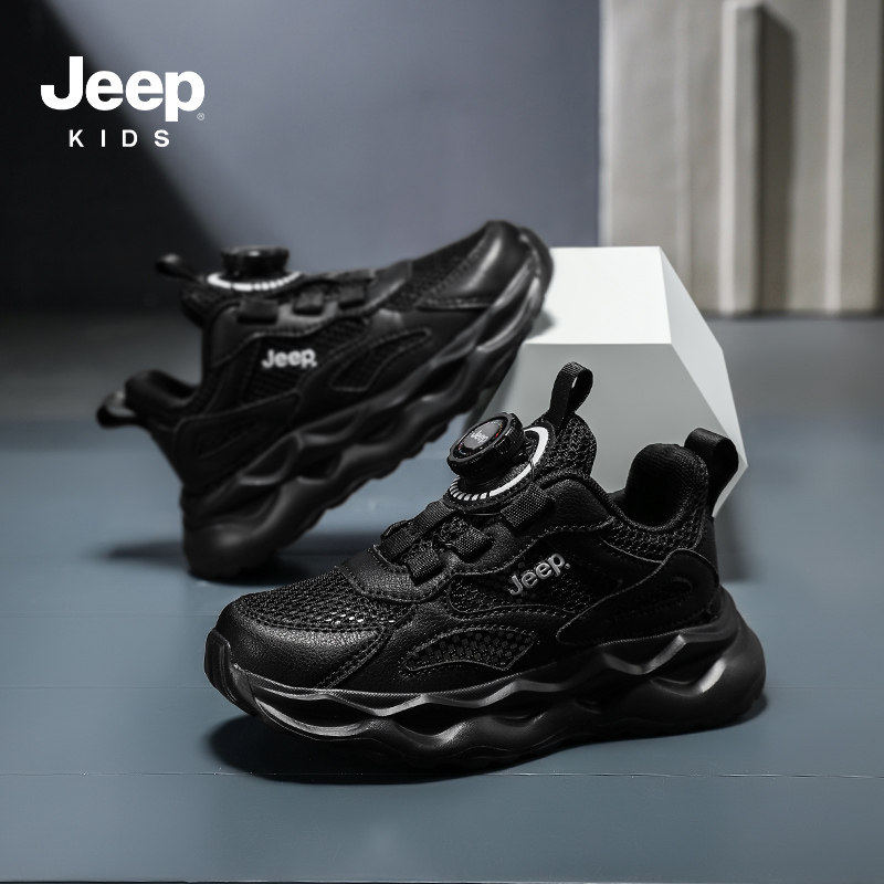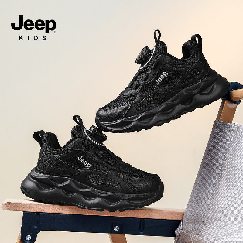 Jeep童鞋儿童运动鞋夏季鞋子单网眼透气旋钮扣男童女童黑色跑步鞋