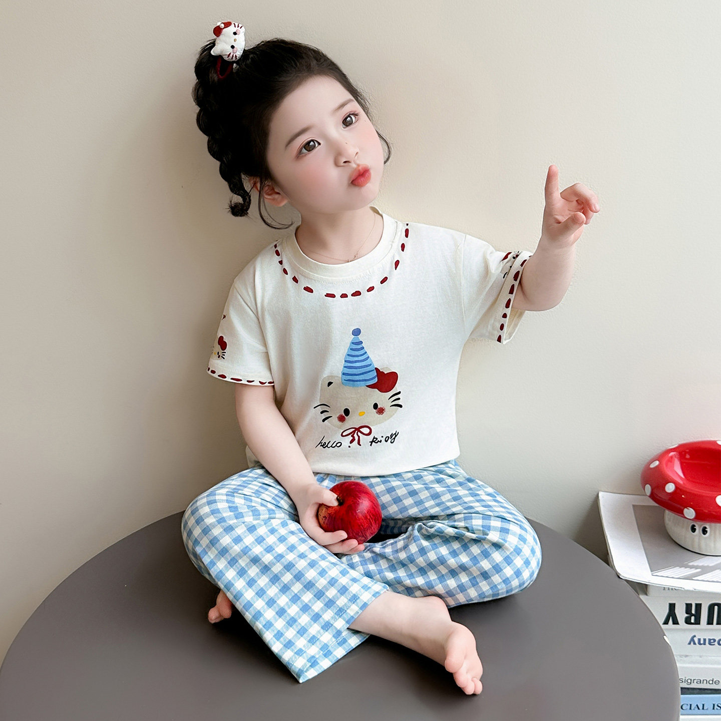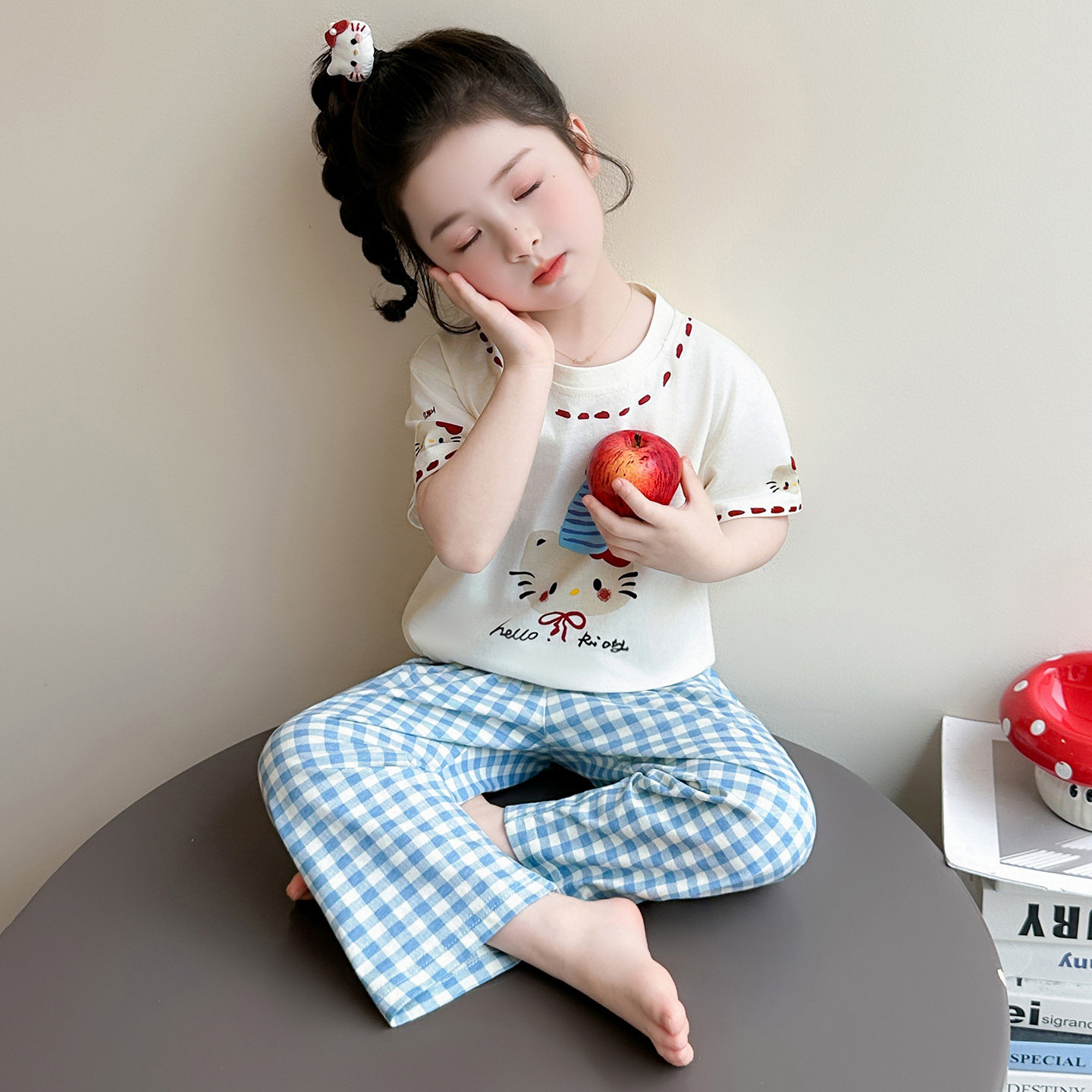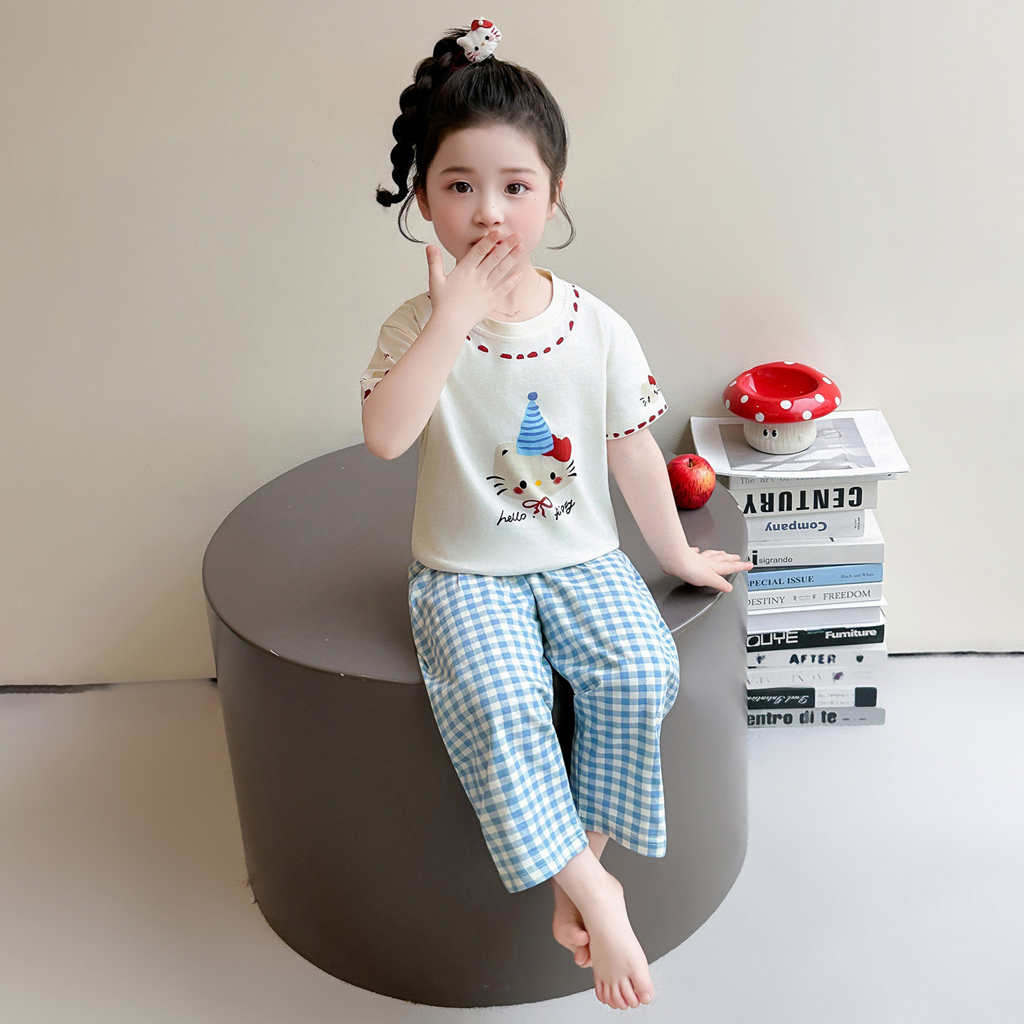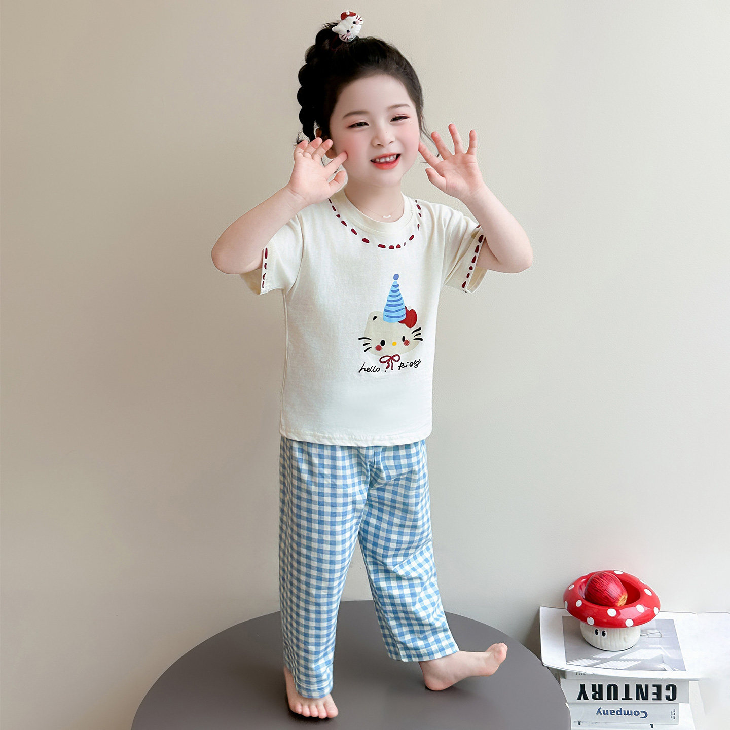 女童睡衣套装春夏季空调房儿童短袖长裤蓝色纯棉格子裤KT猫家居服