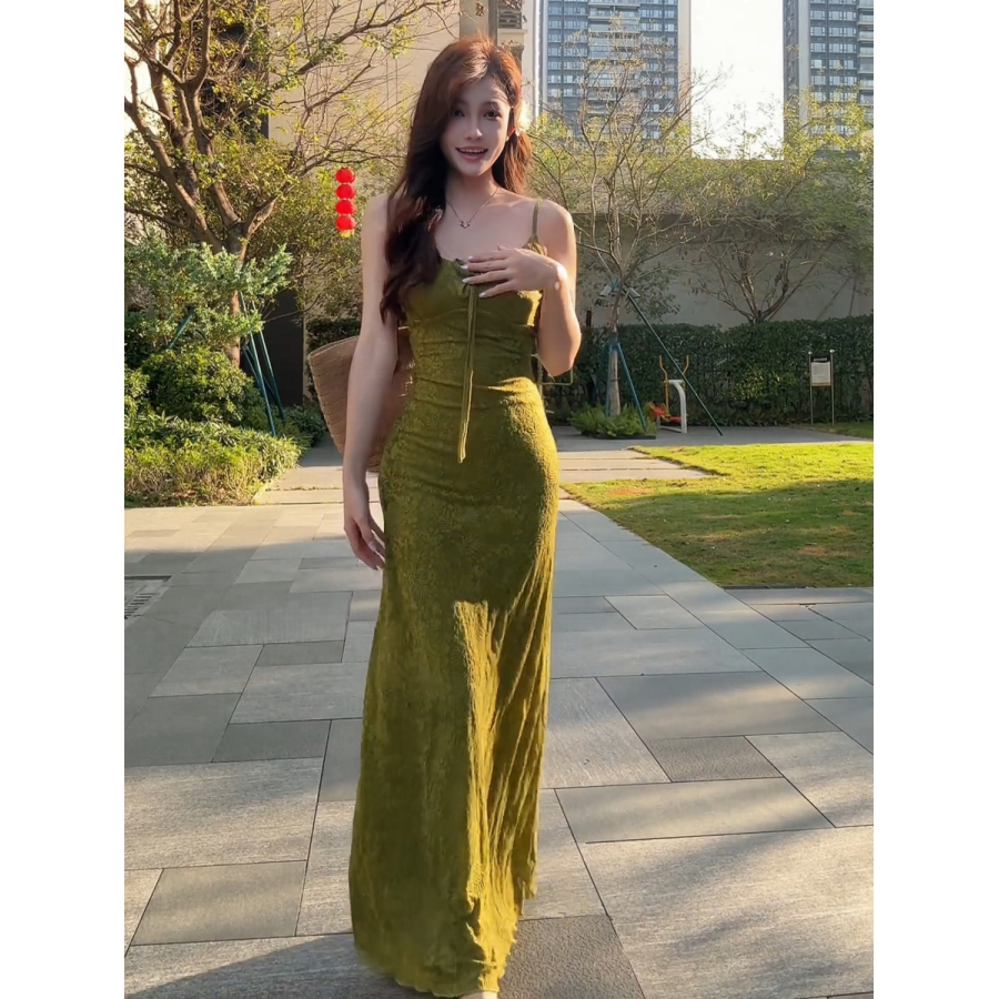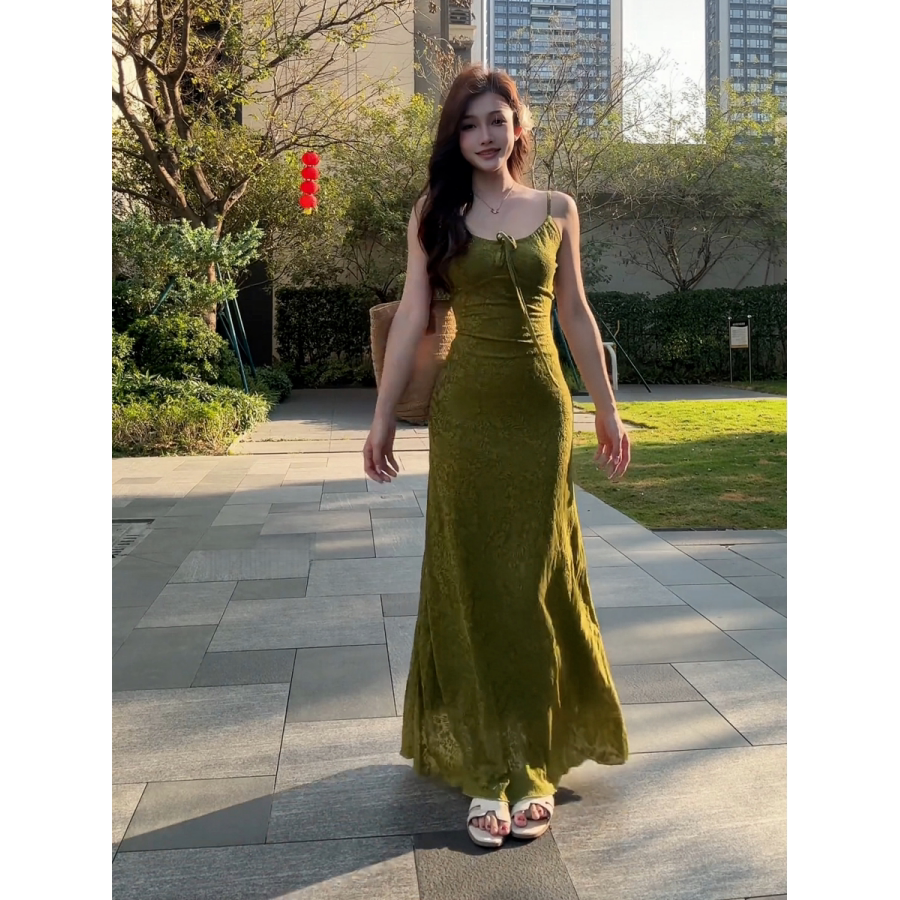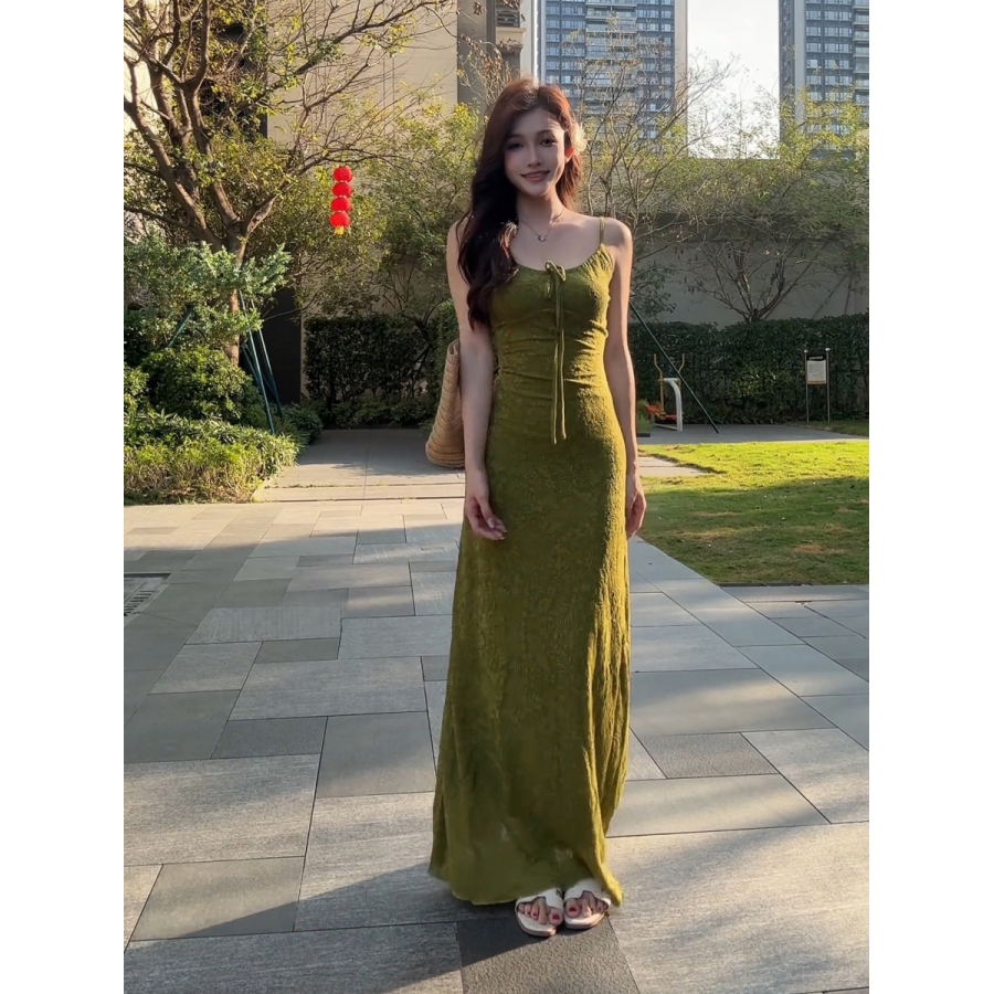 大码胖MM法式复古蝴蝶结系带收腰显瘦吊带连衣裙夏季新款绝美长裙