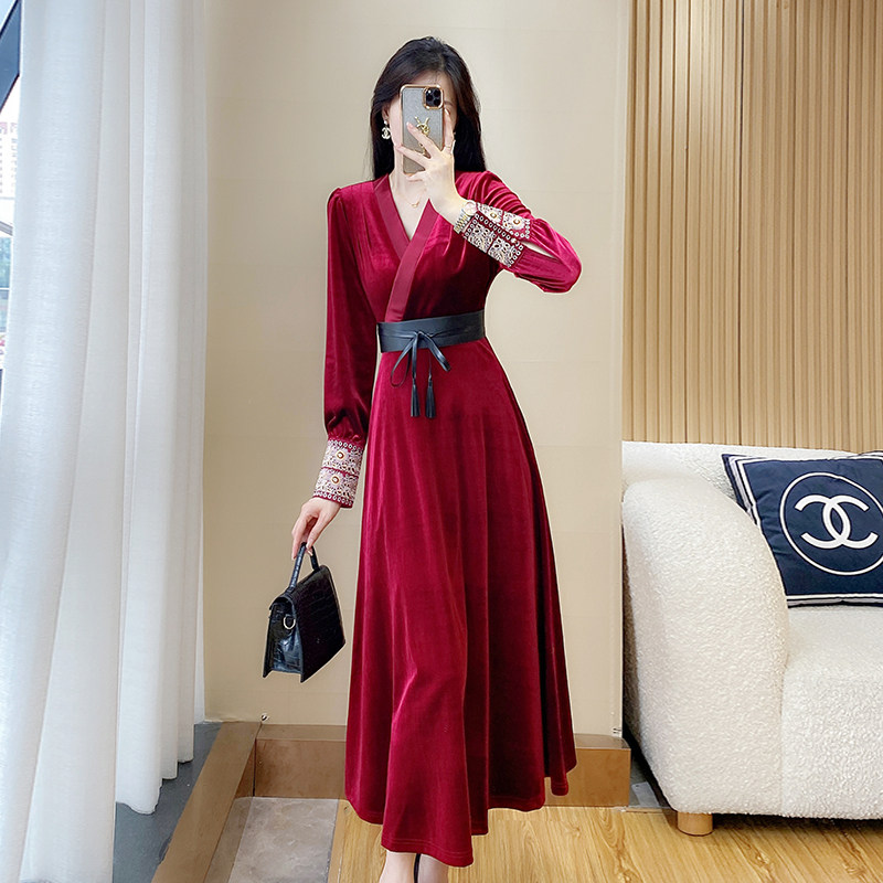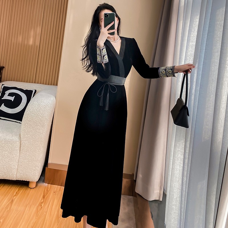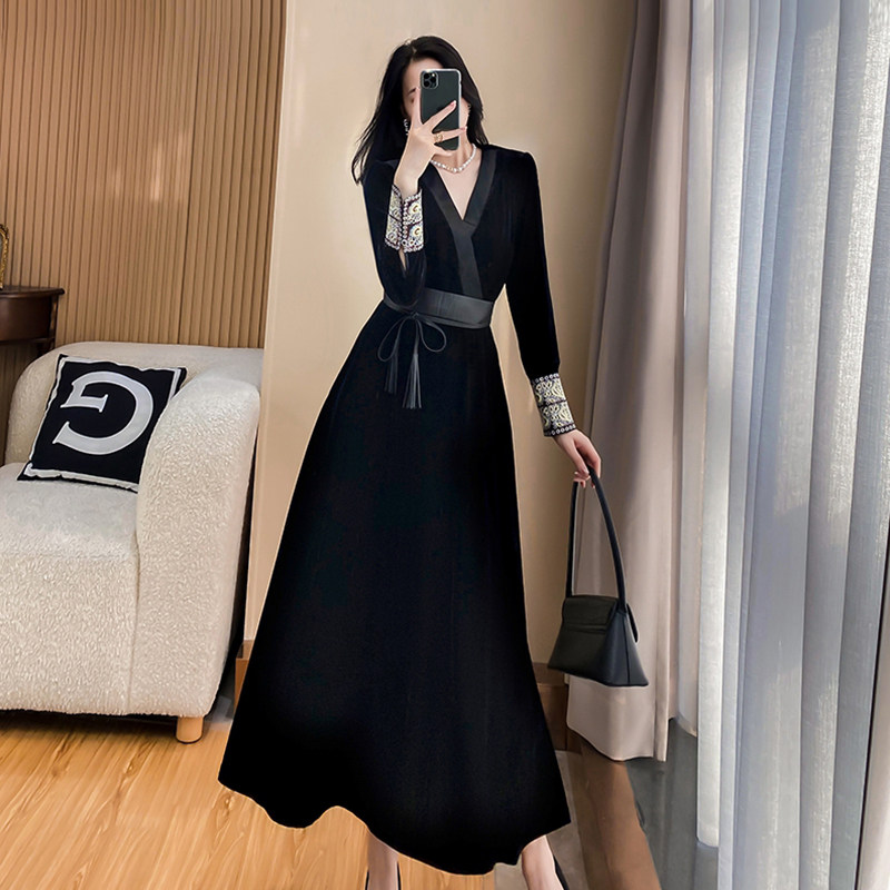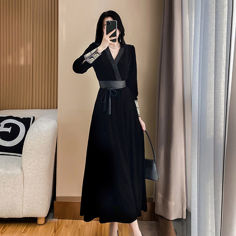 法式黑色金丝绒连衣裙女秋冬季新款奢华高端轻奢气质显瘦收腰长裙