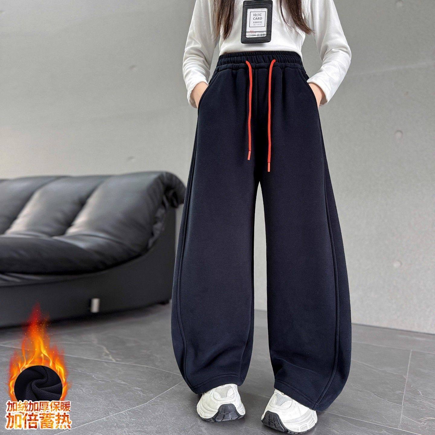 女童加绒运动裤秋冬装大童韩版洋气阔腿裤女孩加厚卫裤初中生裤子