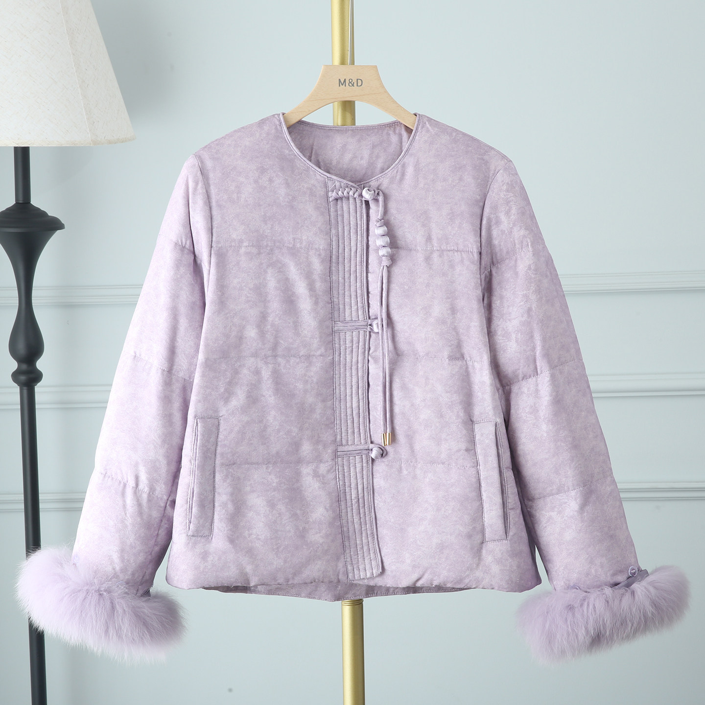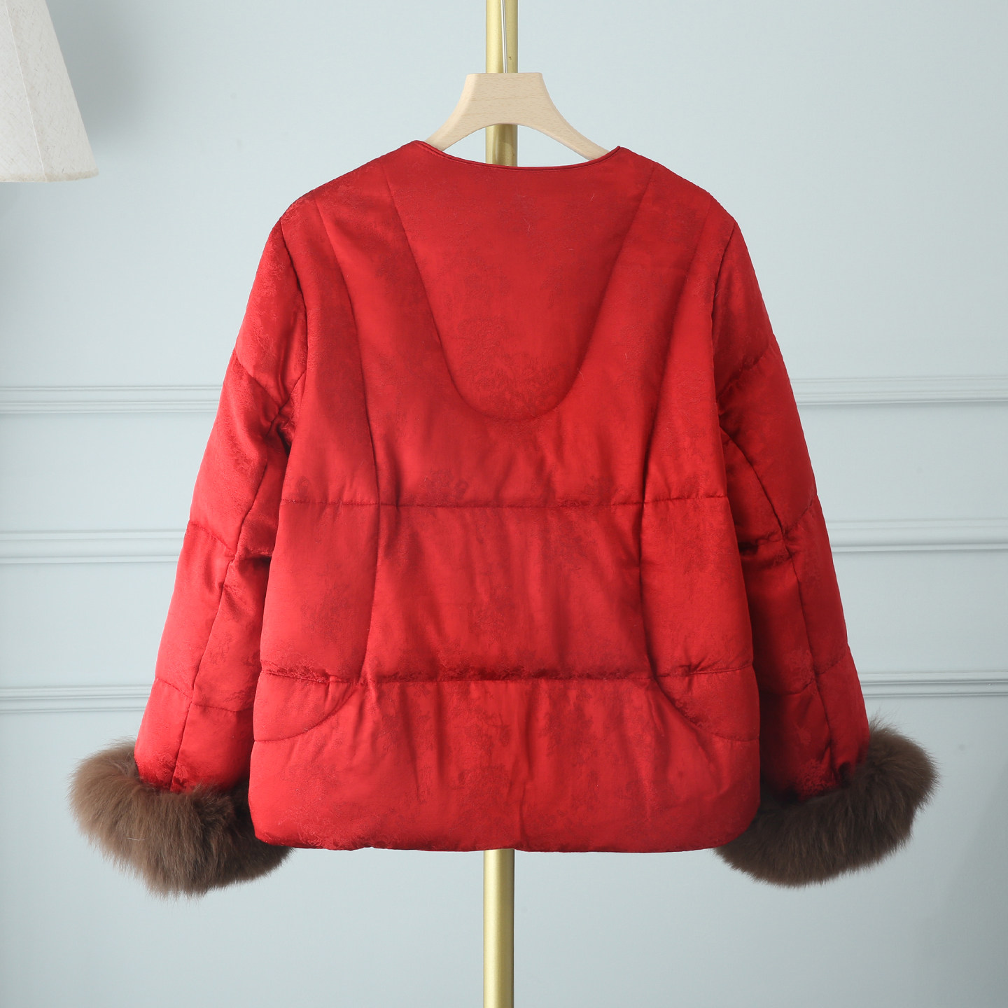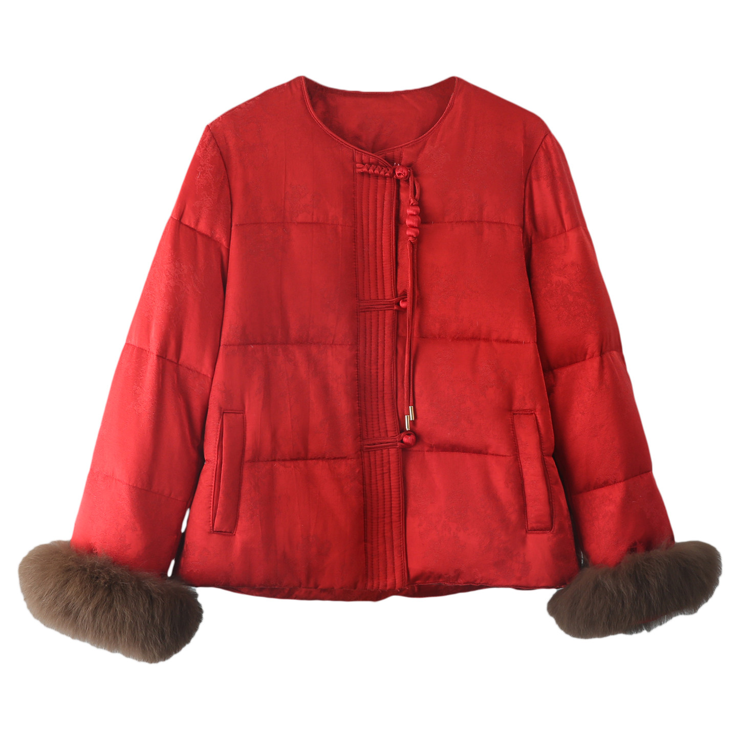 红色新中式国风无领羽绒服女2026冬新款毛领拼接可拆卸袖子外套