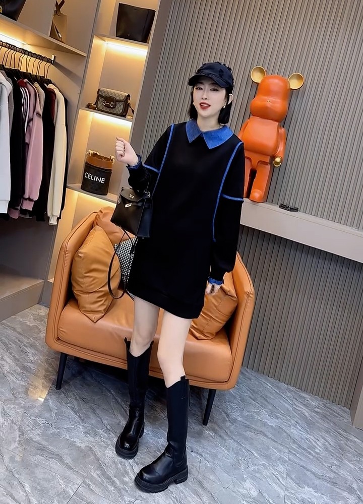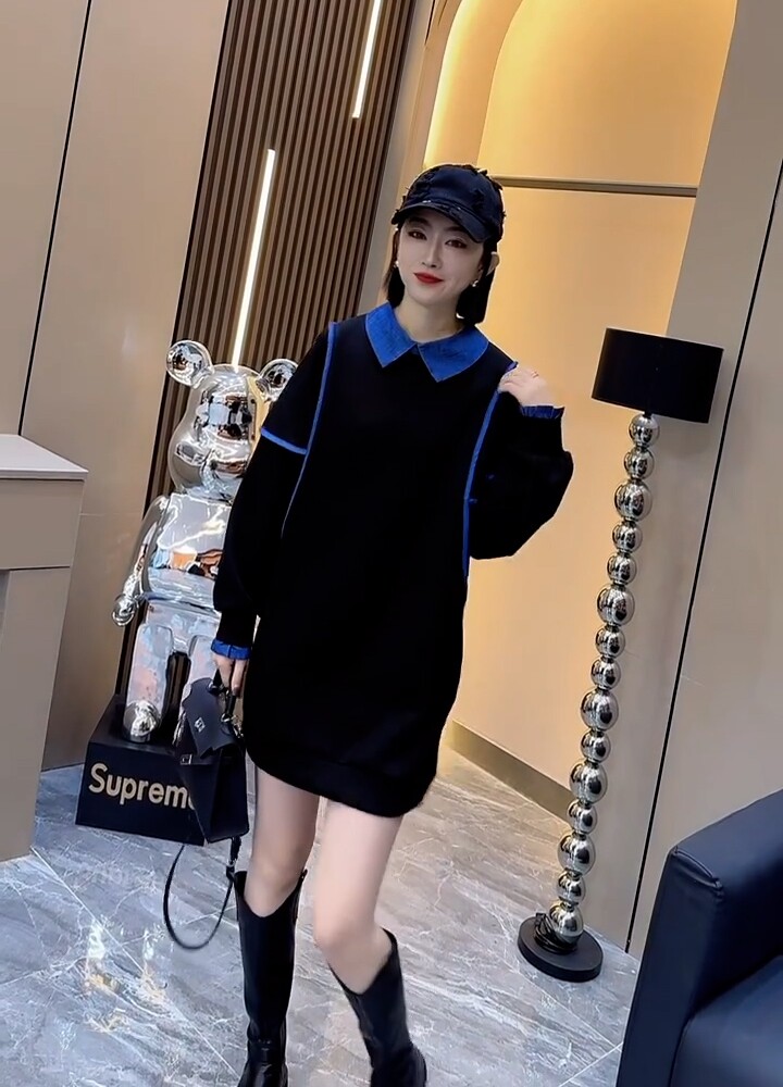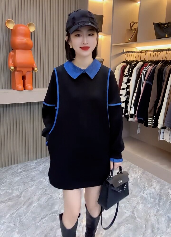 欧洲站2025冬装新款拼色娃娃领拼接翻领纯棉卫衣女中长款宽松上衣