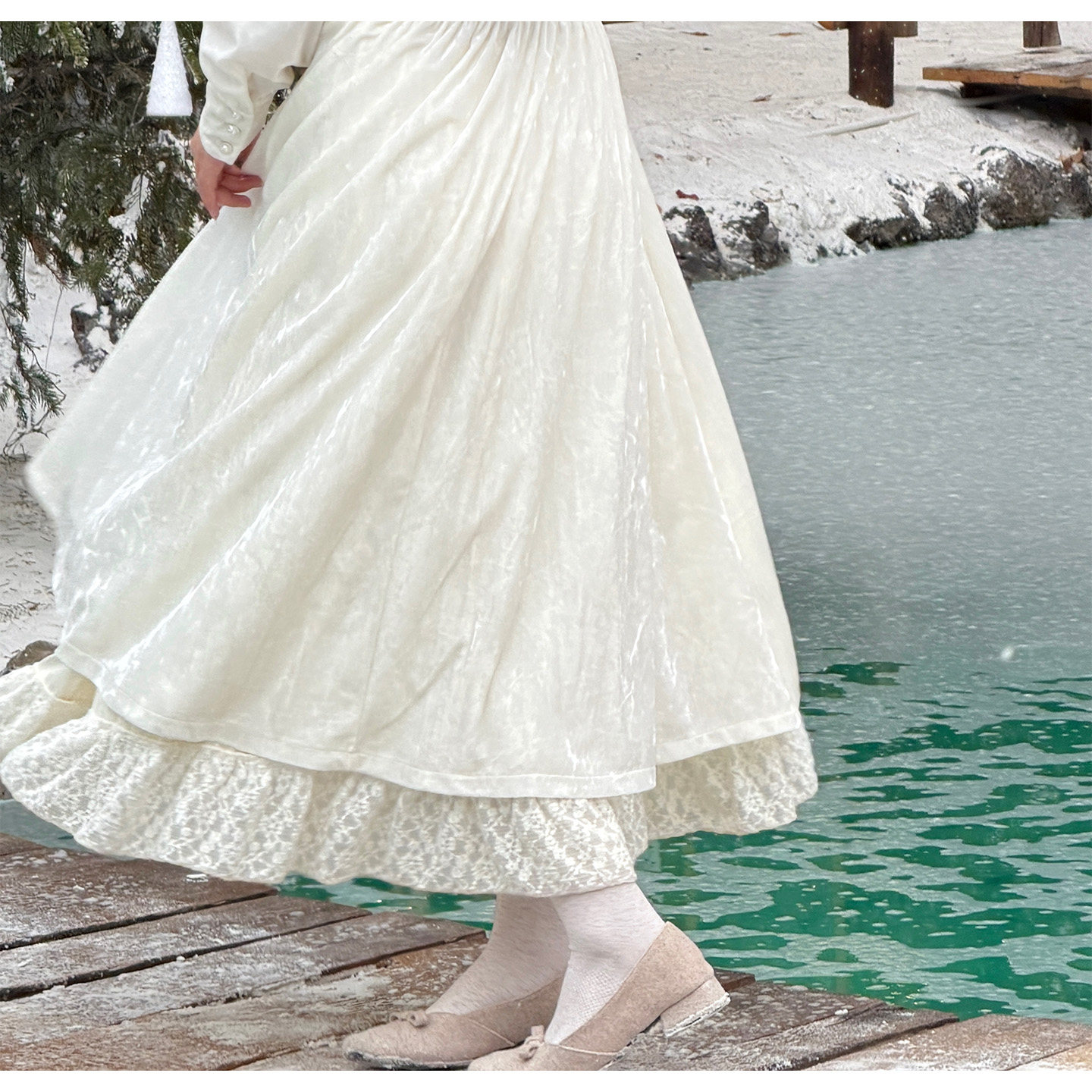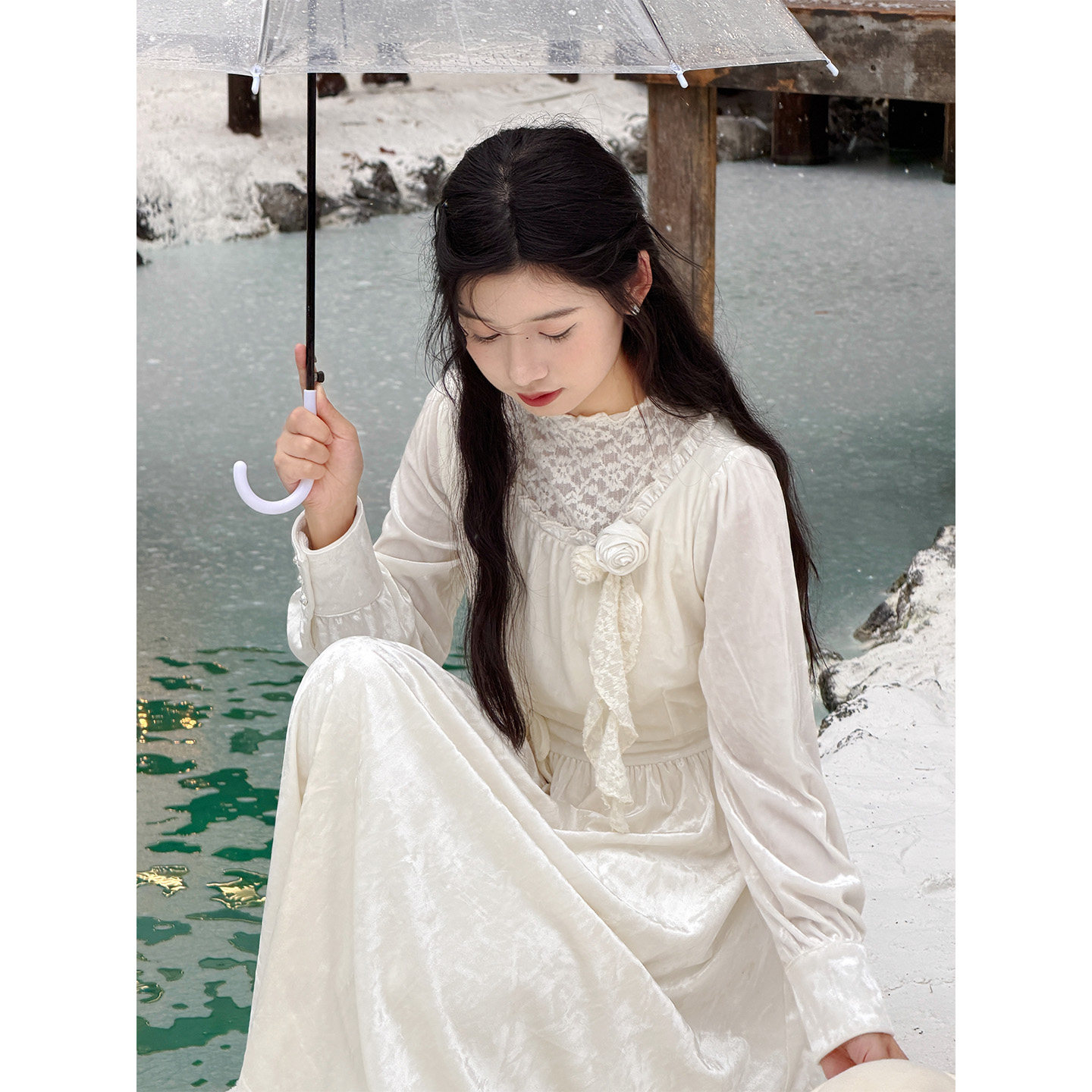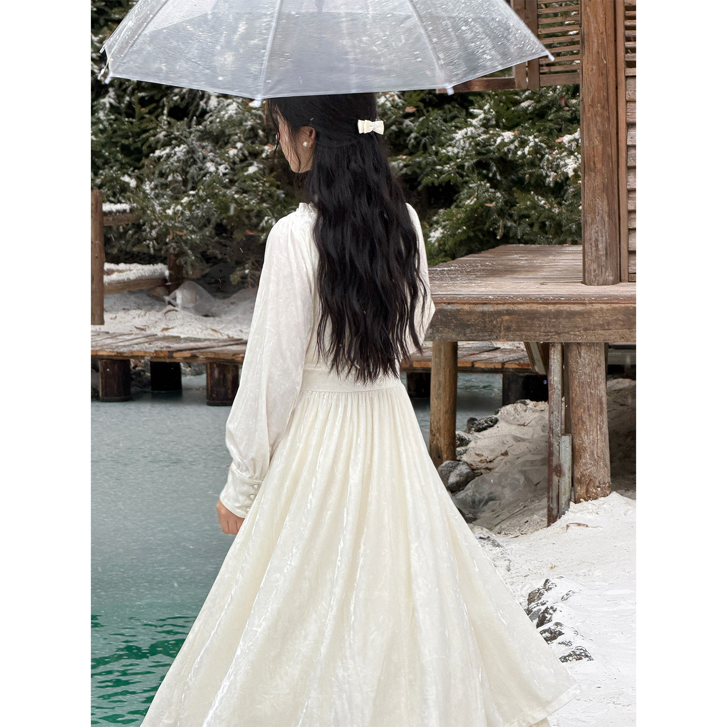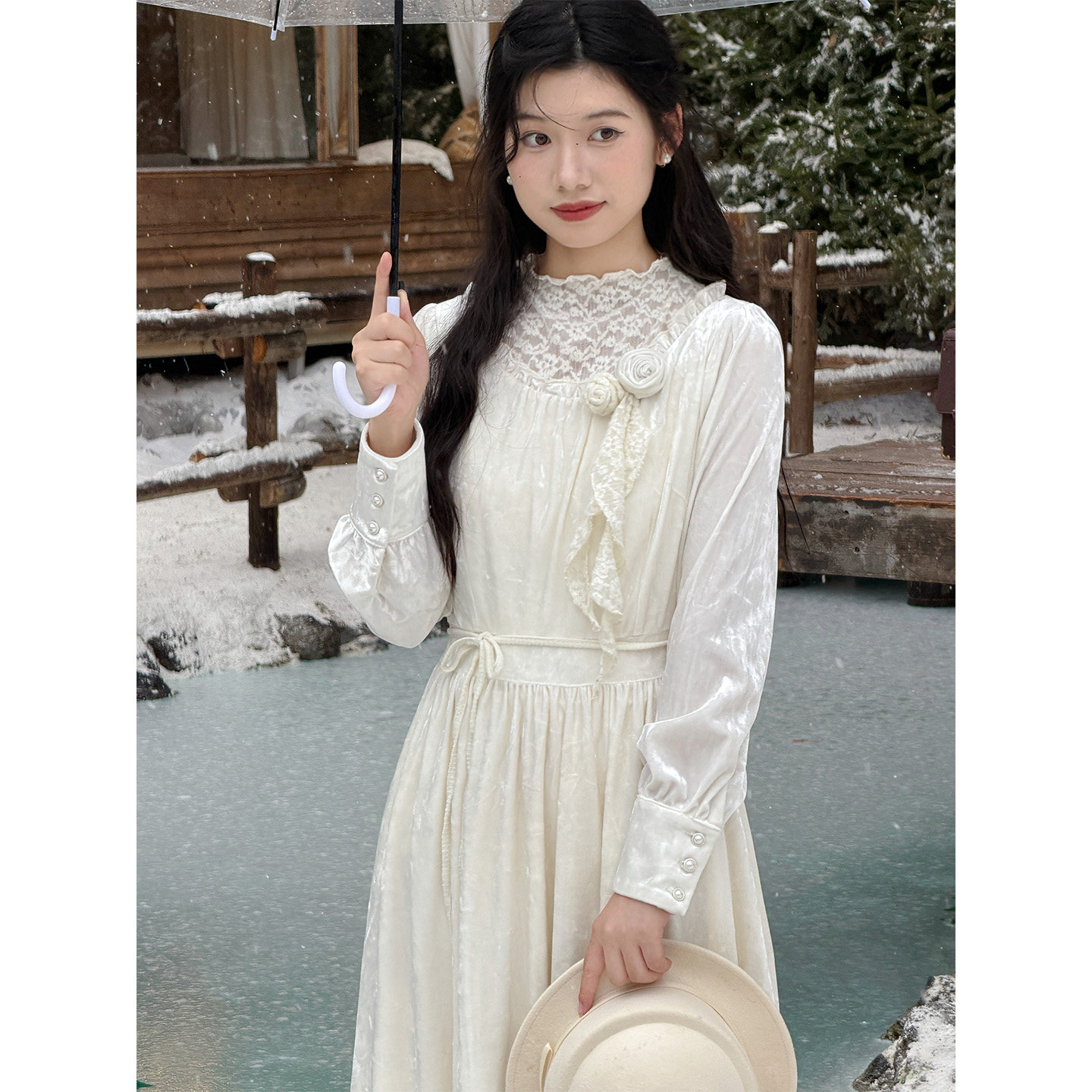 七与珍珠 “暮雪” 复古千金优雅杏色长袖钻石绒收腰长款连衣裙