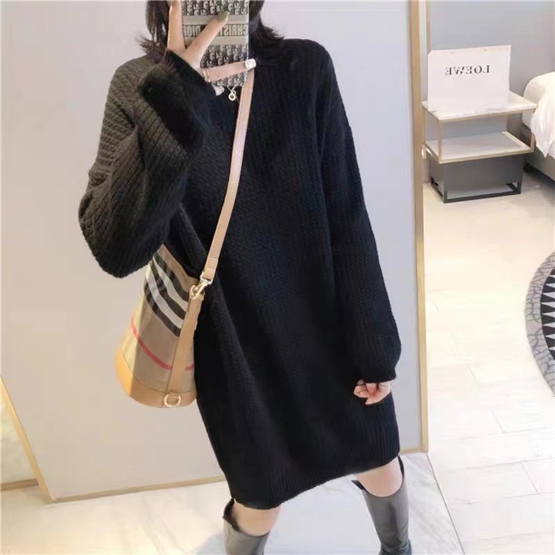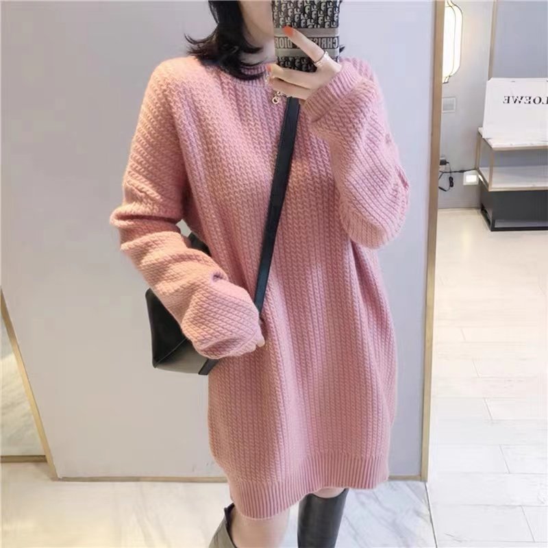 显白粉宽松大码针织连衣裙女中长款加厚韩版秋冬新款毛衣裙羊毛