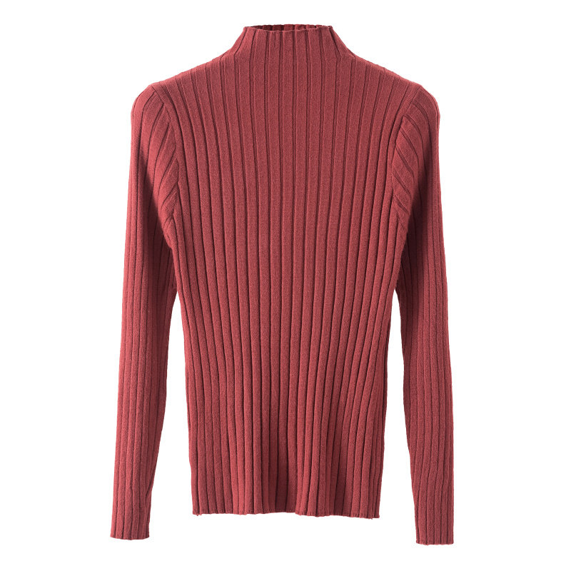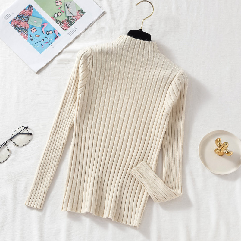 半高领针织打底衫女长袖上衣2023秋冬装新款修身短款坑条套头毛衣
