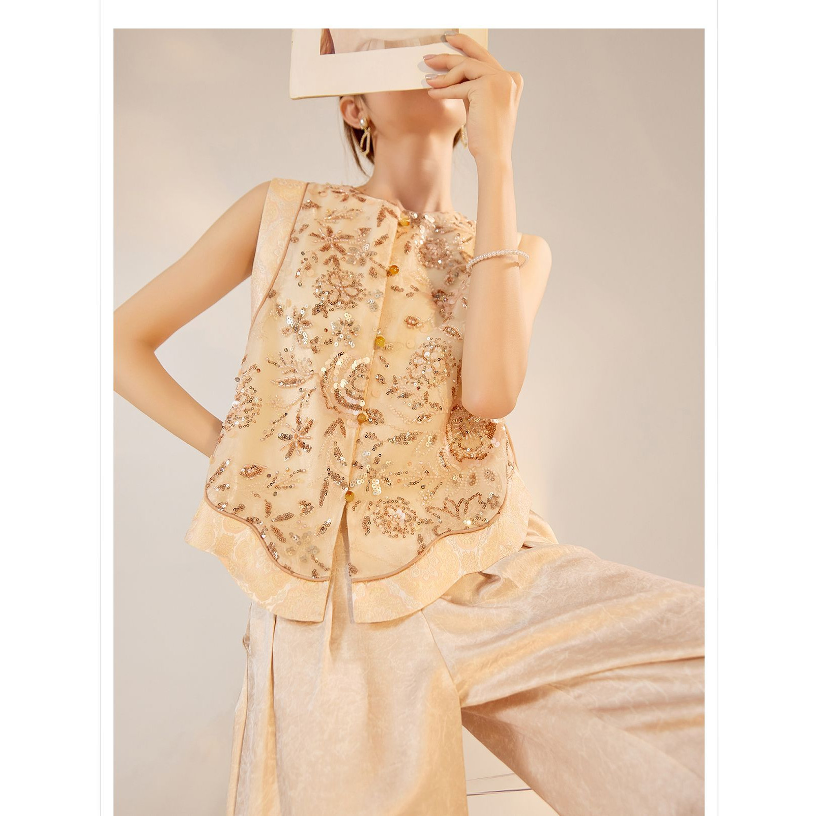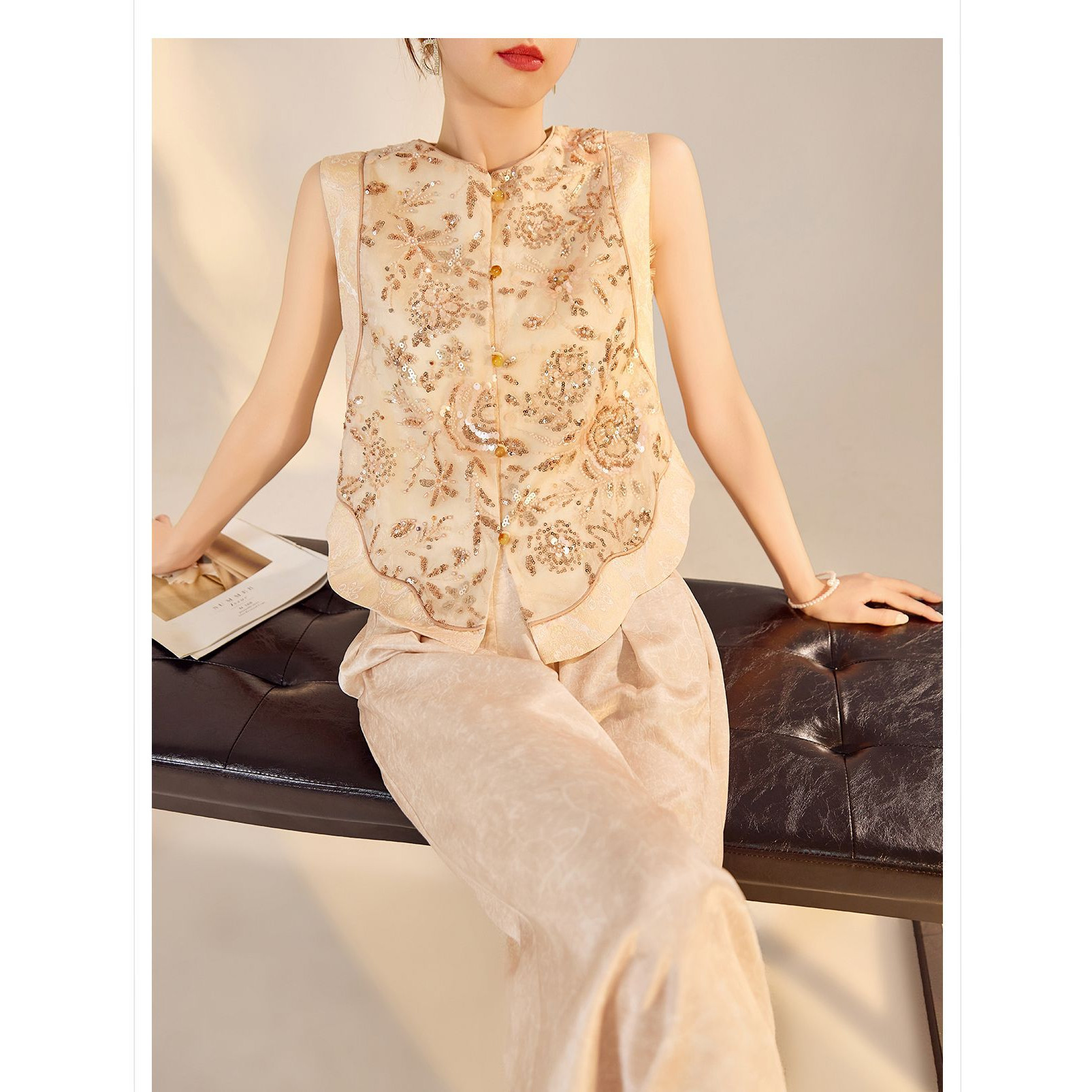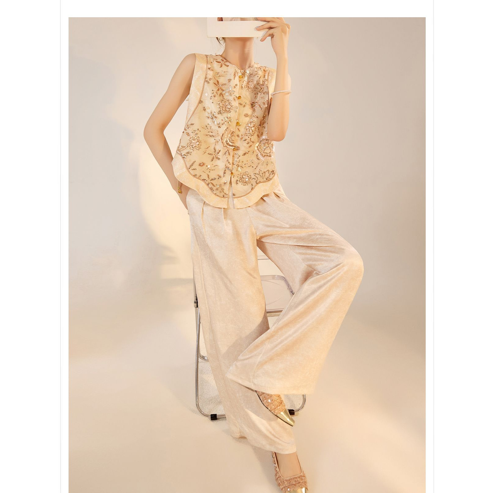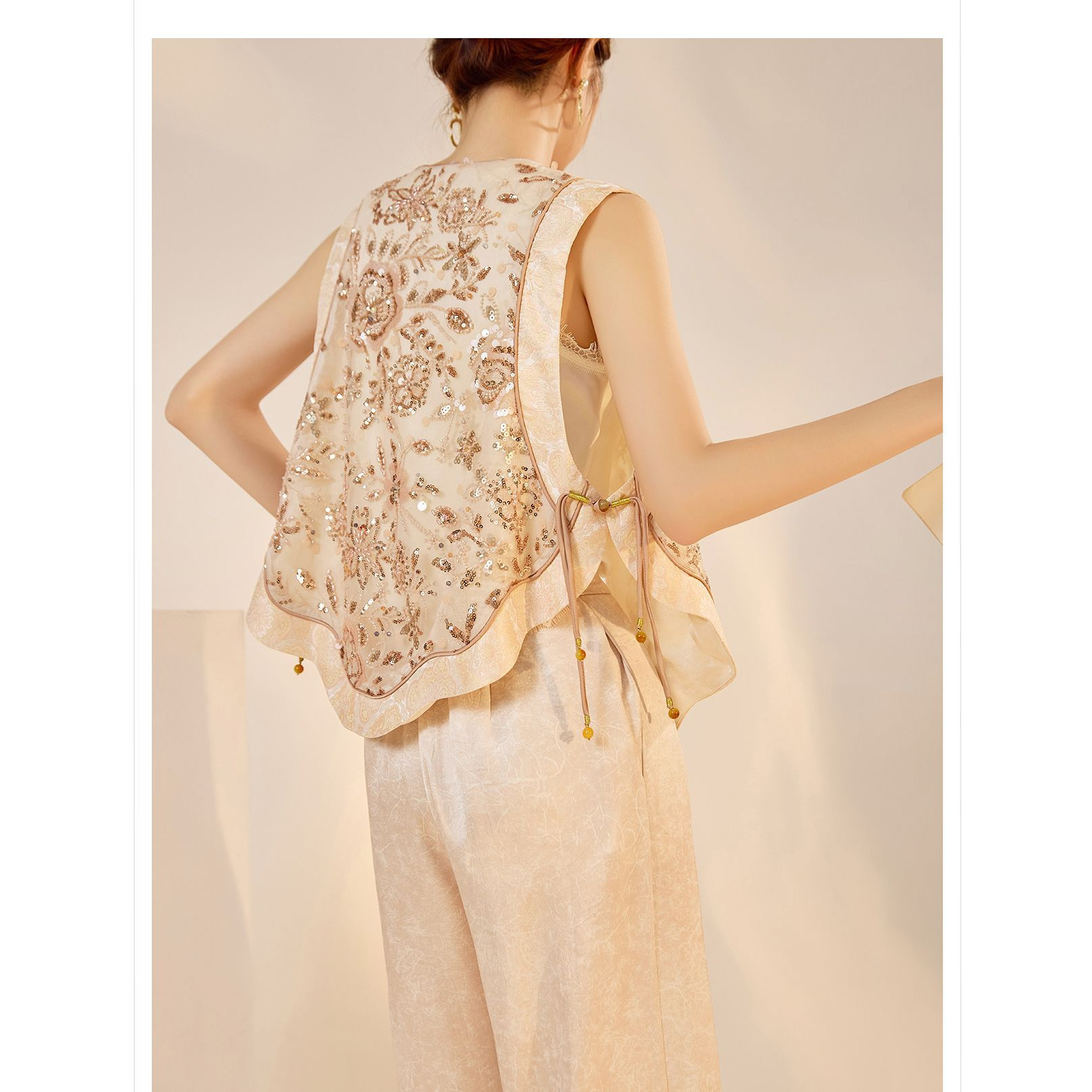 2026春装新款 轻奢新中式国风亮片刺绣马甲外套鱼尾半裙长裤套装