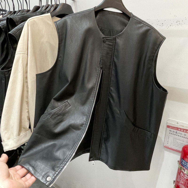 欧货宽松大版圆领PU皮衣马甲外套女2026新款春装休闲无领坎肩上衣