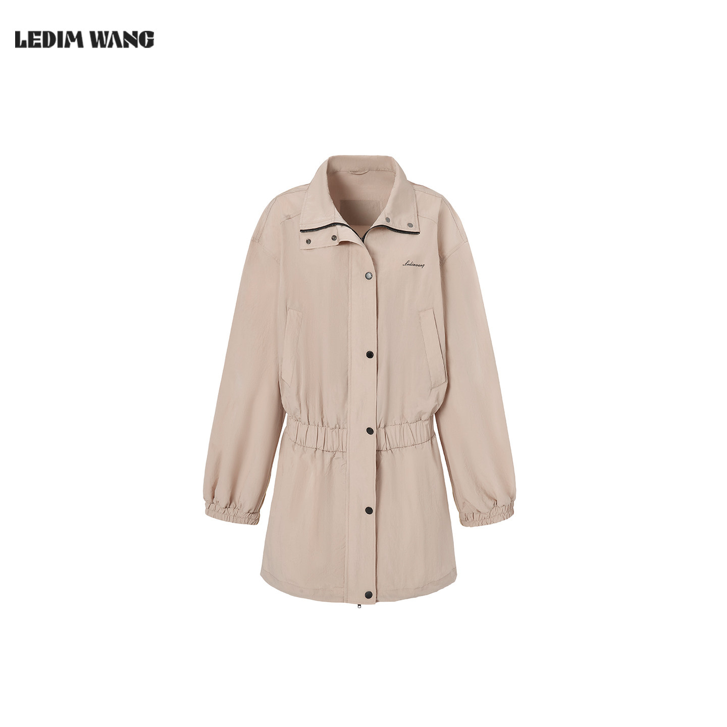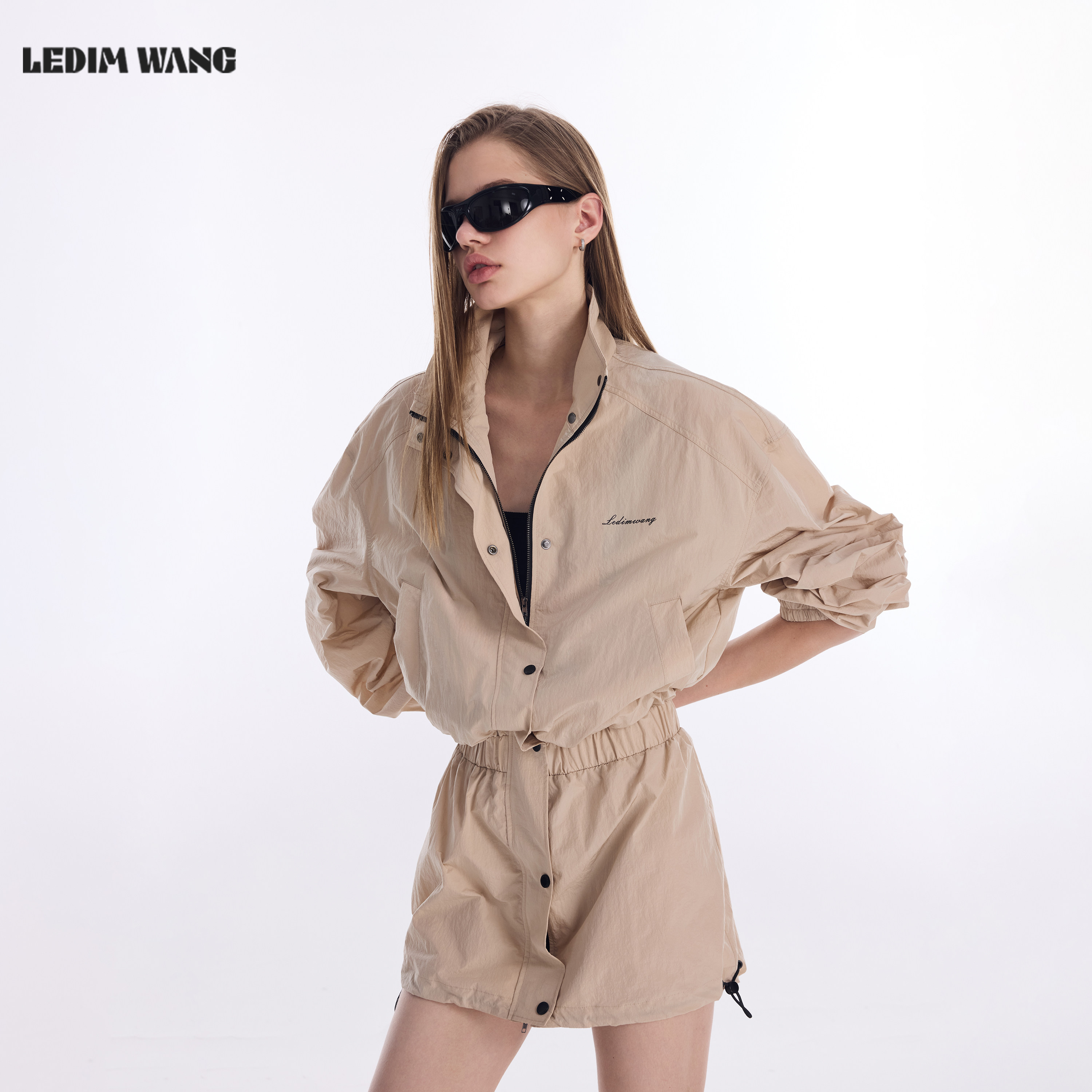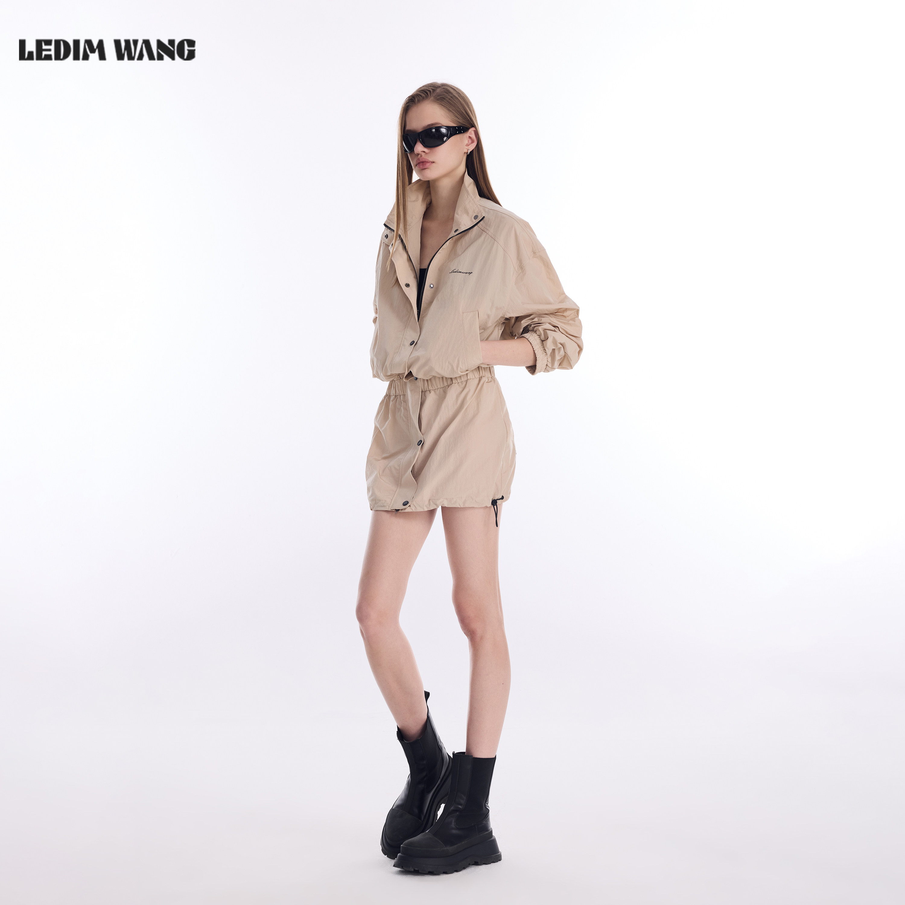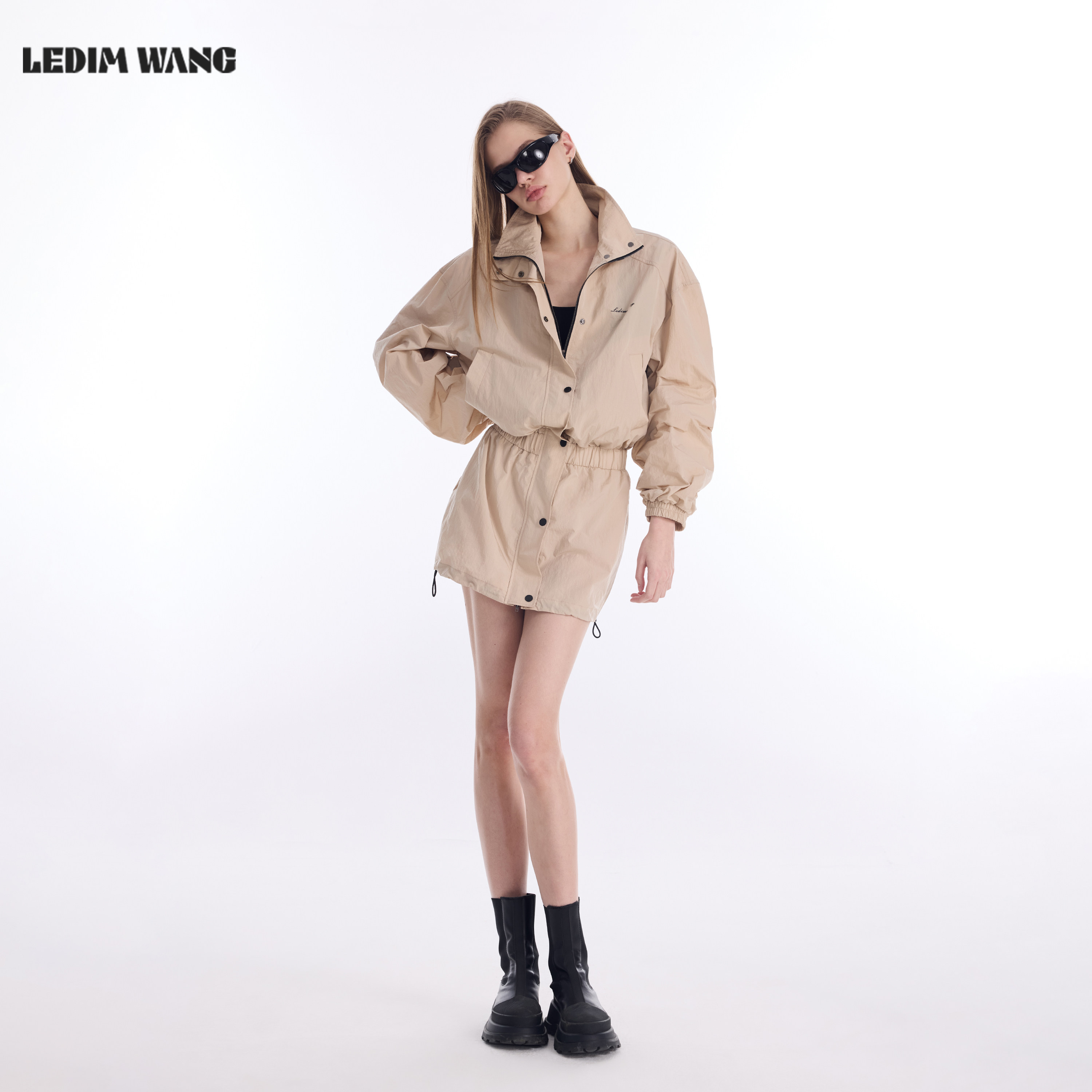 LEDIM WANG户外收腰长袖连衣裙女2026春新款卡其色机能风抽绳短裙