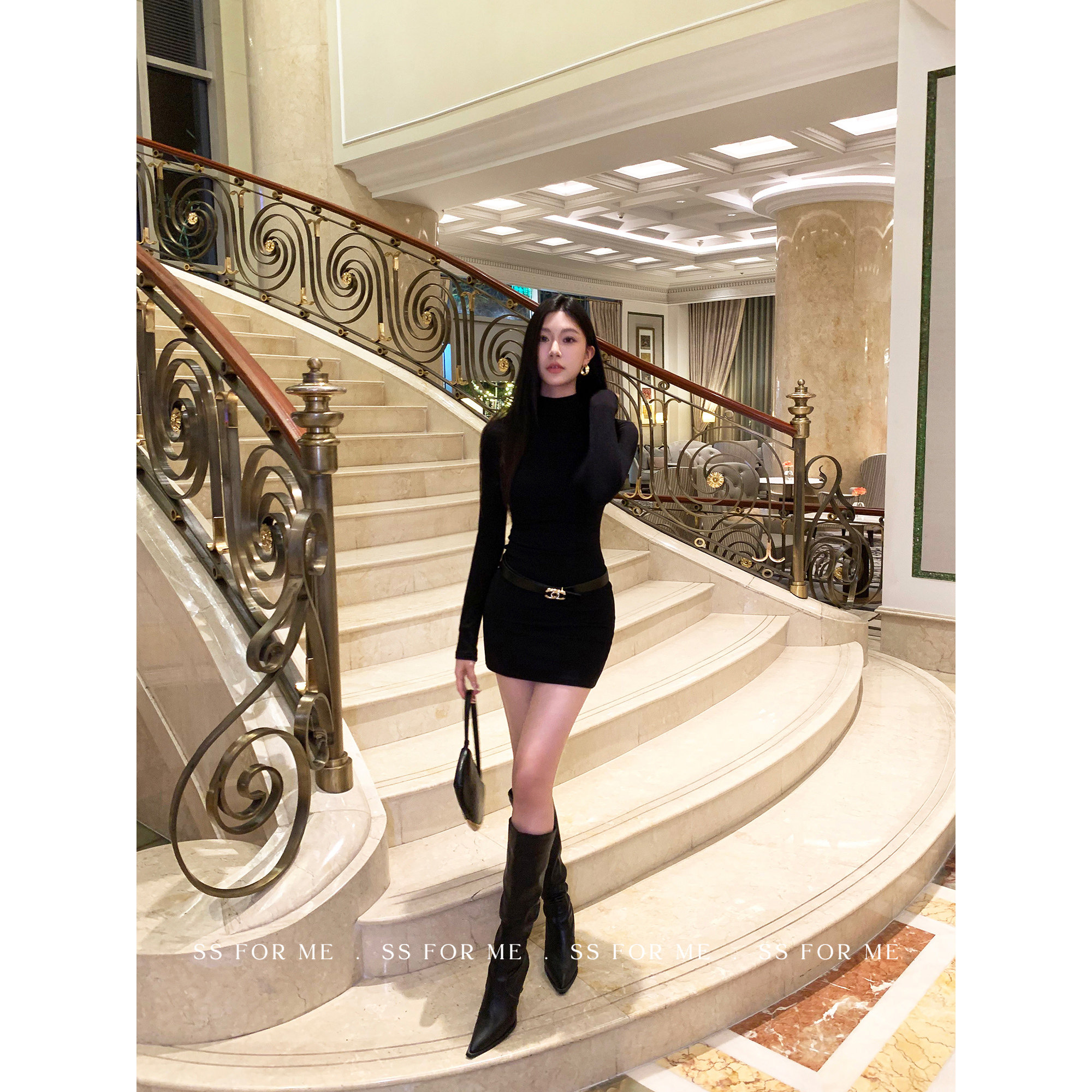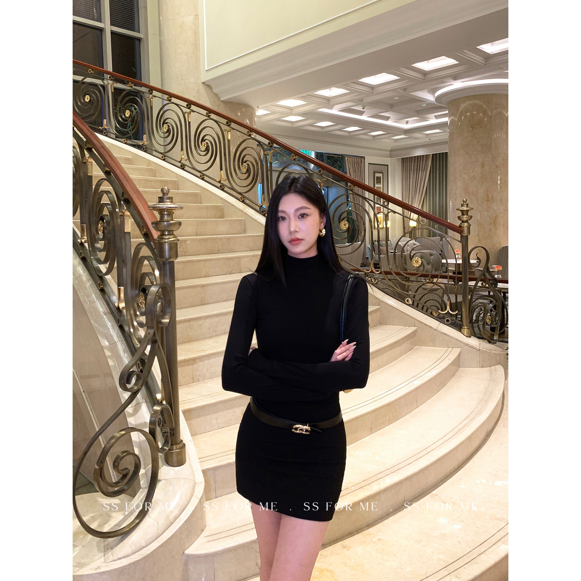 SS for me 墨黑蔷薇 黑色半高领长袖针织连衣裙女修身包臀短裙