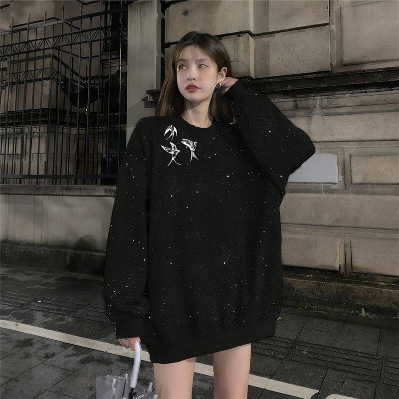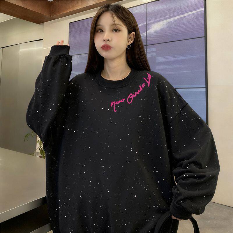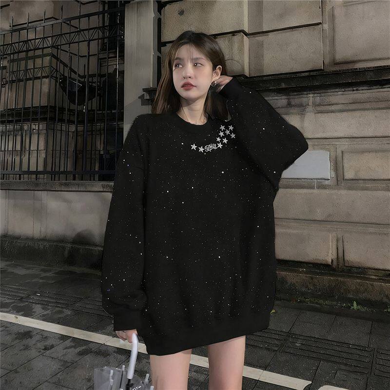 潮牌小众中长款时尚韩版气质风满天星亮片卫衣长袖女款秋冬季上衣