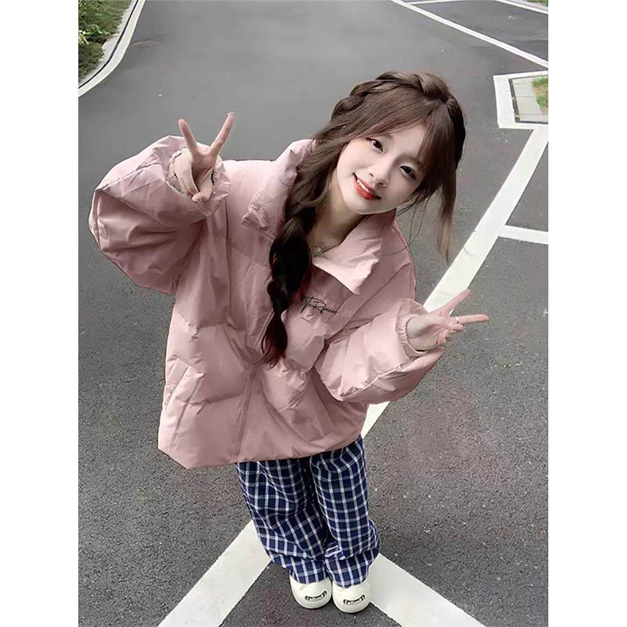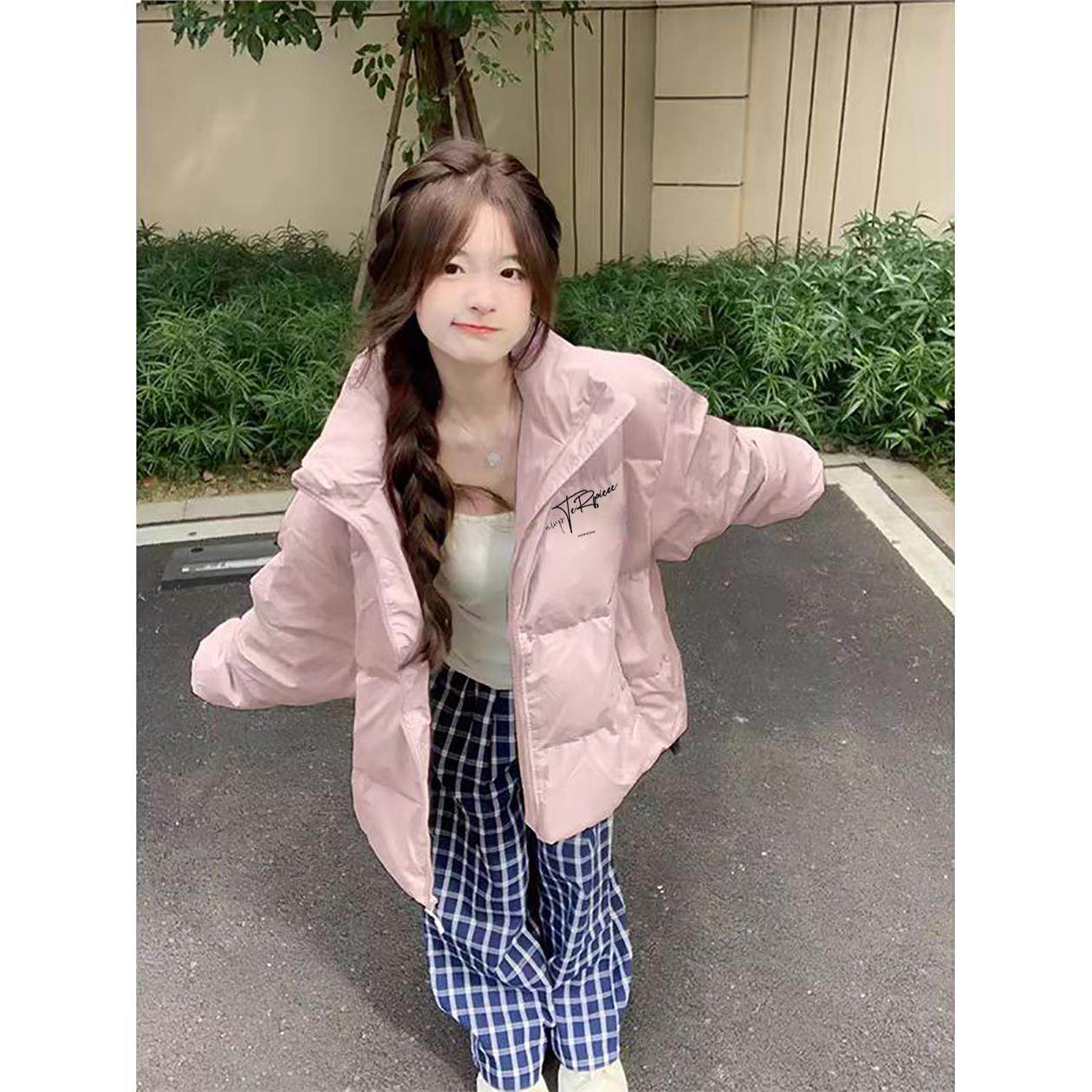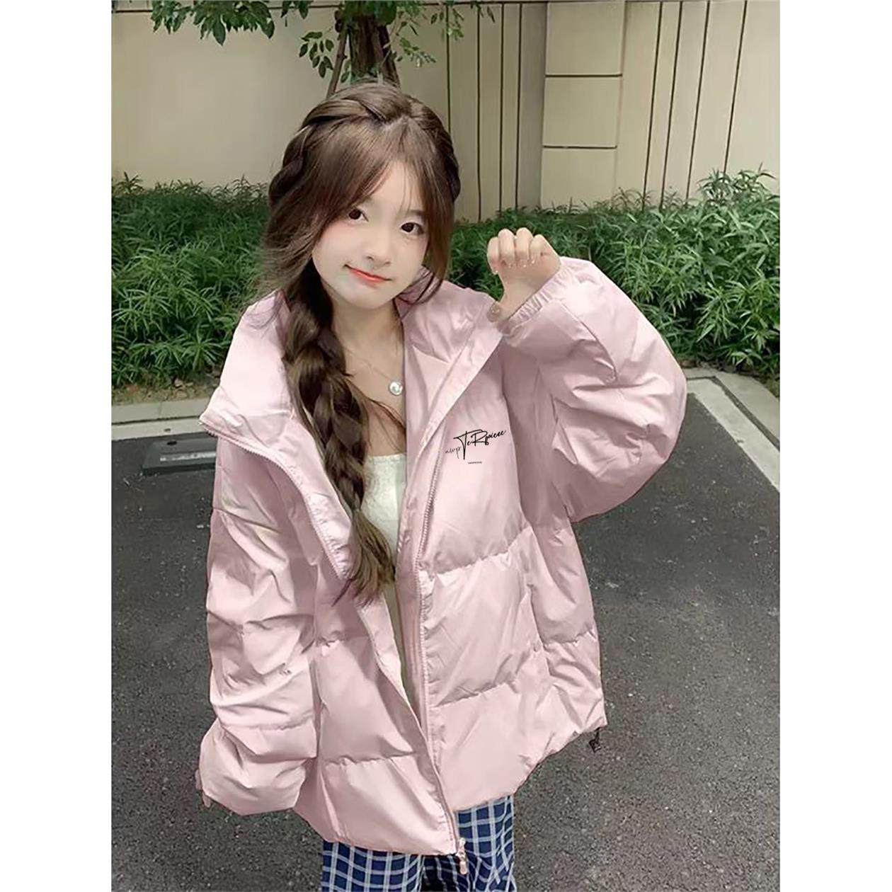 粉色美式羽绒棉服女秋冬季初中生宽松加绒加厚防寒立领面包服外套