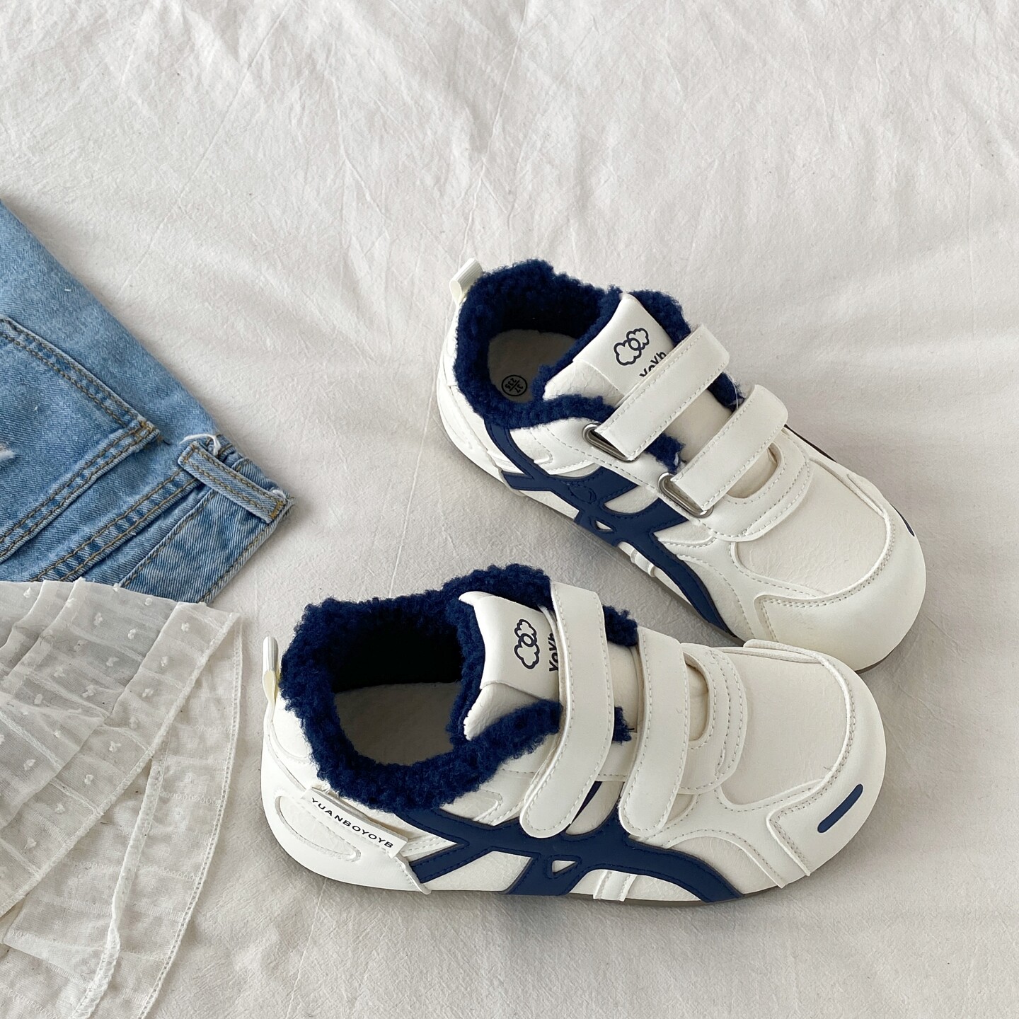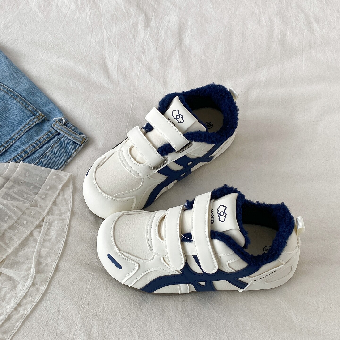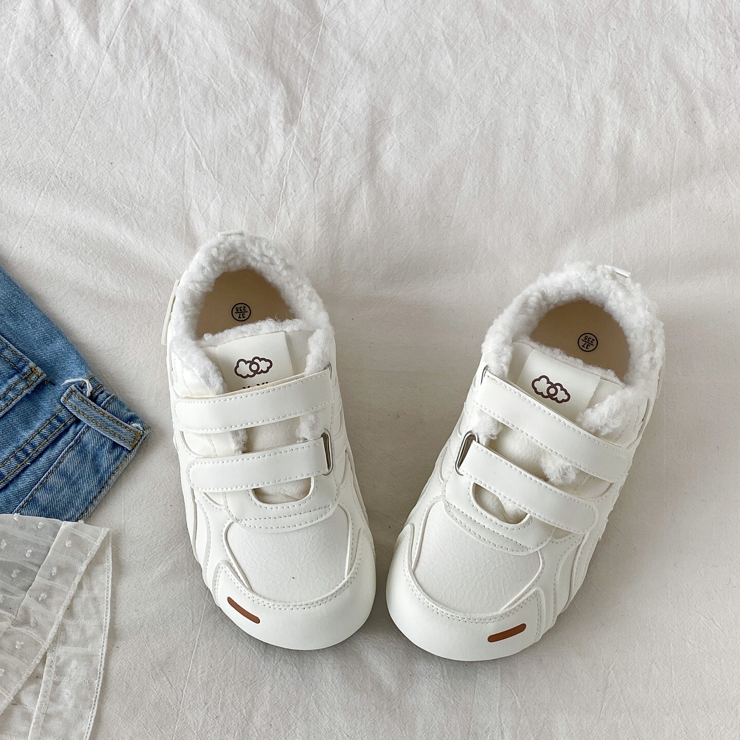 喜叔冬季加绒魔术贴小白鞋女款百搭二棉鞋平底休闲运动板鞋德训鞋