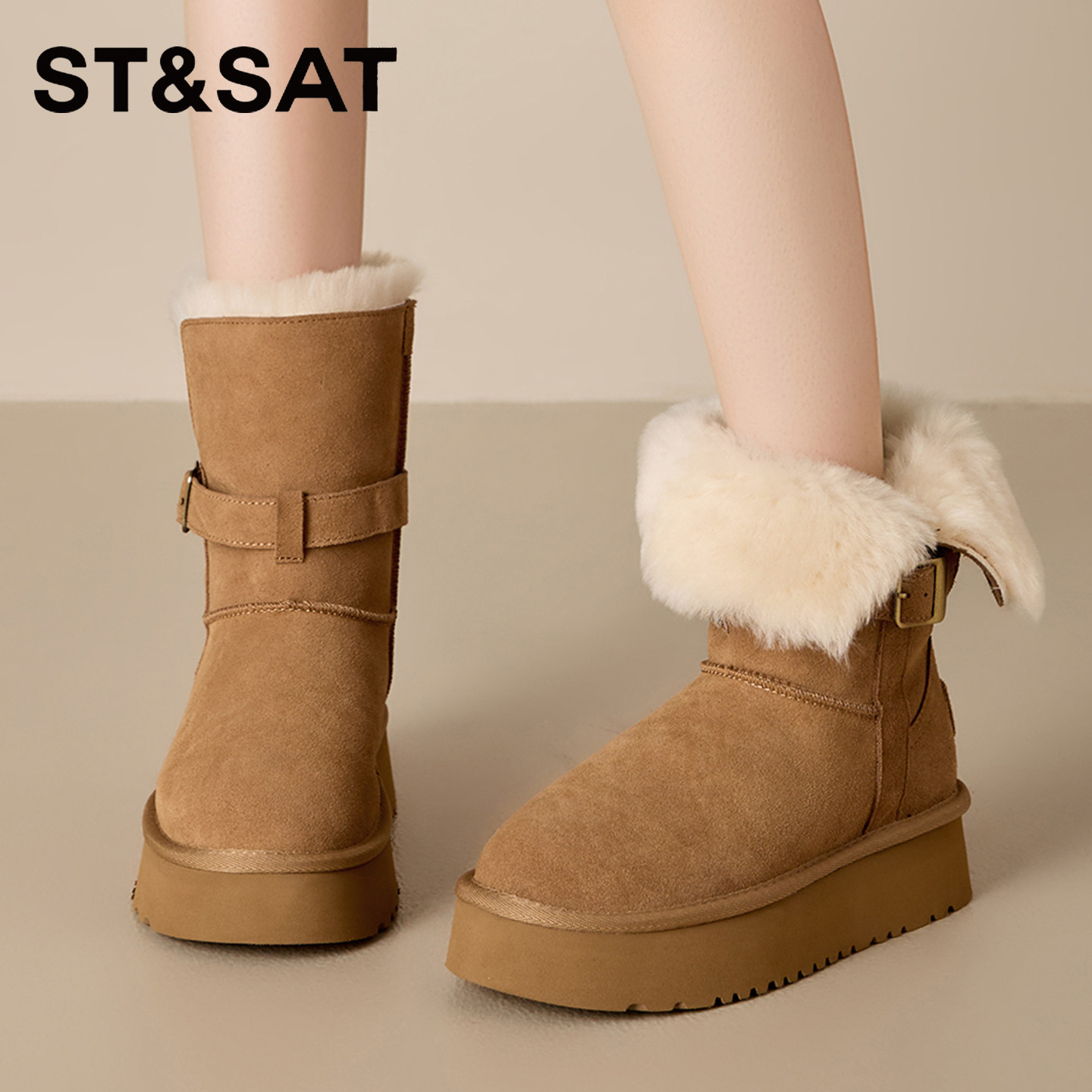 星期六雪地靴女款2025新款冬季防水防滑保暖棉鞋真皮厚底中筒棉靴