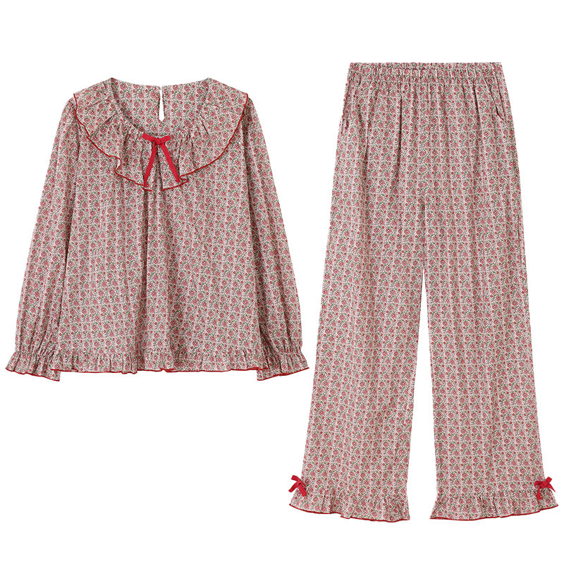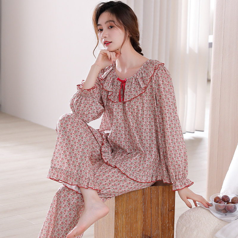 睡衣春秋季秋款宽松女款长袖套头纯棉全棉中年大码妈妈家居服套装