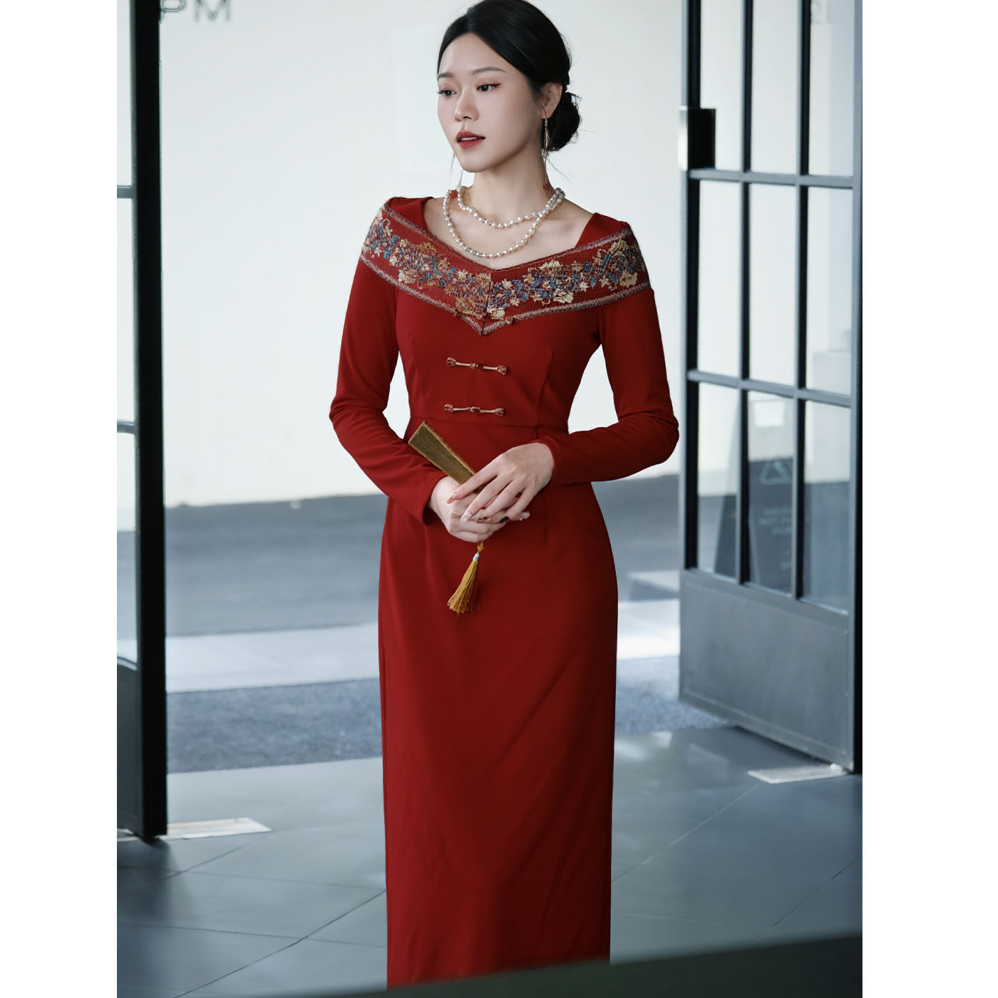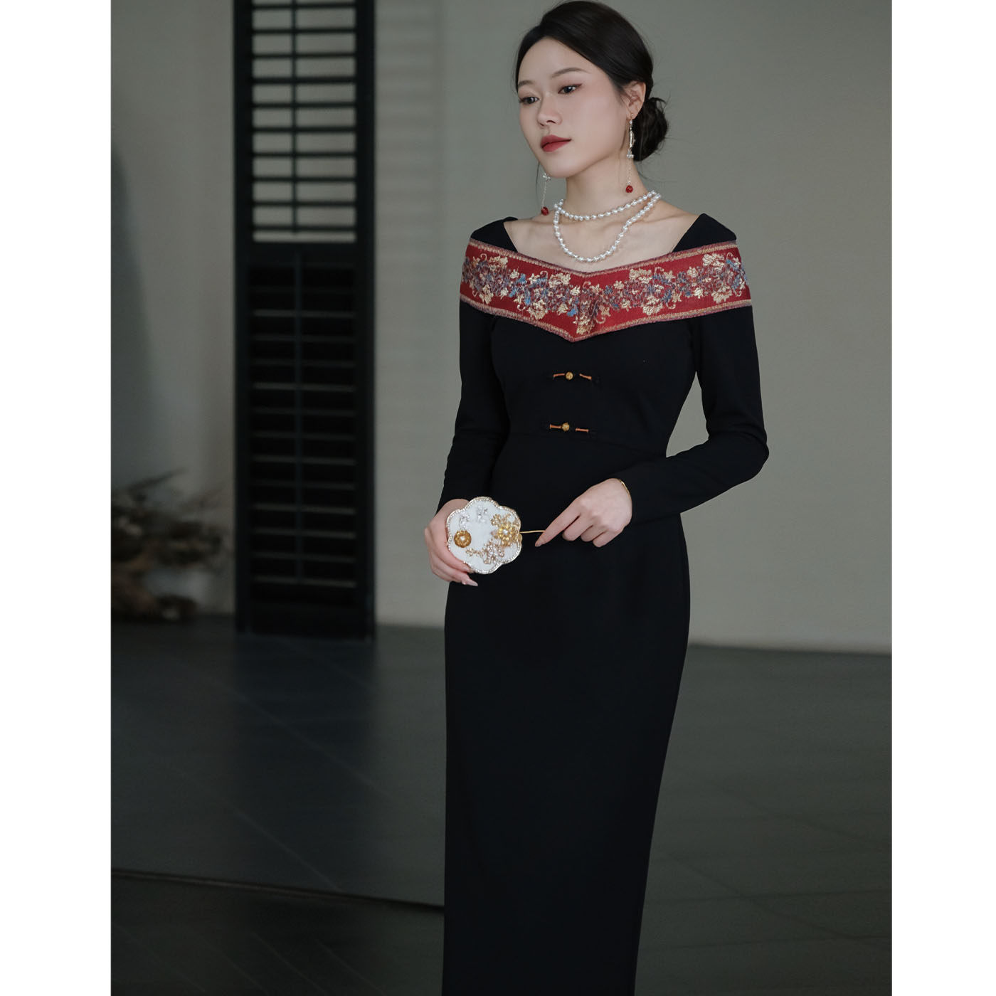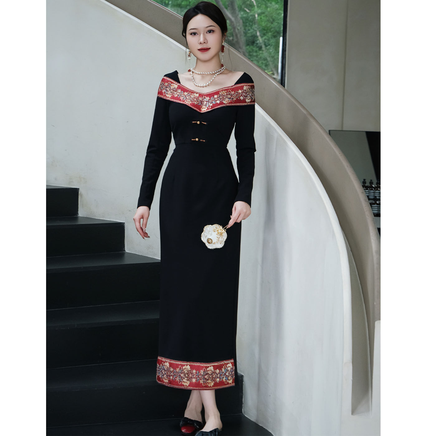 鹿与玫瑰新中式拼接黑色连衣裙长裙气质显瘦修身宴会礼服裙女秋冬