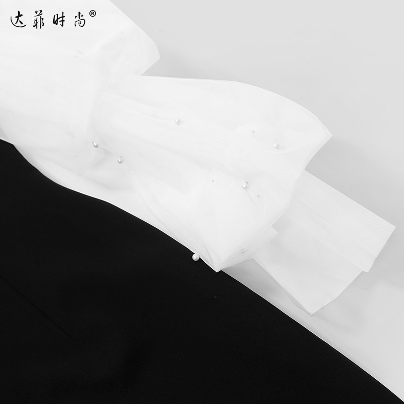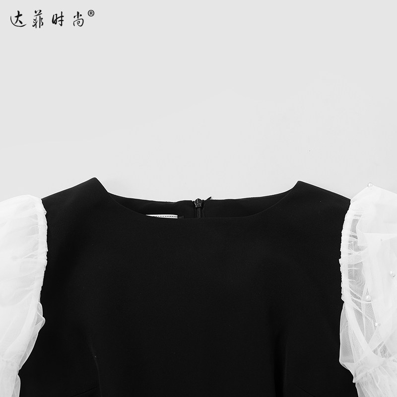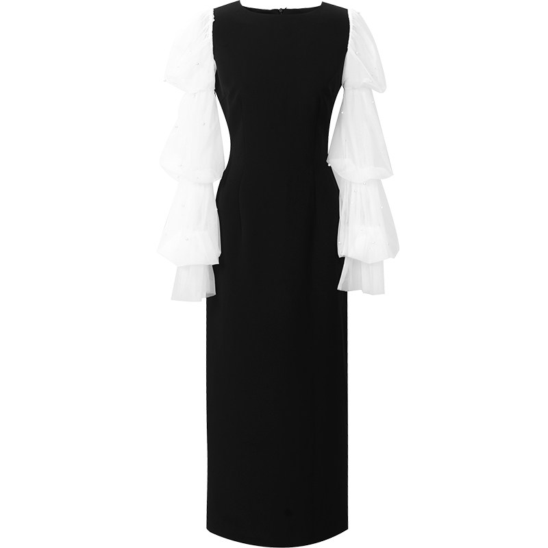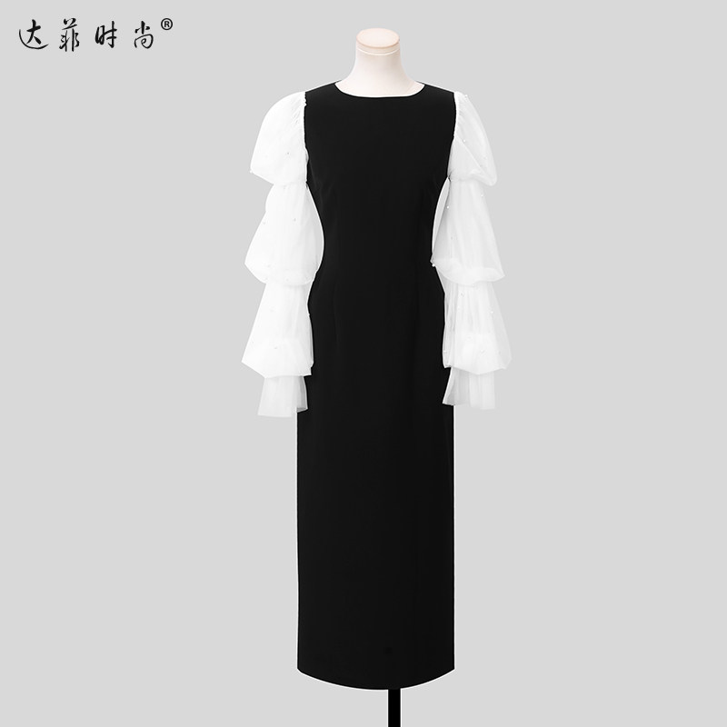 2026春季新款女装法式赫本风优雅珍珠网纱拼接长袖黑色连衣裙长裙
