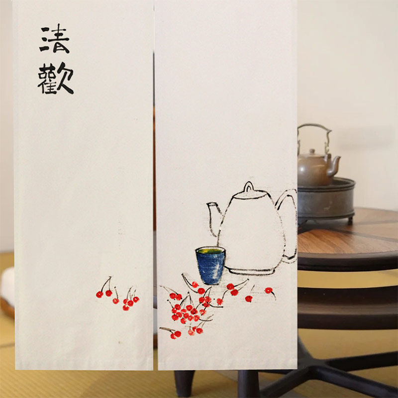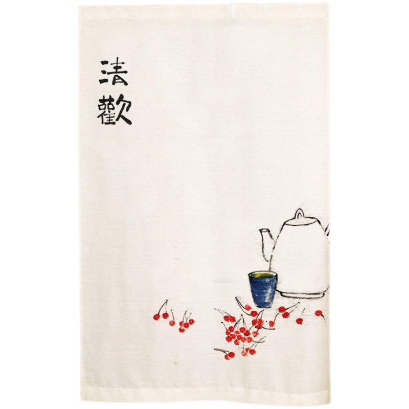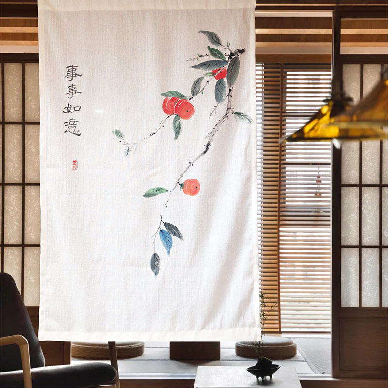 手绘门帘穿杆中式古风中国风柿子隔断帘棉麻半帘暖帘短帘遮丑防尘