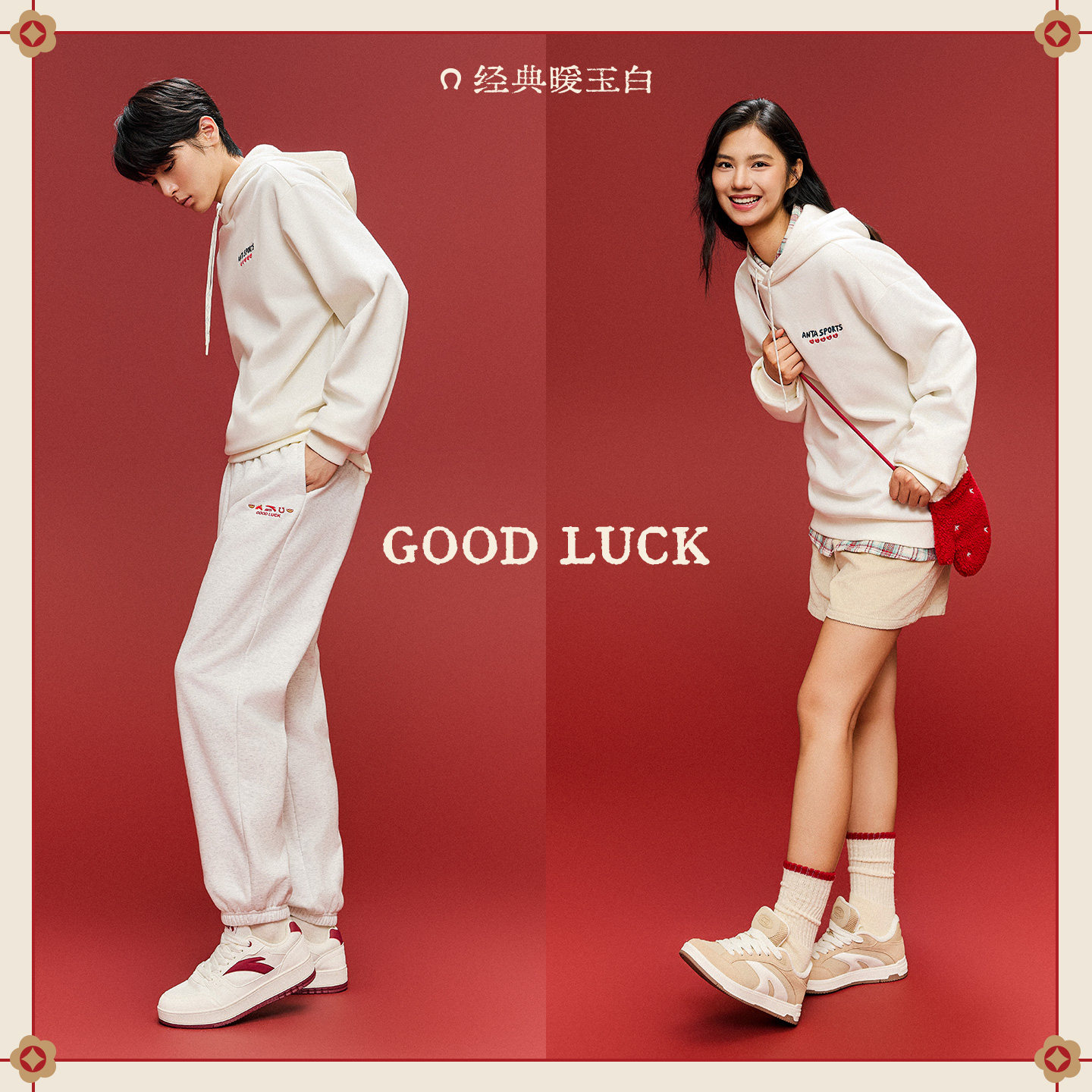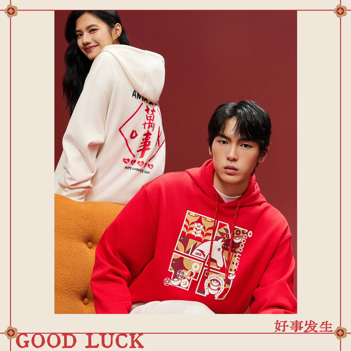 安踏好事发生新年好运卫衣男款冬季加绒连帽套头卫衣本命红色上衣