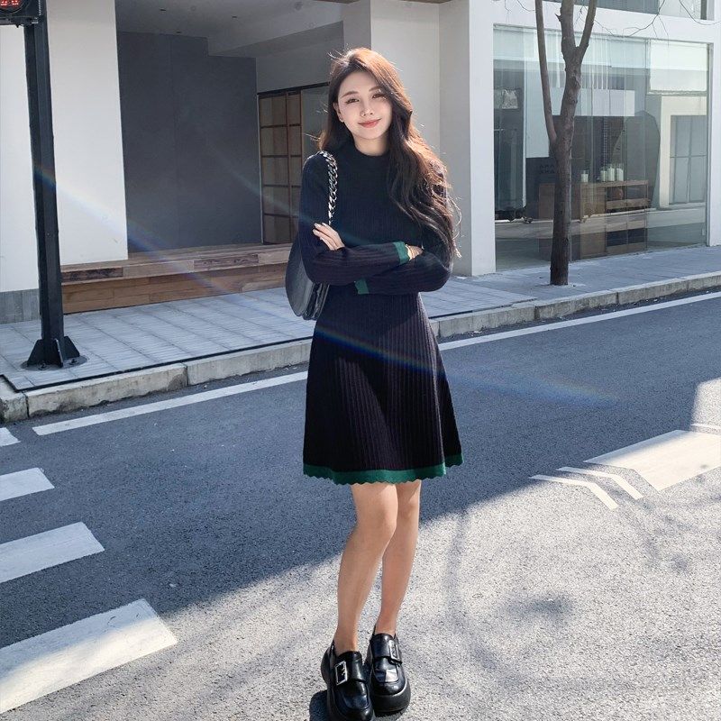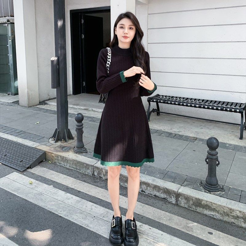 中长款针织连衣裙女秋冬内搭半高领修身显瘦小个子打底a字毛衣裙