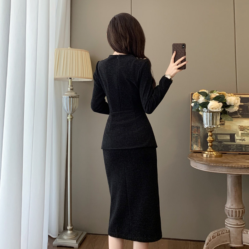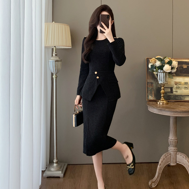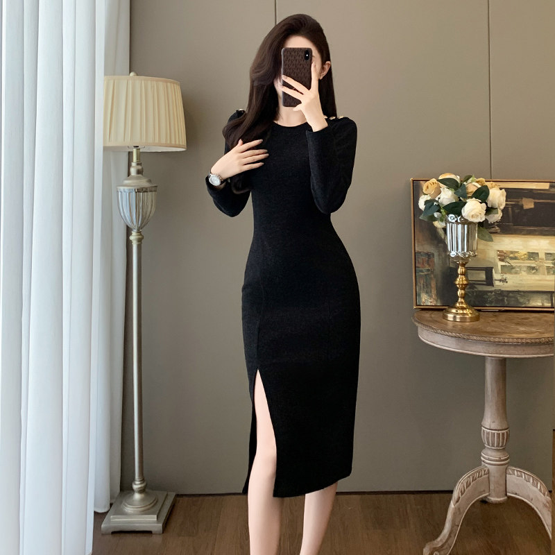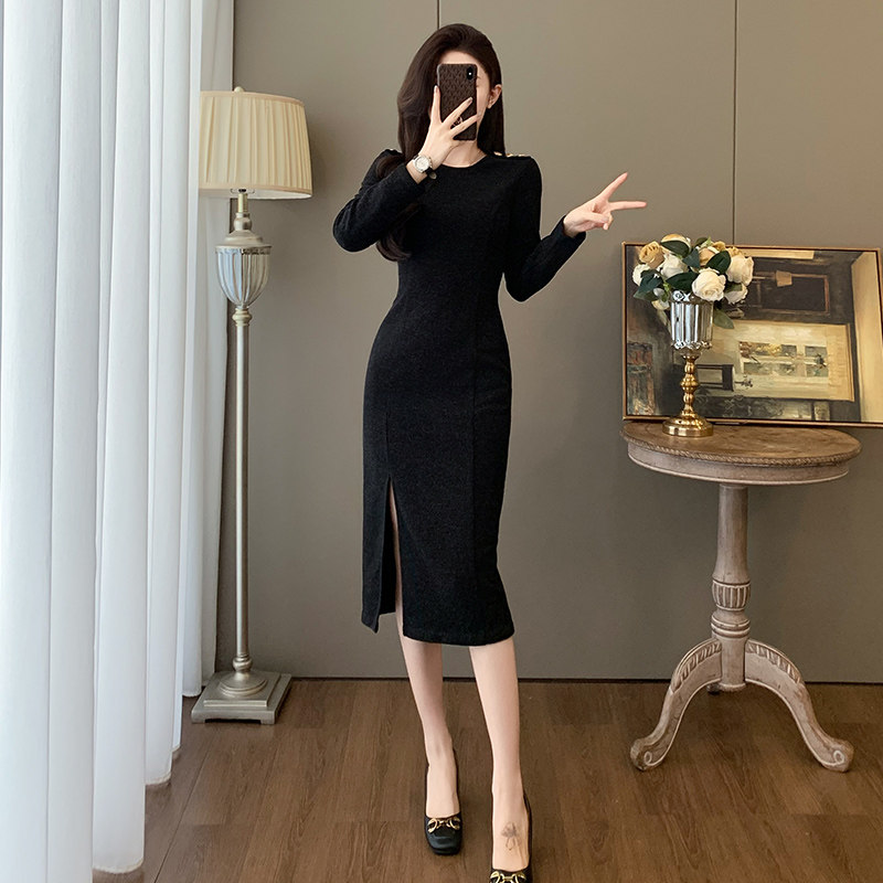 2025秋装新款轻奢黑色连衣裙女收腰显瘦开叉中长款高级感气质裙子