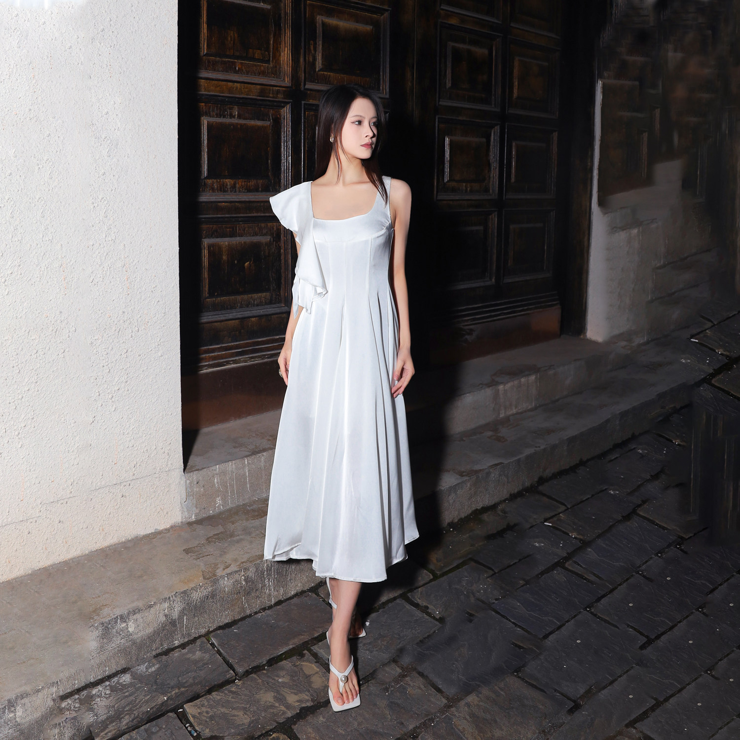 柠檬白色吊带连衣裙女法式绝美气质高级感不规则长款到脚踝长裙