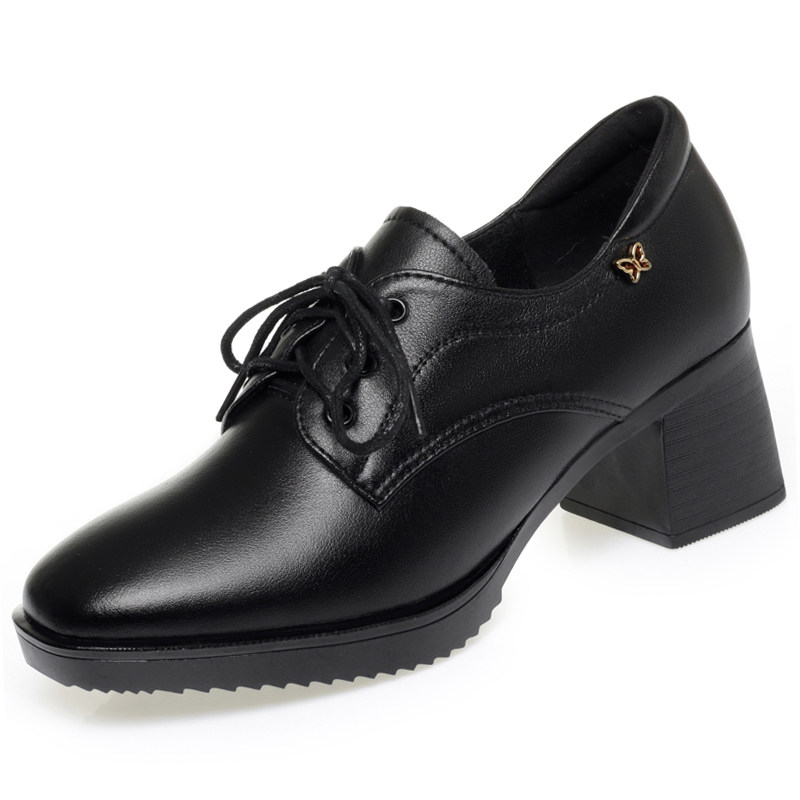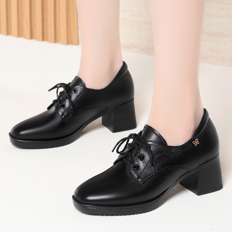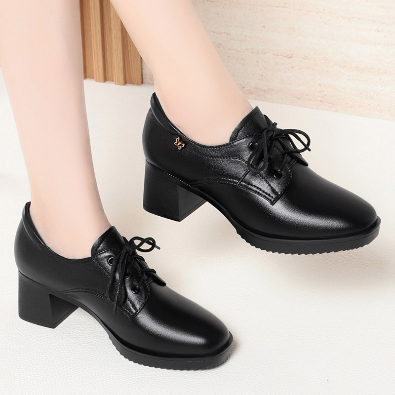 2026年春秋真皮女鞋系带小皮鞋女深口中跟大码单鞋工作鞋妈妈鞋子