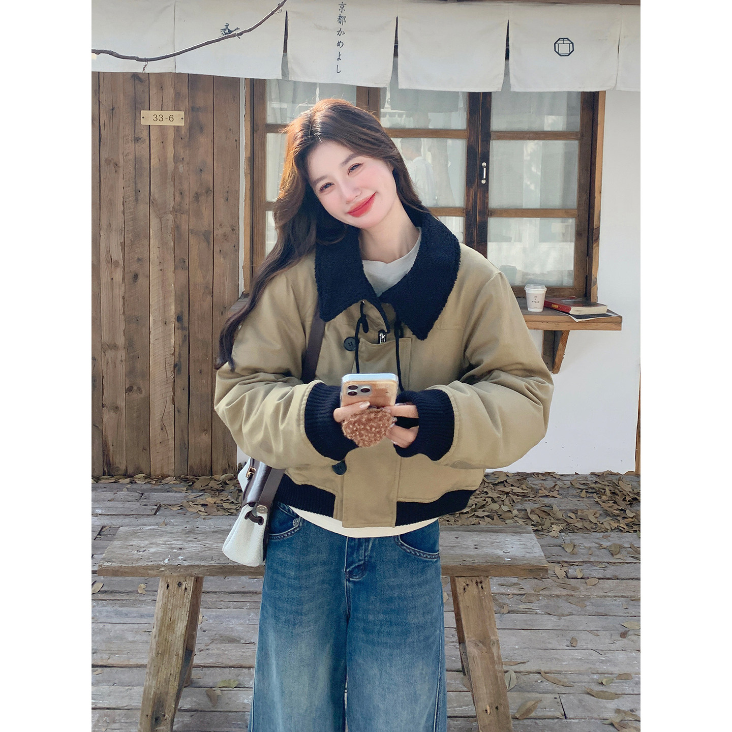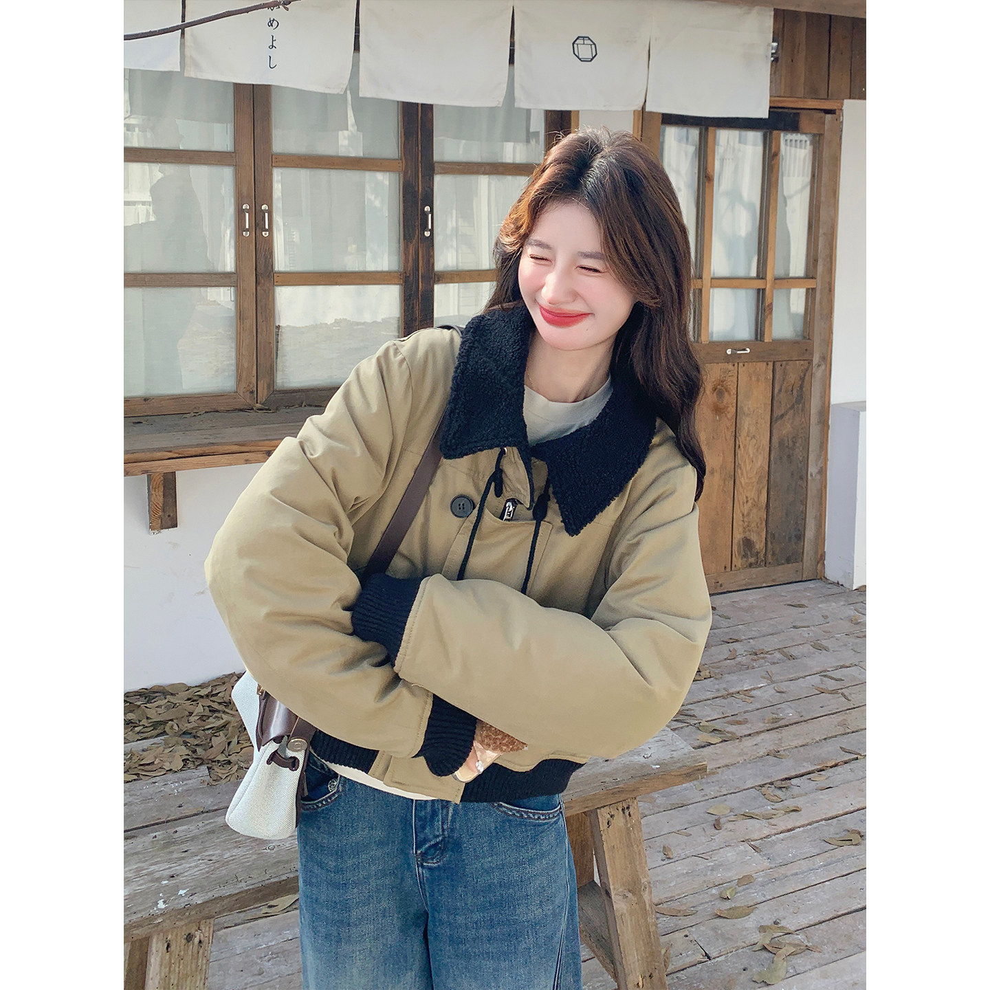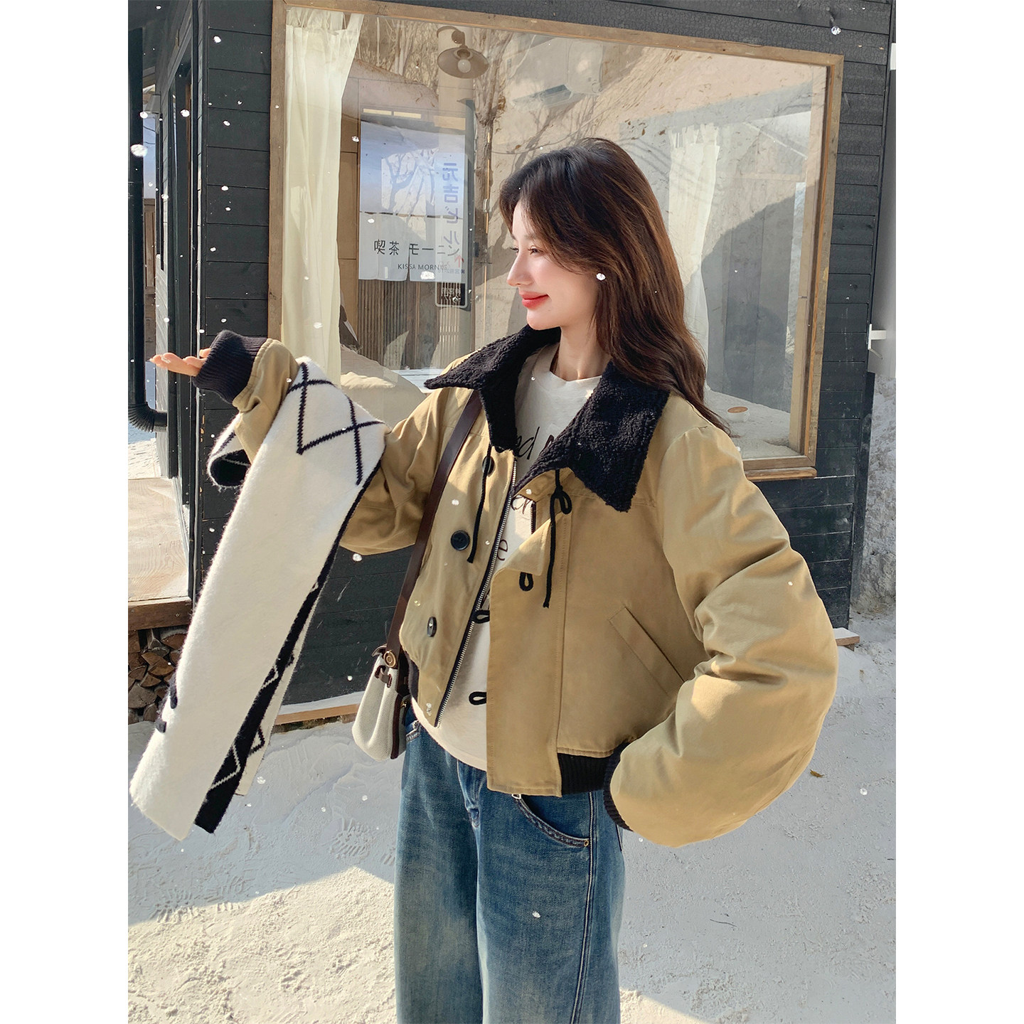 卡其色设计感工装风羽绒服女短款2025冬季新款羊羔毛拼接翻领外套