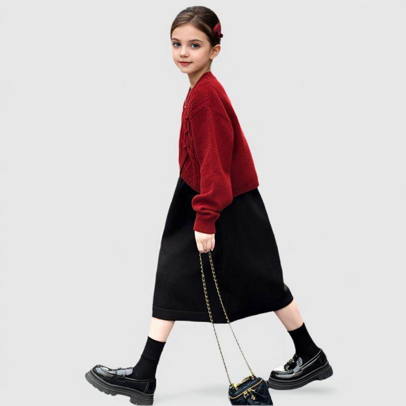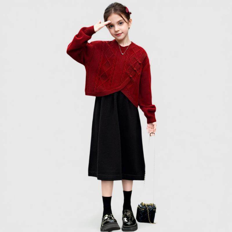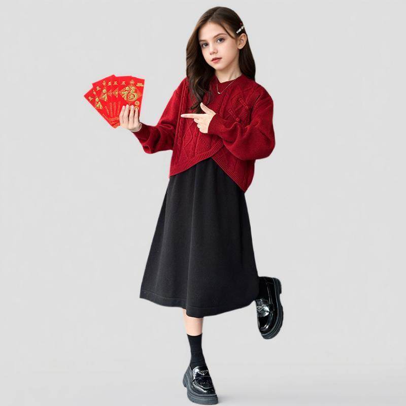 拜年服女童冬季连衣裙套装2025新款女大童中国红毛衣背心裙两件套