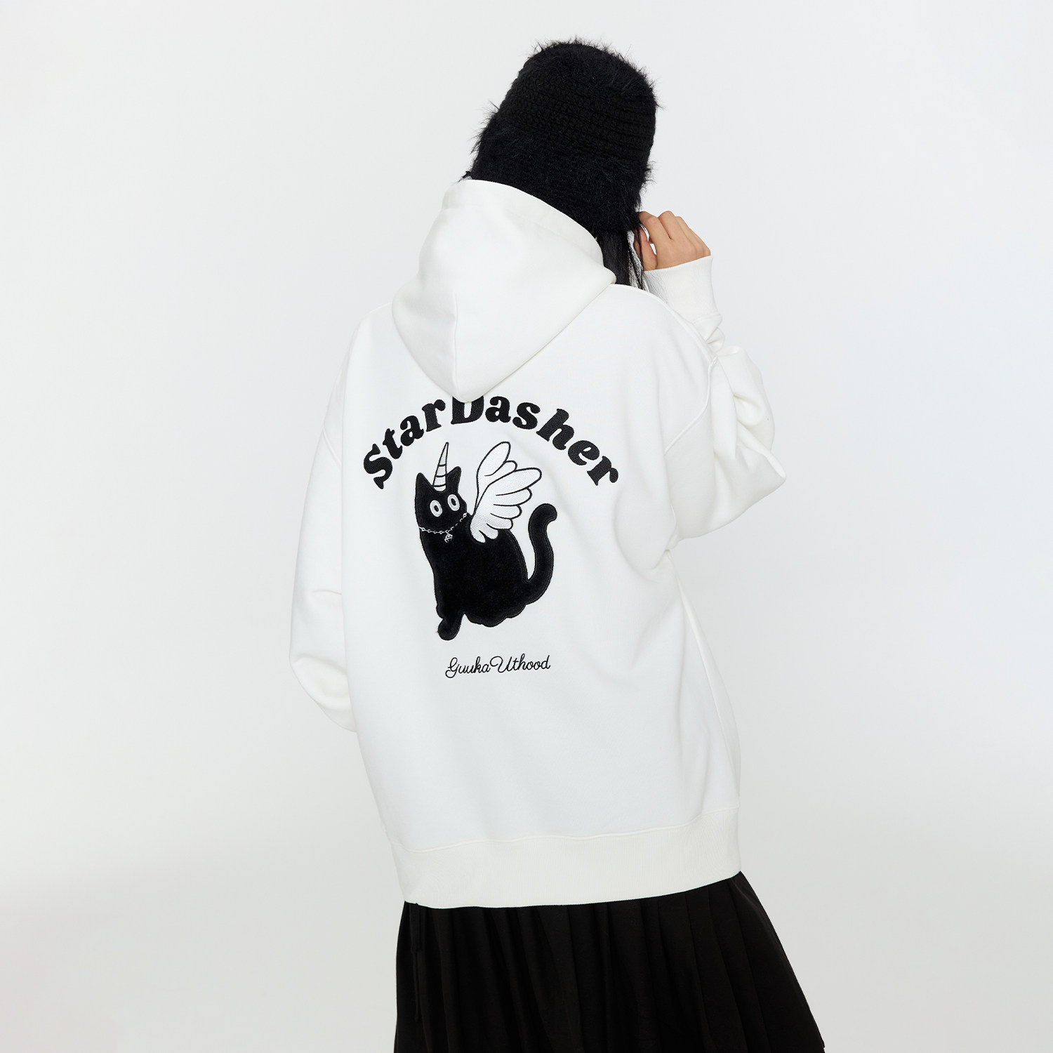 GUUKA潮牌白色独角猫咪卫衣女款春秋新款 加绒加厚落肩连帽衫宽松
