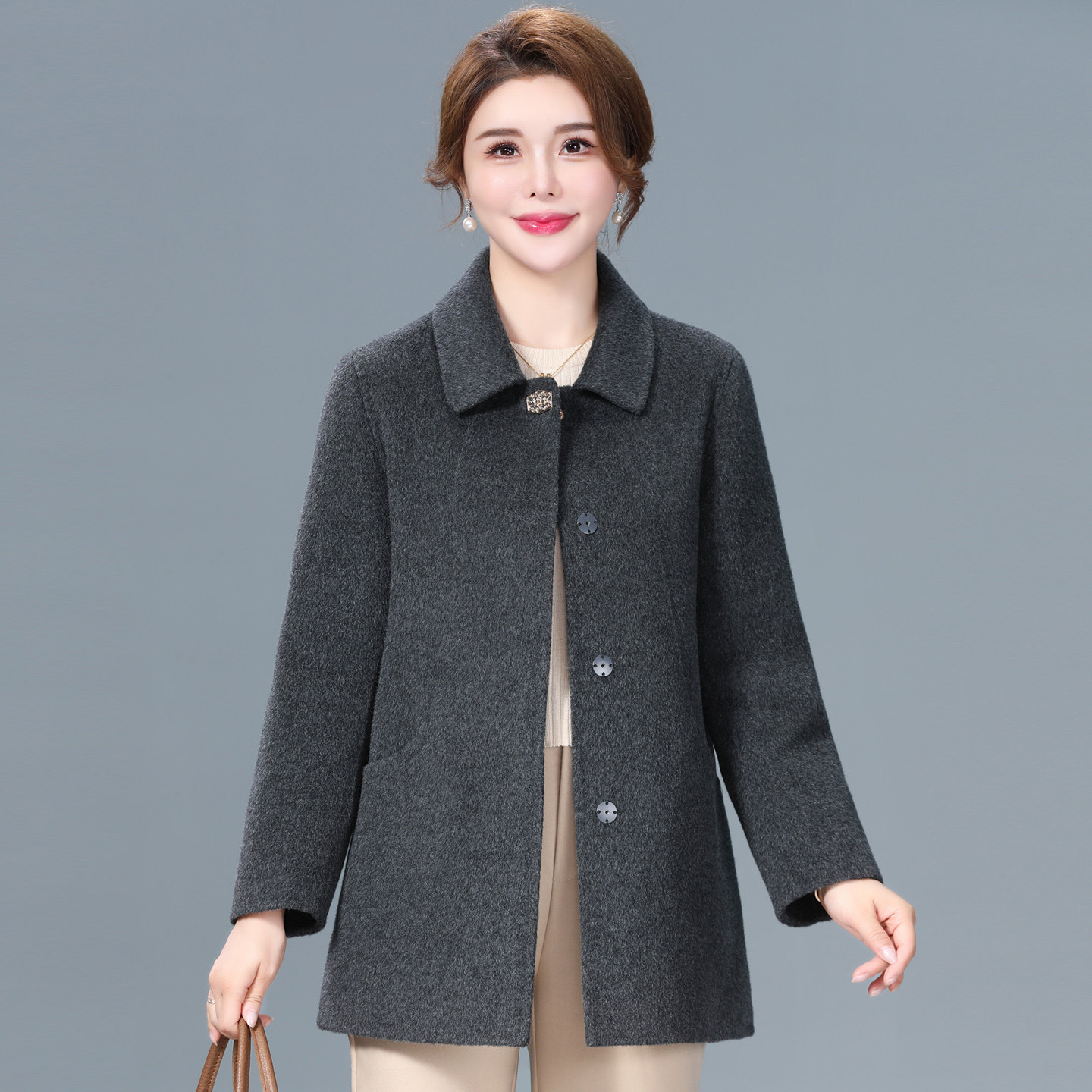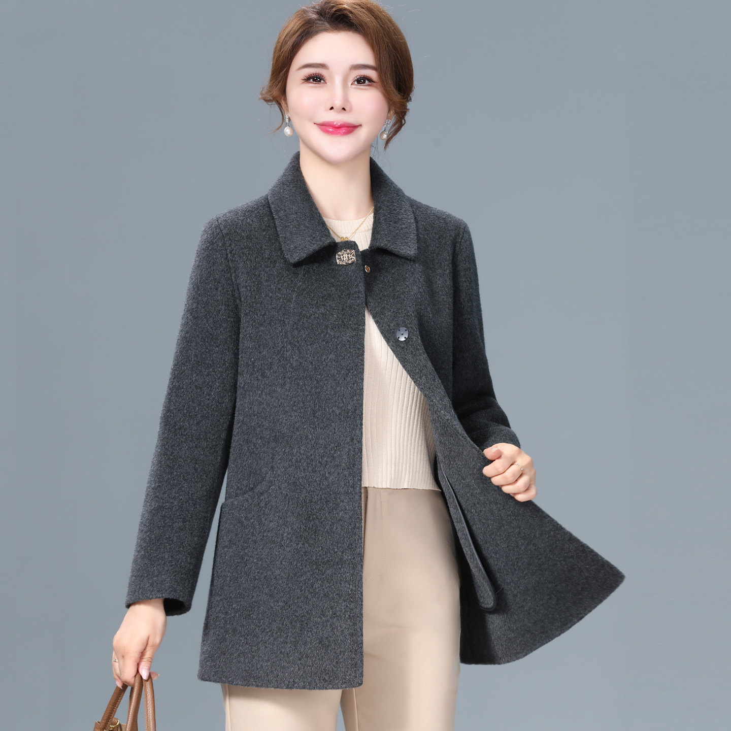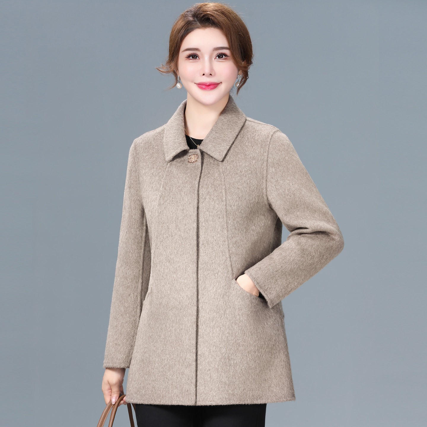 新款双面羊绒短款大衣女洋气妈妈秋冬装大码中老年人羊毛呢子外套