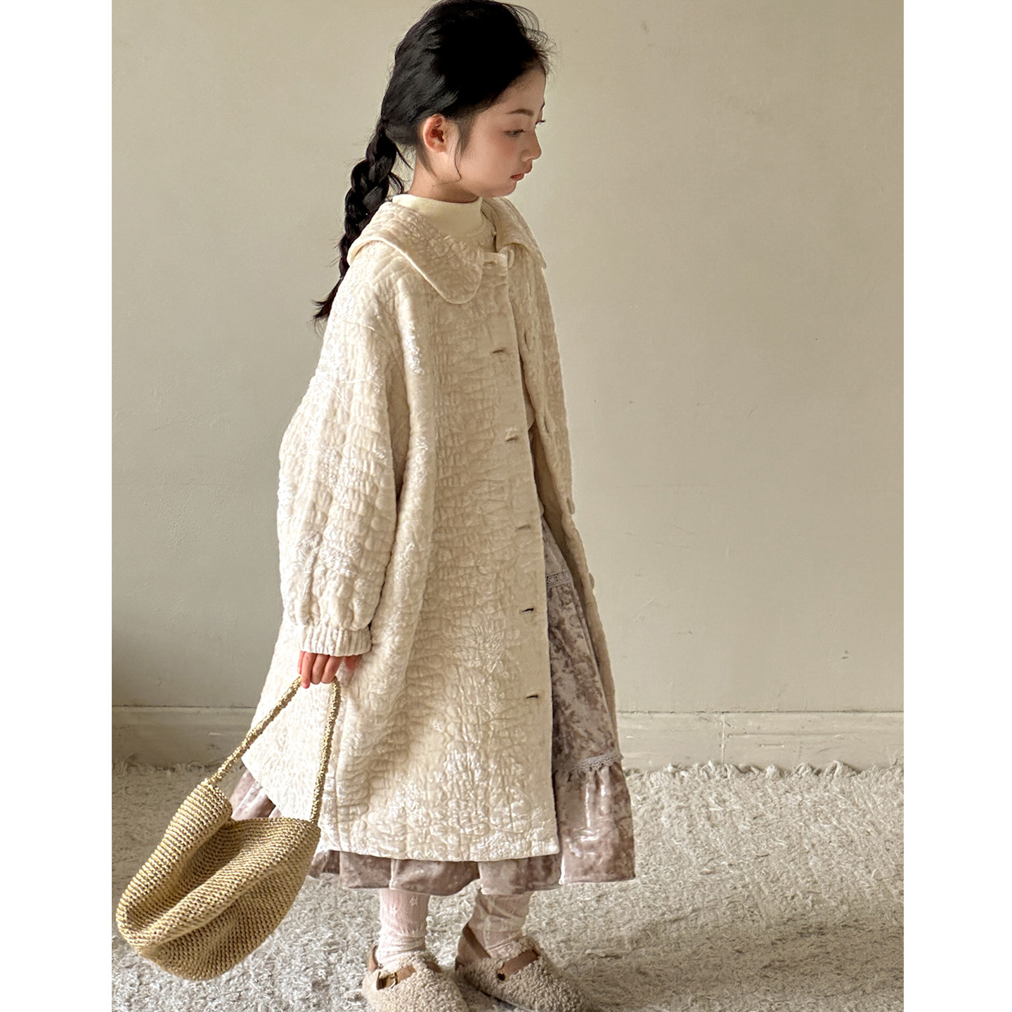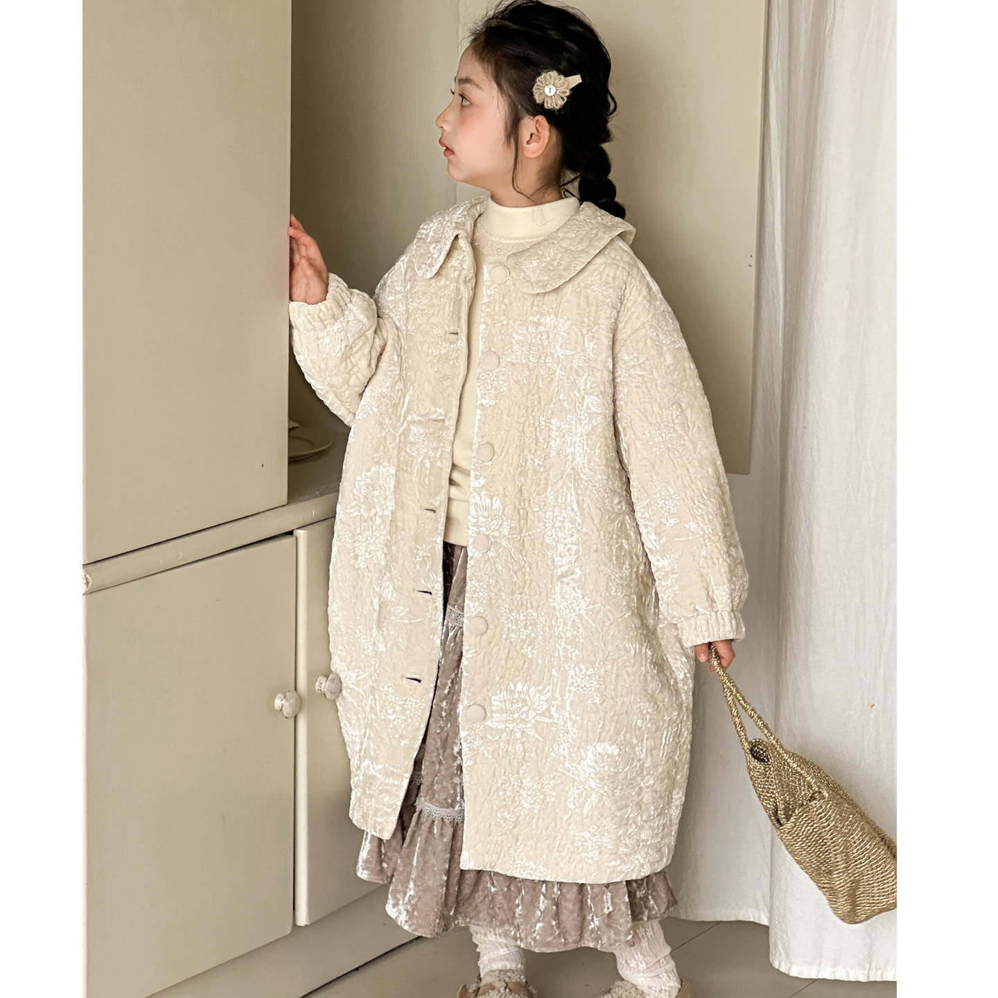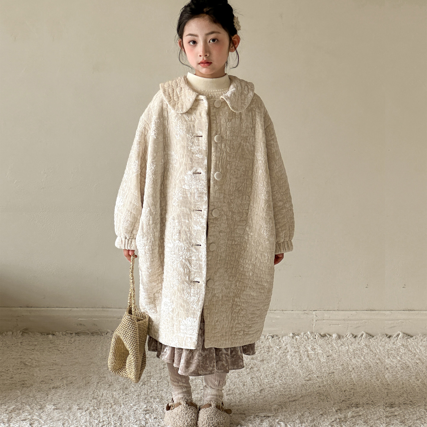 女童新年外套2026冬季新款女大童中长款加厚大衣儿童重工刺绣棉服