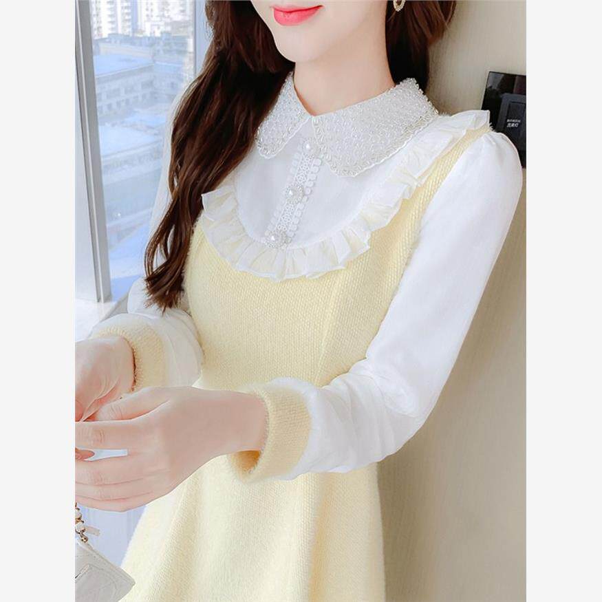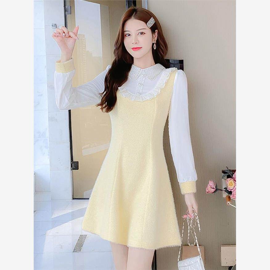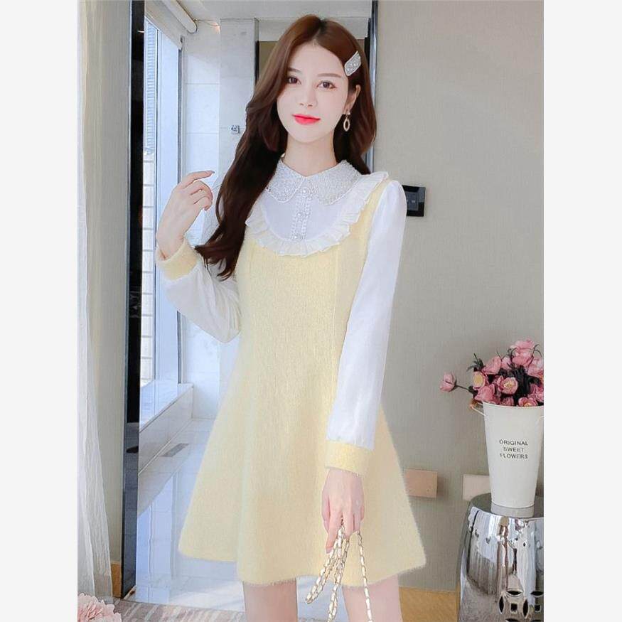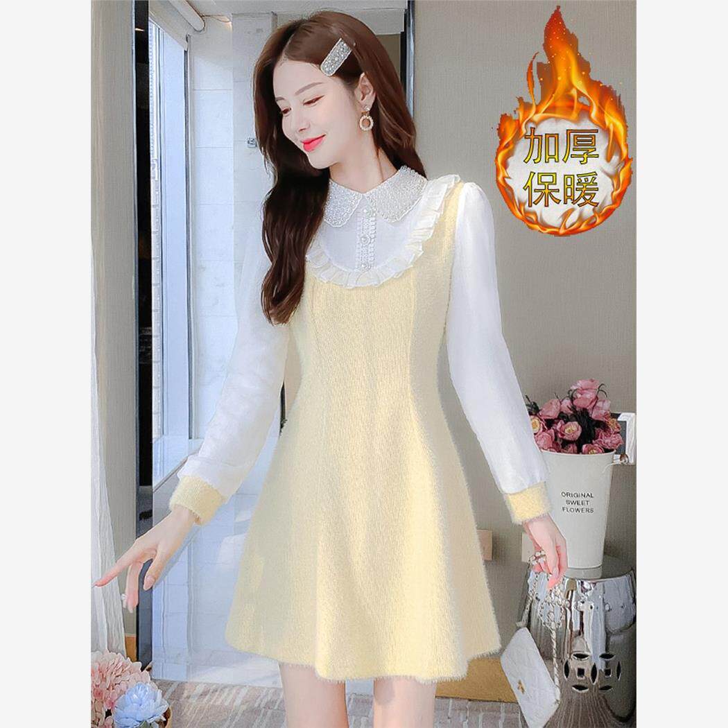 小香风甜美加绒加厚打底毛衣裙秋冬小个子短款娃娃领水貂绒连衣裙