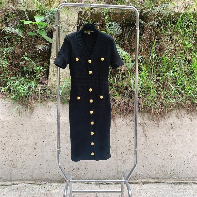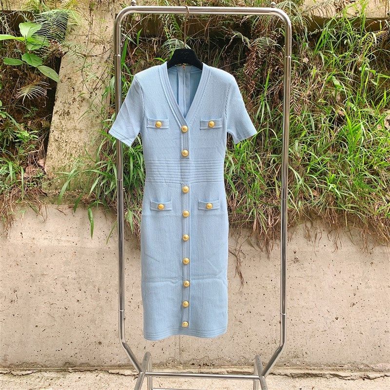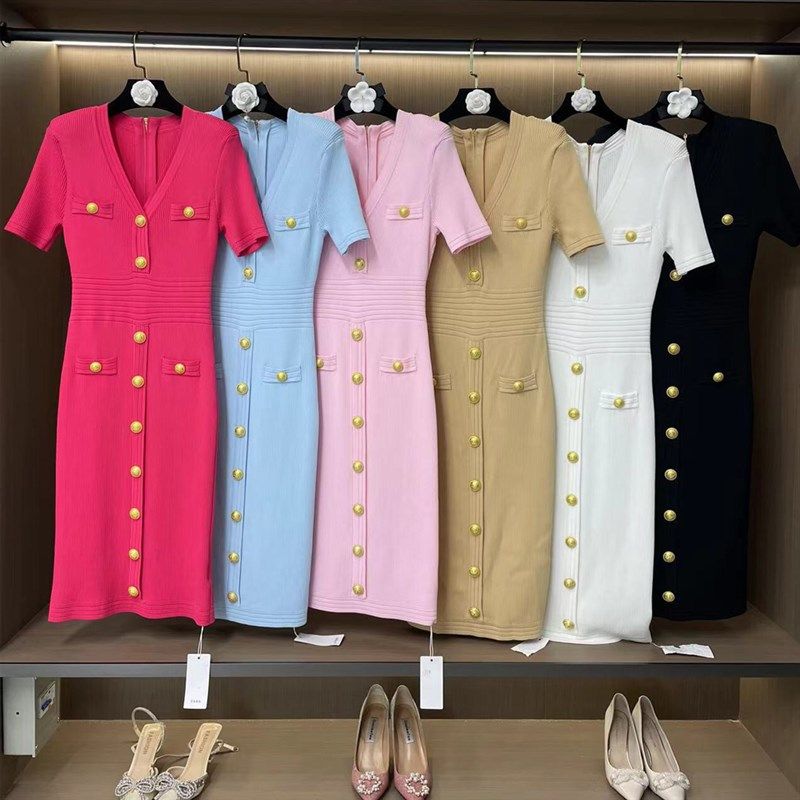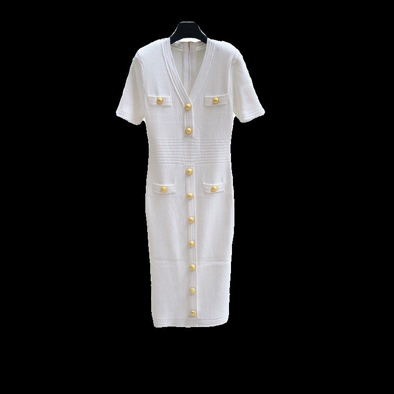 夏季女V领短袖冰丝过膝中长款针织连衣裙收腰显瘦通勤气质包臀裙