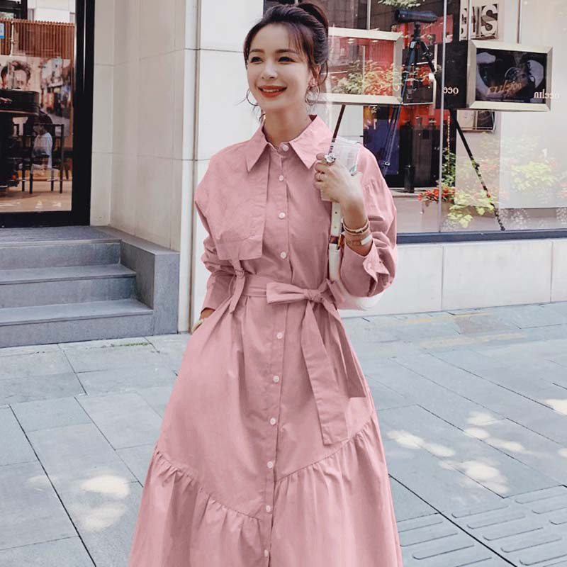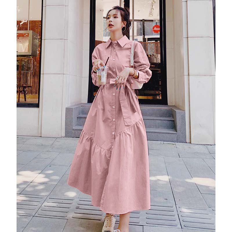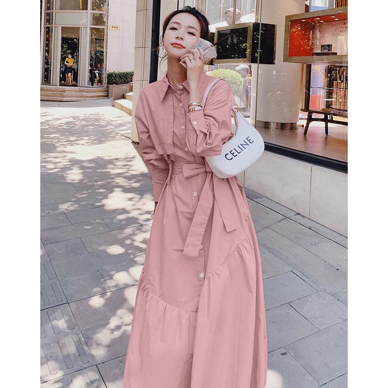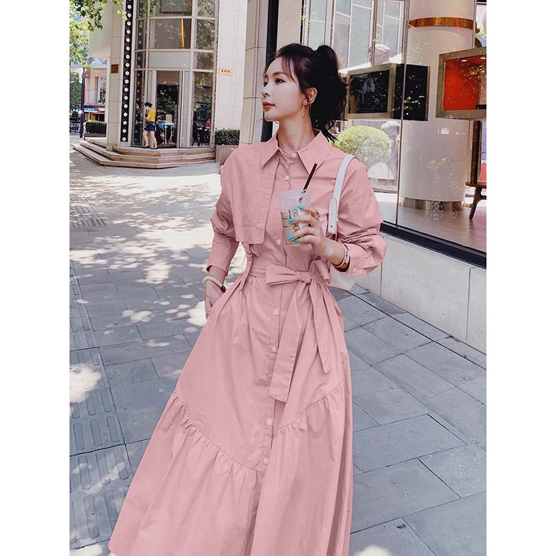 送腰带粉色长袖连衣裙女春秋2026新款法式收腰茶歇a字裙D3313