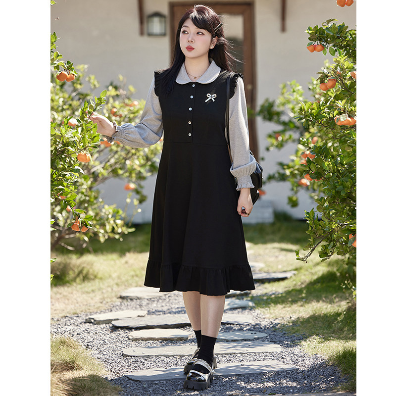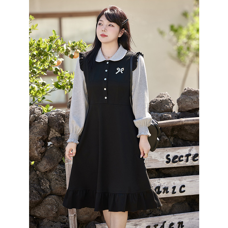 绮娑女装大码胖MM连衣裙冬季新款假两件娃娃领收腰显瘦A字裙长款