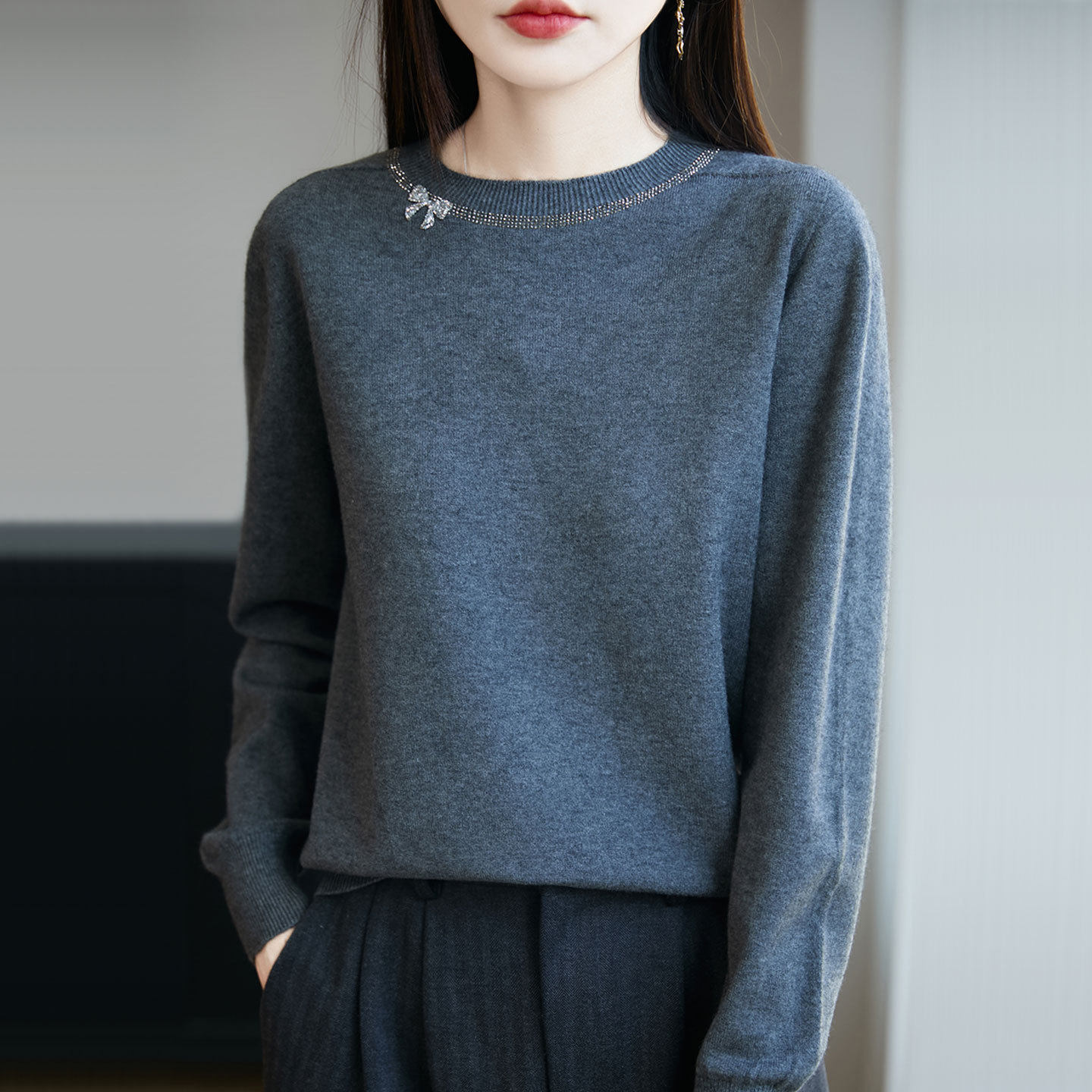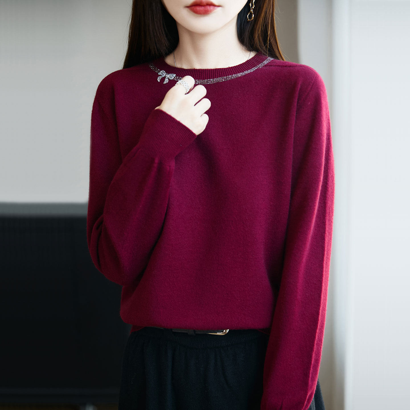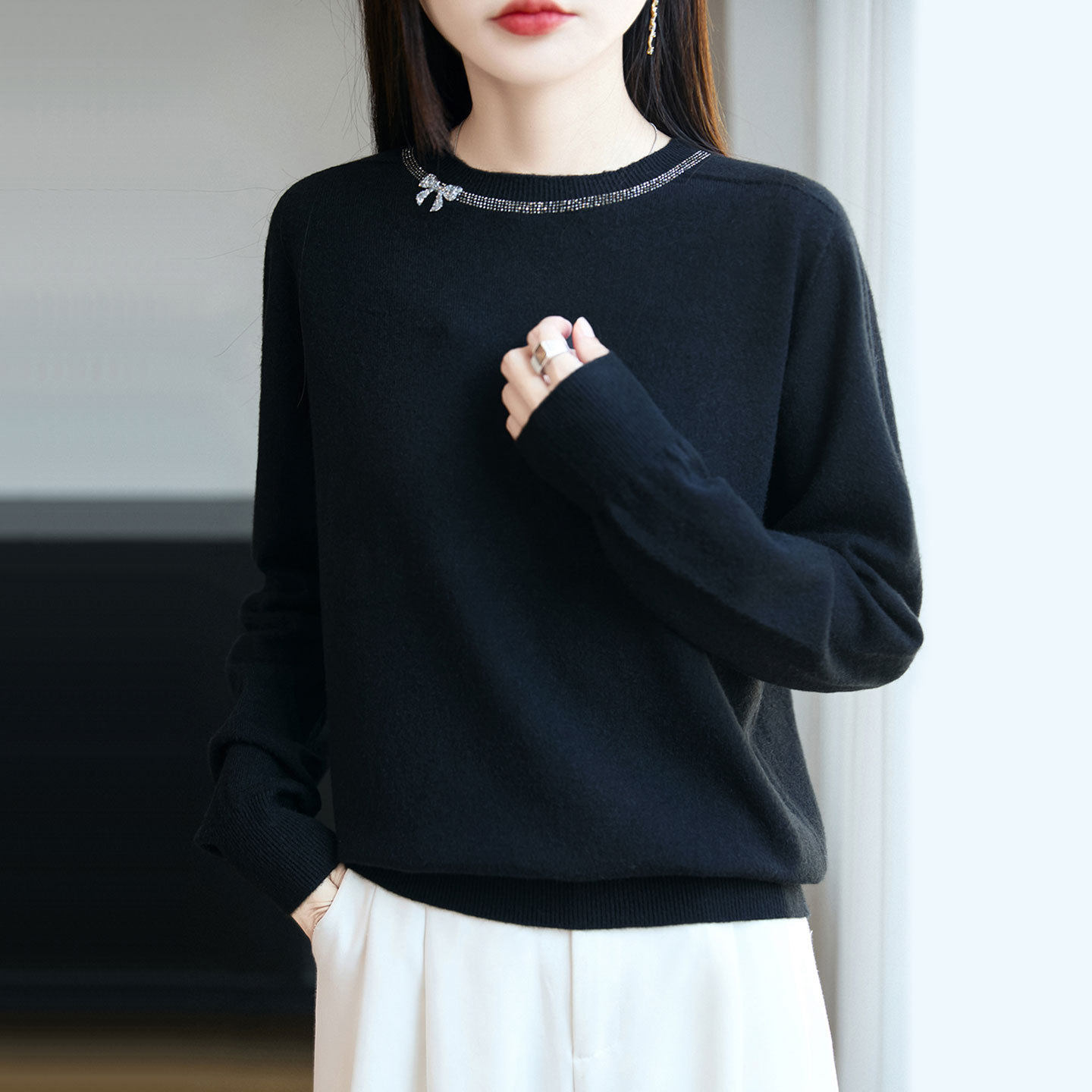 秋新款圆领纯色东莞大朗针织衫不起球烫钻女宽松显瘦毛衣打底衫潮