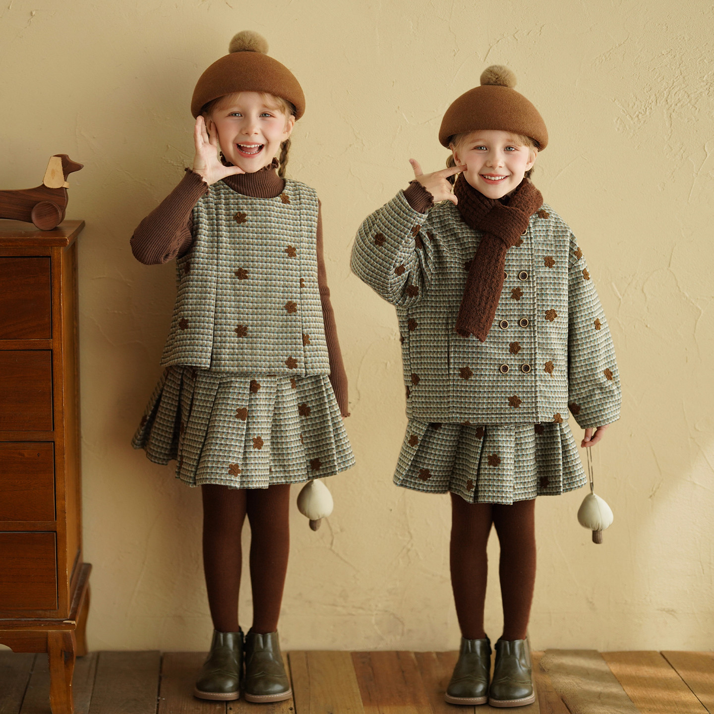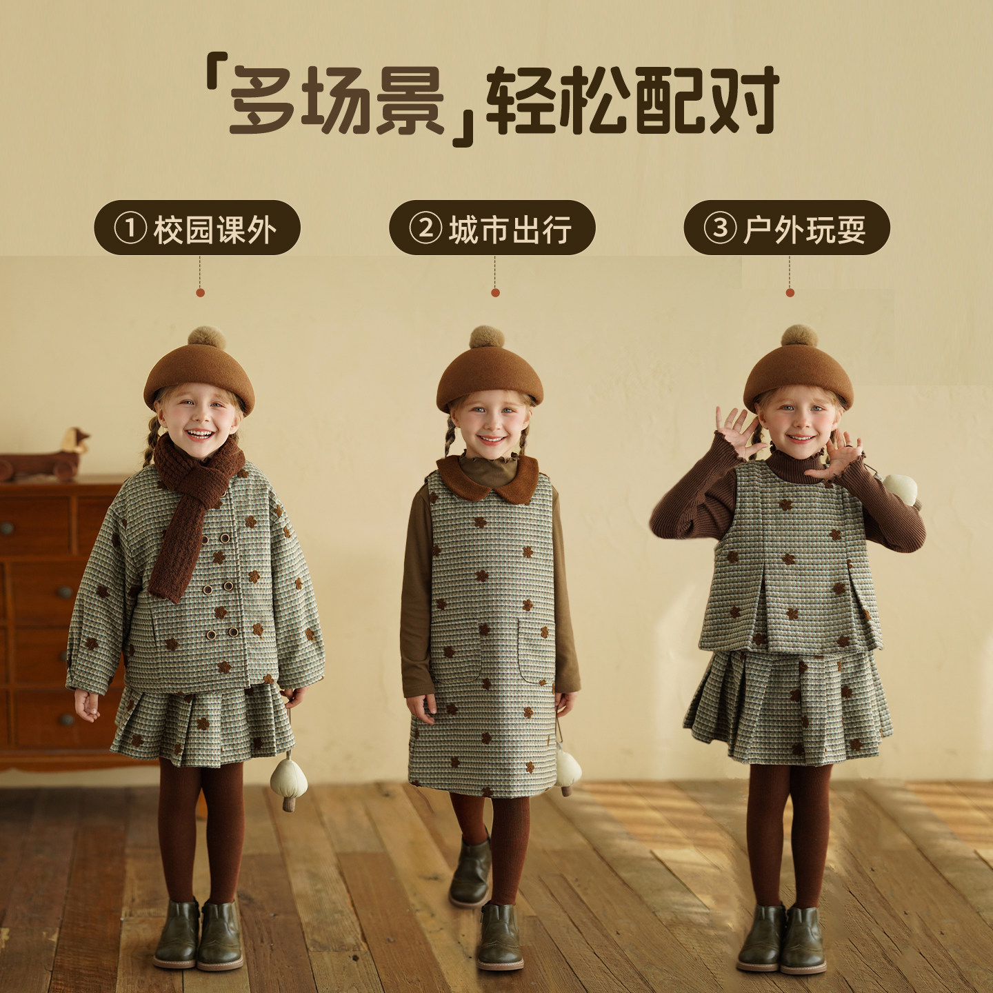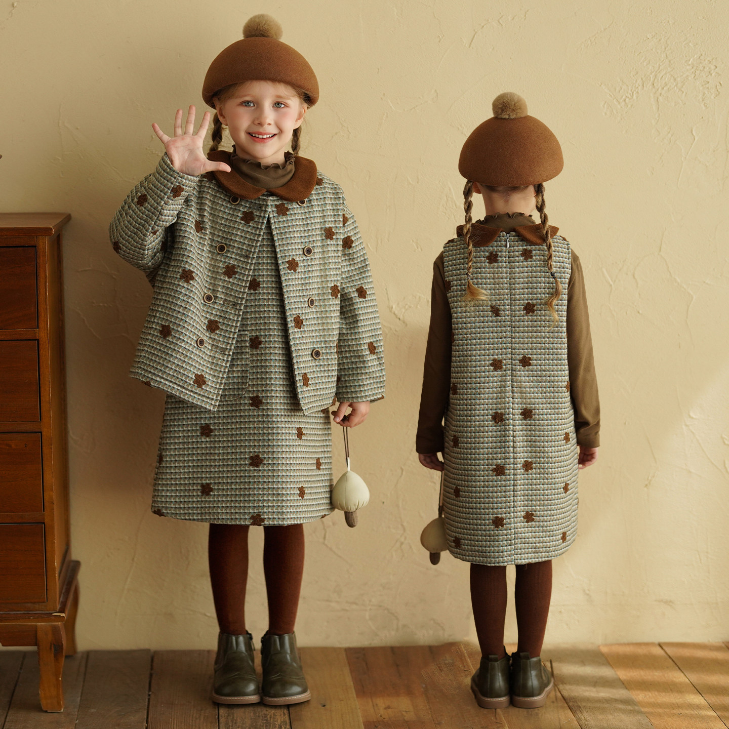 砚台家系列款女童连衣裙套装千鸟格冬装新款儿童夹棉外套裤子保暖