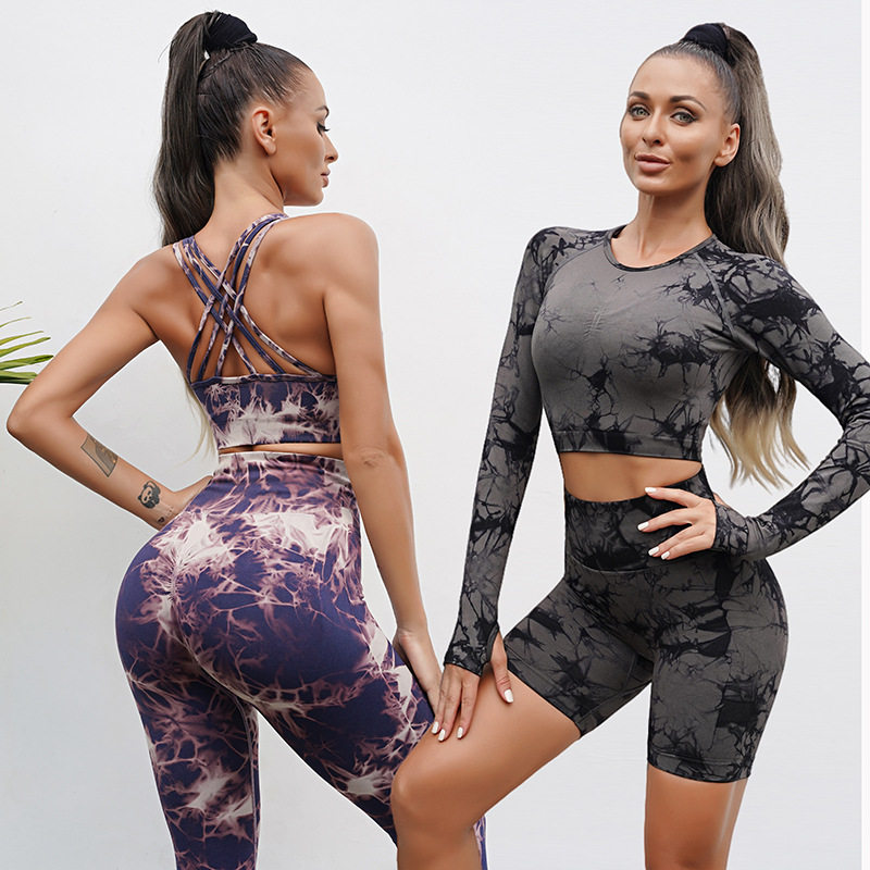 健身裤扎染瑜伽服磨毛运动长袖健身长裤瑜伽套装女修身塑形紧身