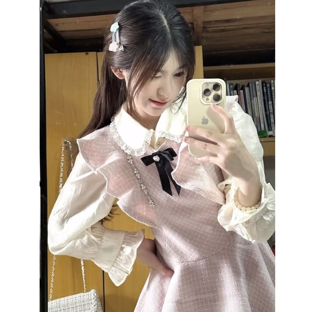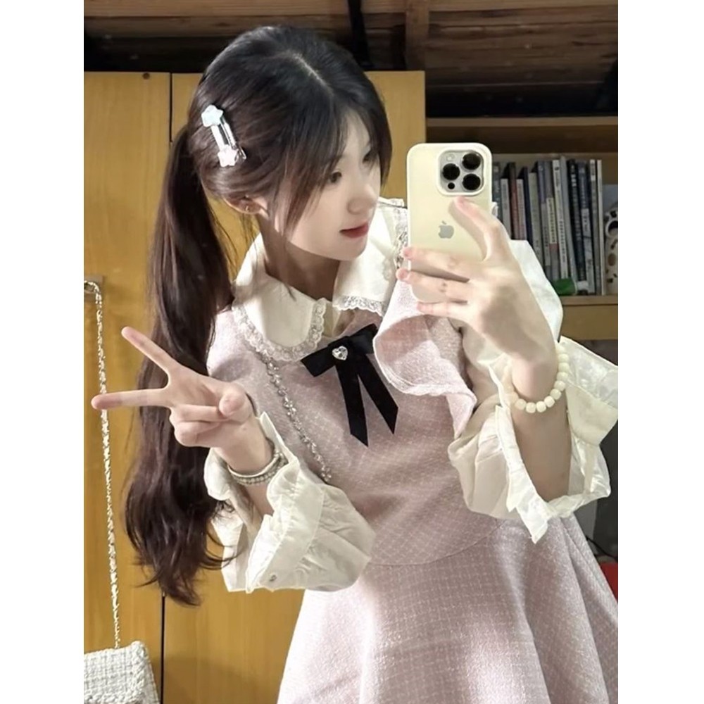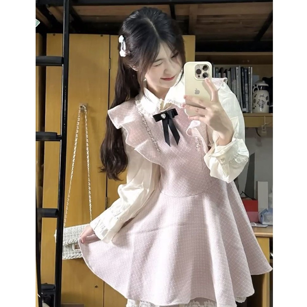小香背带连衣裙秋冬甜美收腰蓬蓬裙小个子富家千金两件套装裙飞袖