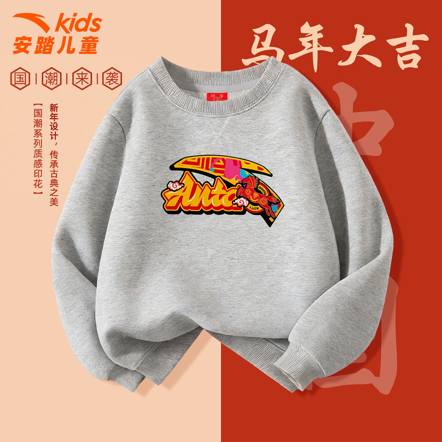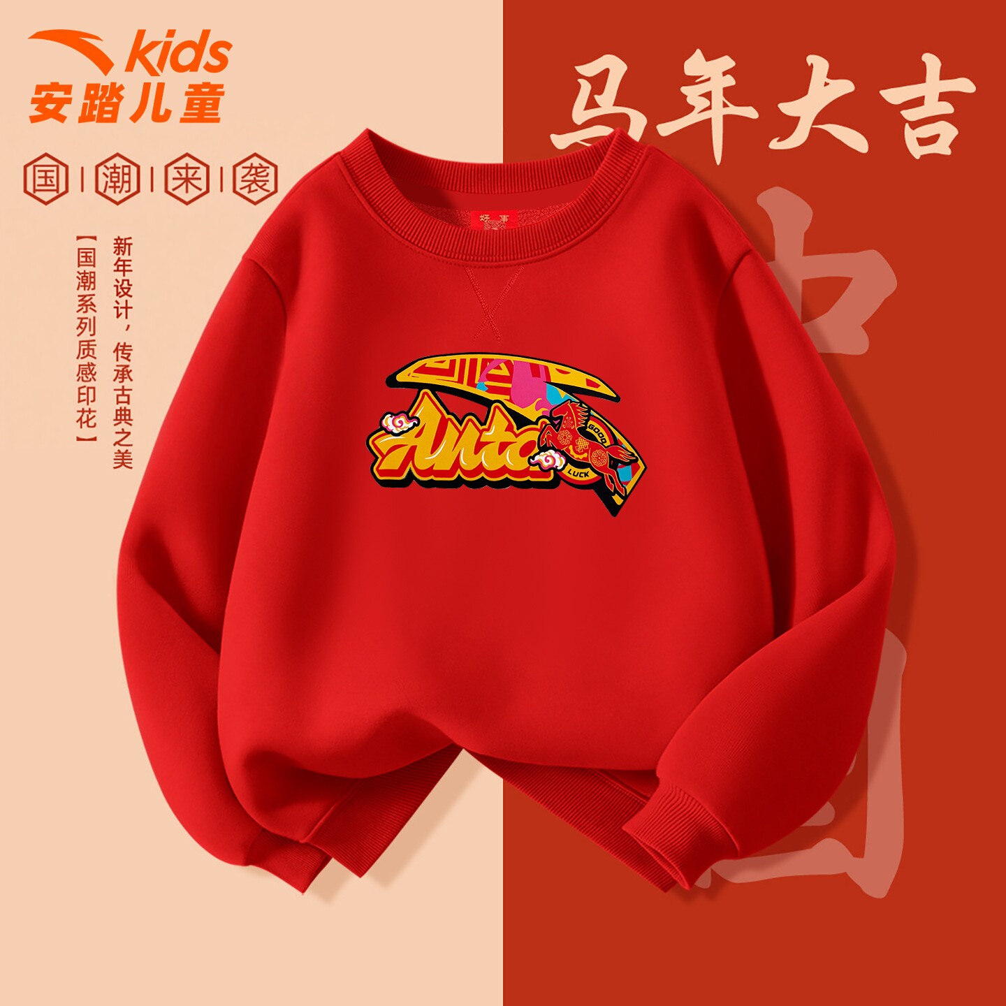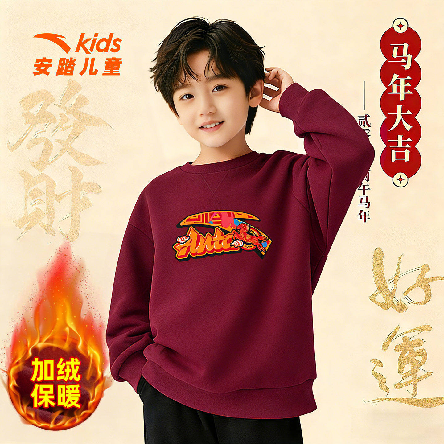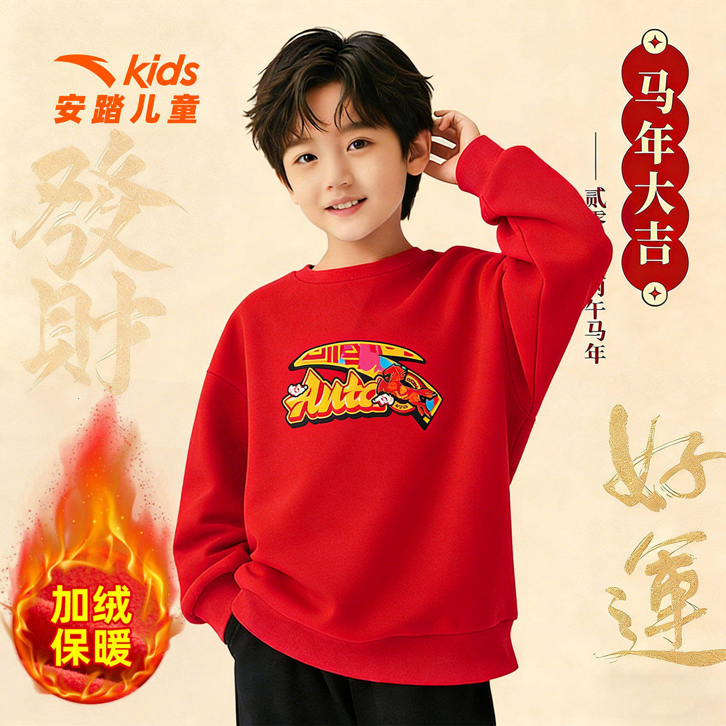 安踏儿童红色加绒卫衣男童2026春季新款本命年衣服休闲圆领套头衫