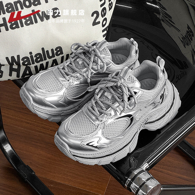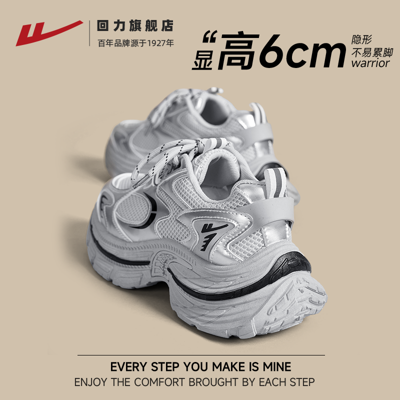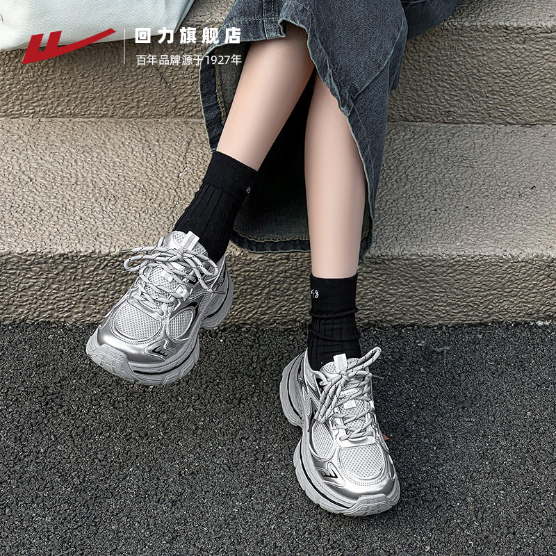回力厚底老爹鞋女款2026春新款增高轻便银色加绒百搭休闲运动鞋子