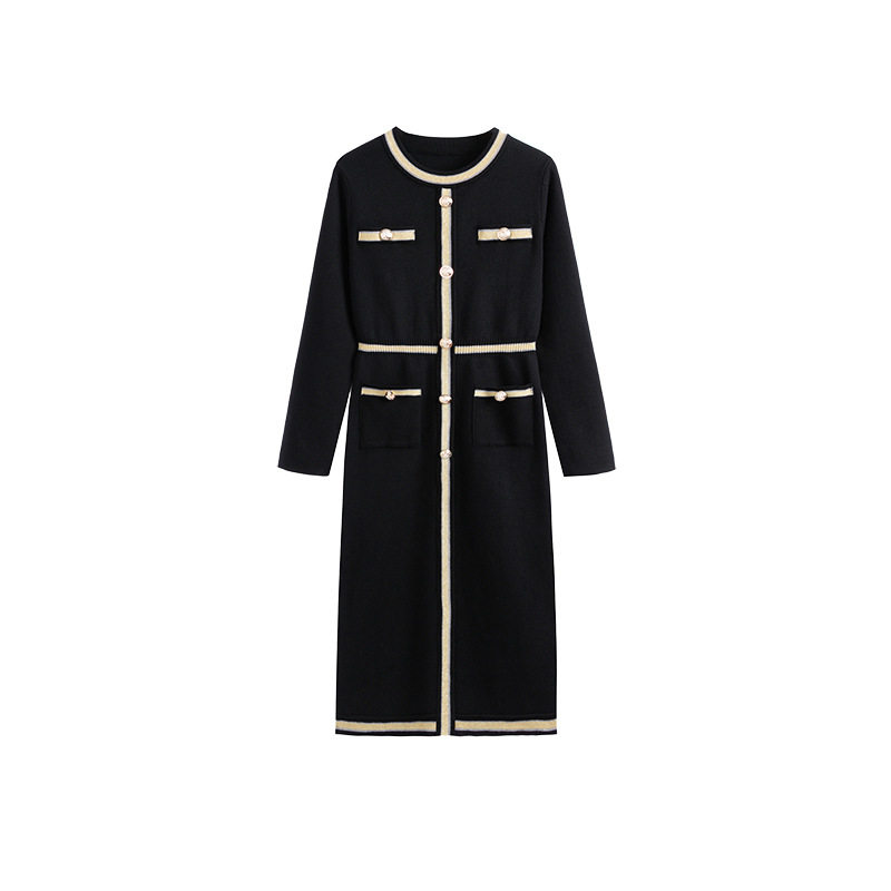 小香风长款修身针织连衣裙女2025秋冬季新款长袖打底赫本小黑裙子