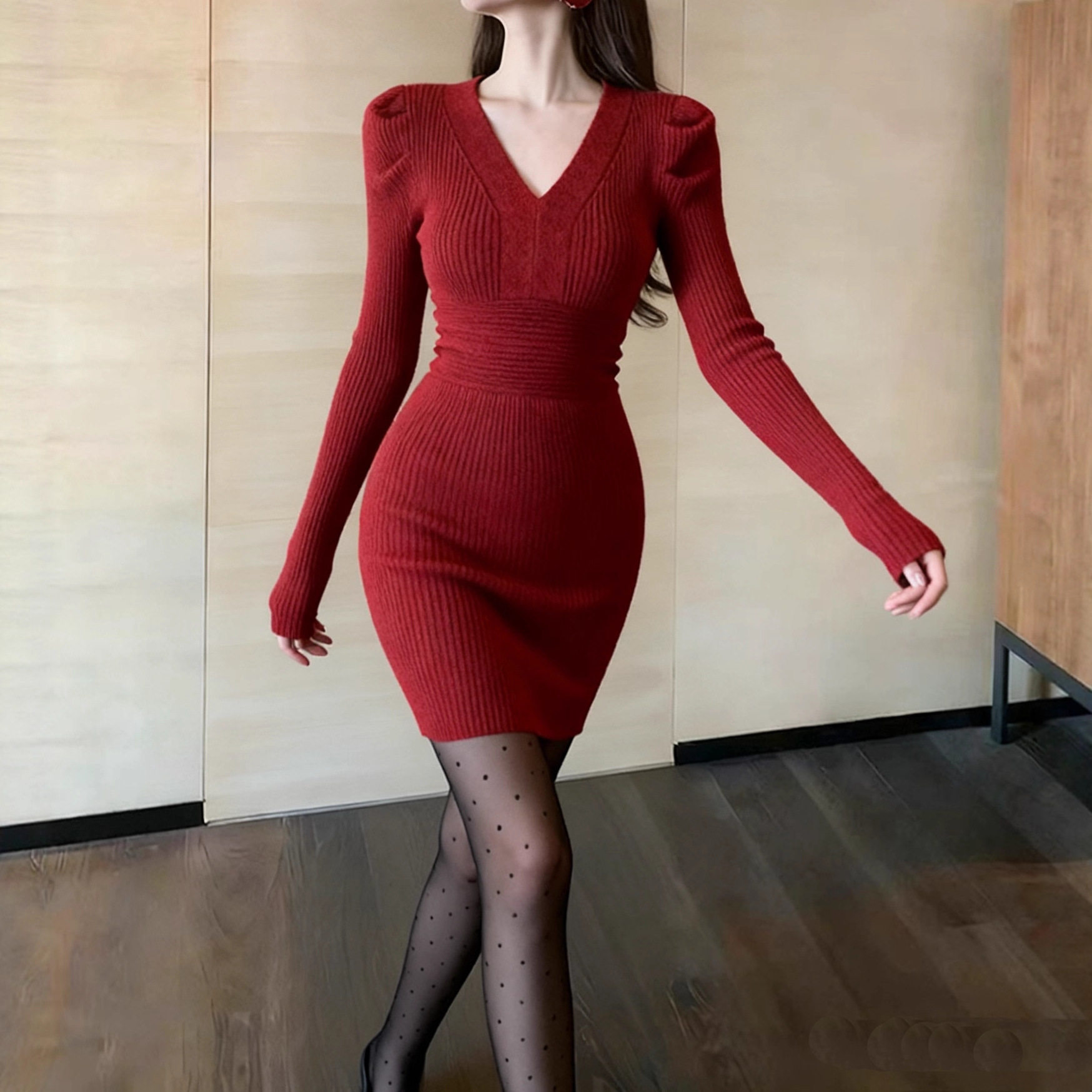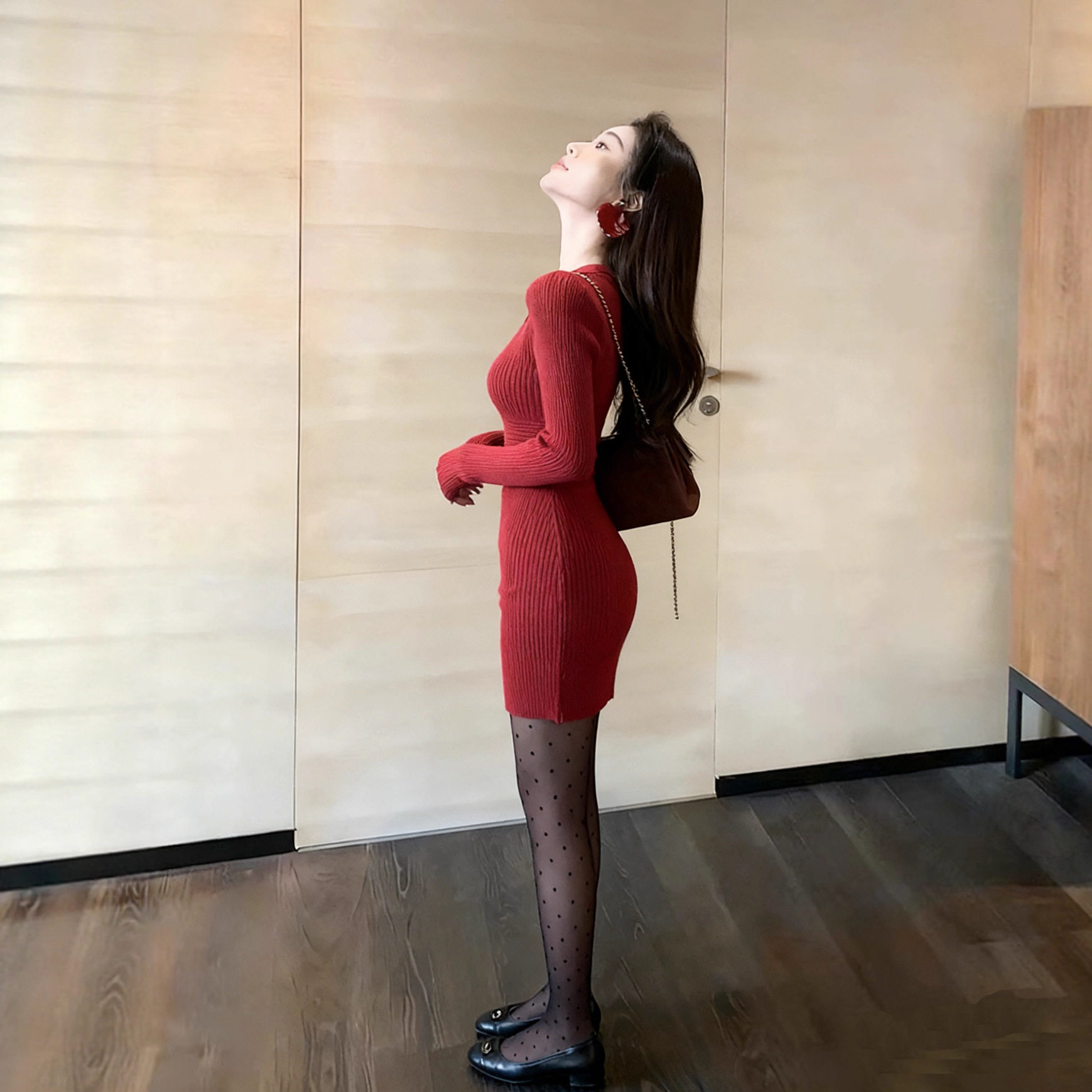 巨好看的秋冬裙子轻奢高级感小个子大方得体红色打底针织连衣裙女