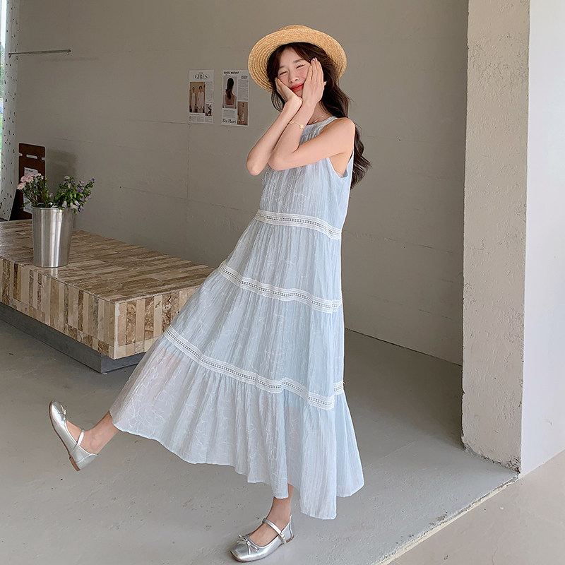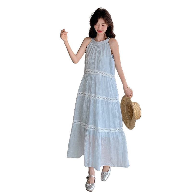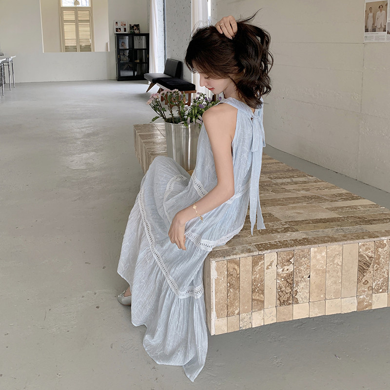 蓝色度假风挂脖系带连衣裙春装女2026年新款轻奢高级感连衣裙夏季
