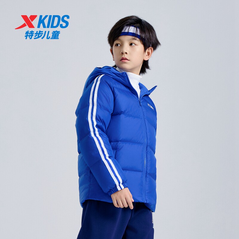 特步童装儿童厚款条纹羽绒服2026秋冬季新款男童保暖外套大童衣服