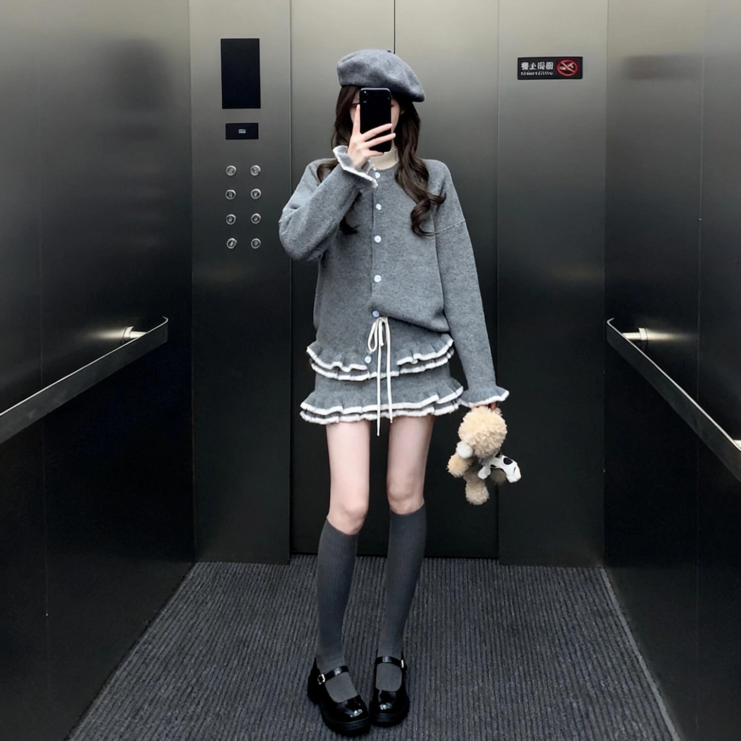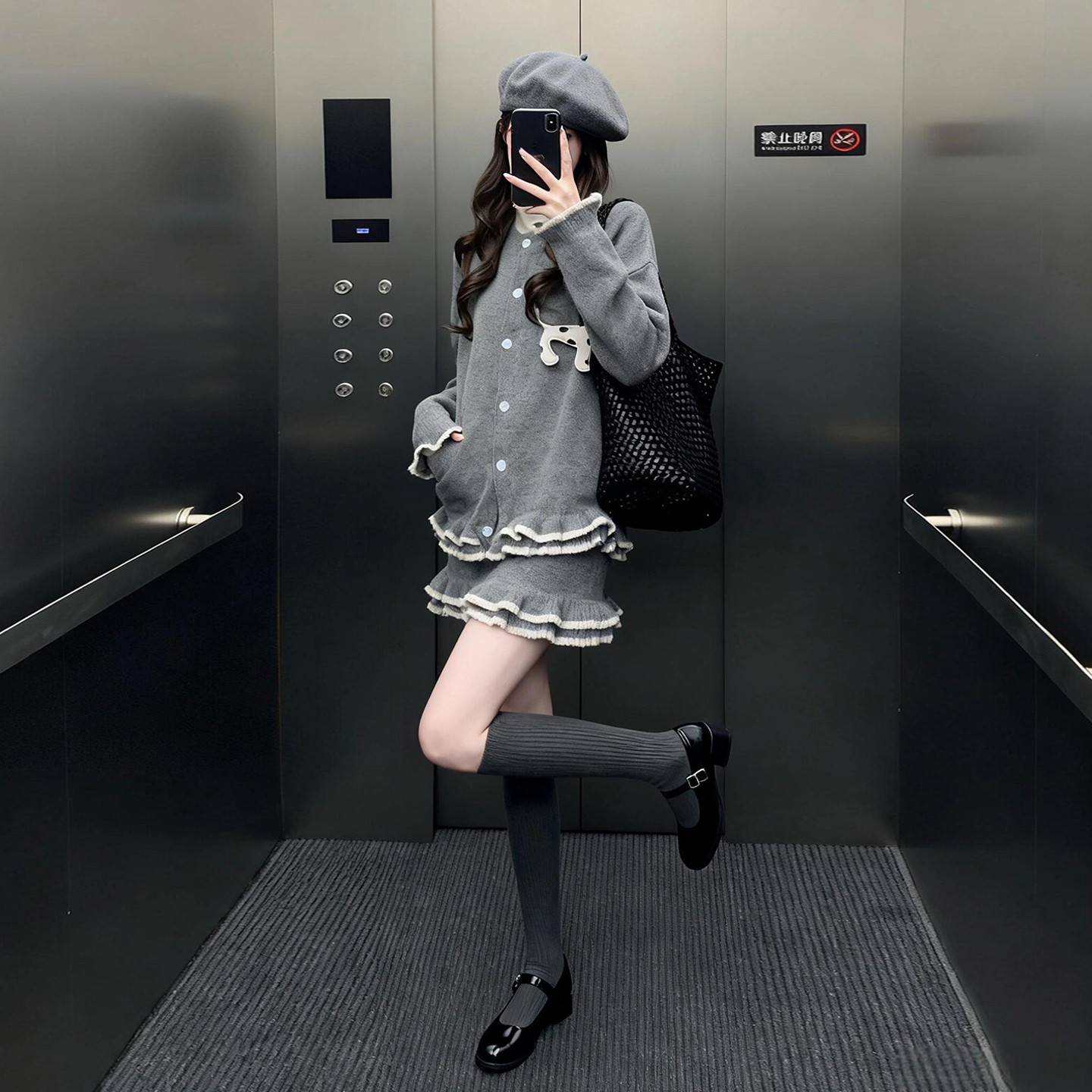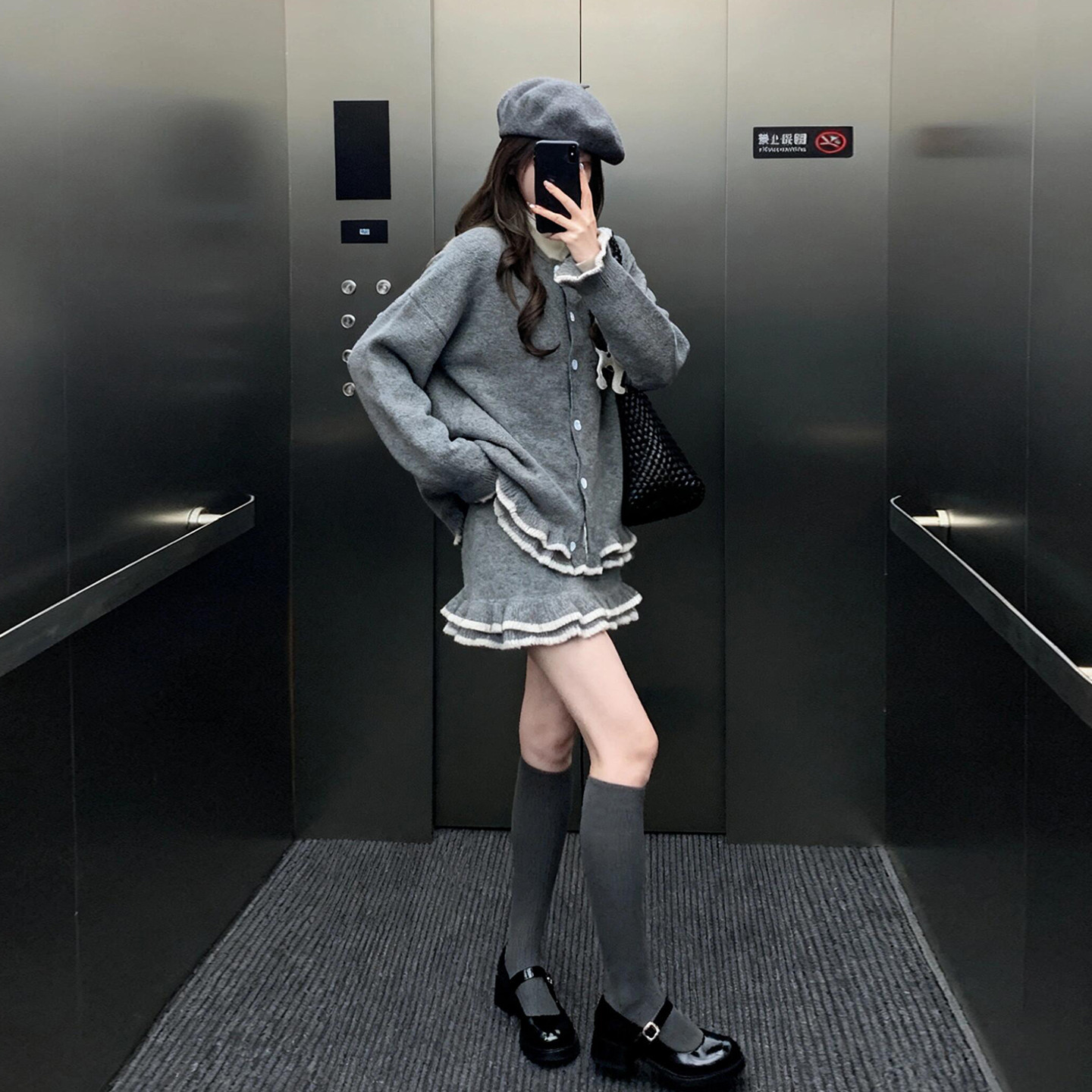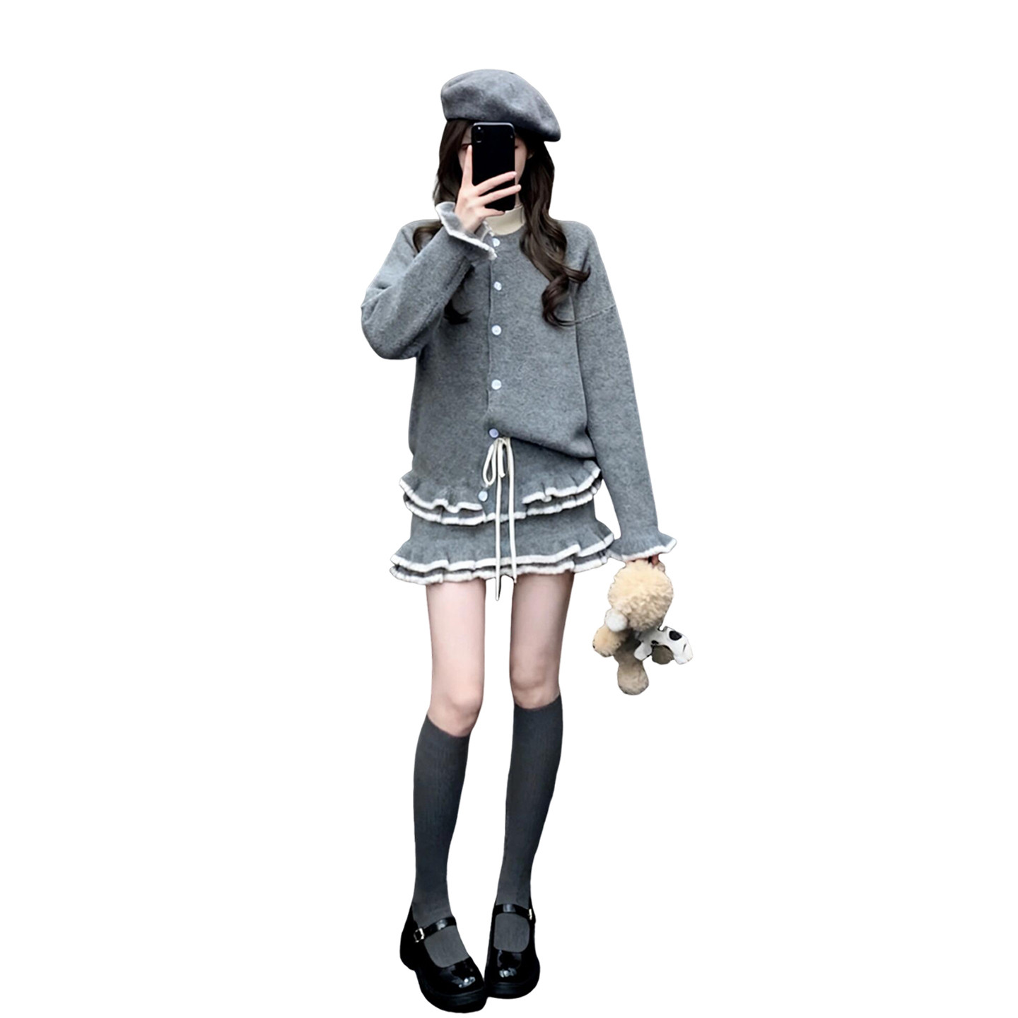 chic韩系穿搭小香风长袖针织连衣裙女秋冬加厚木耳边设计修身短裙