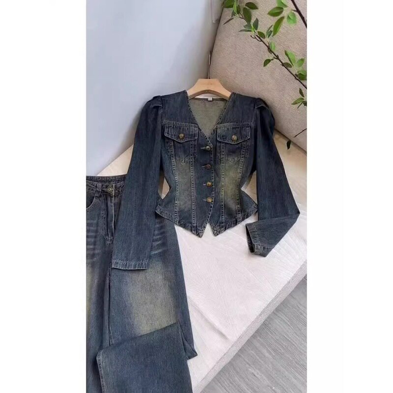 2026早春秋冬装搭配一整套网红炸街水洗蓝牛仔两件套装裤新款女装